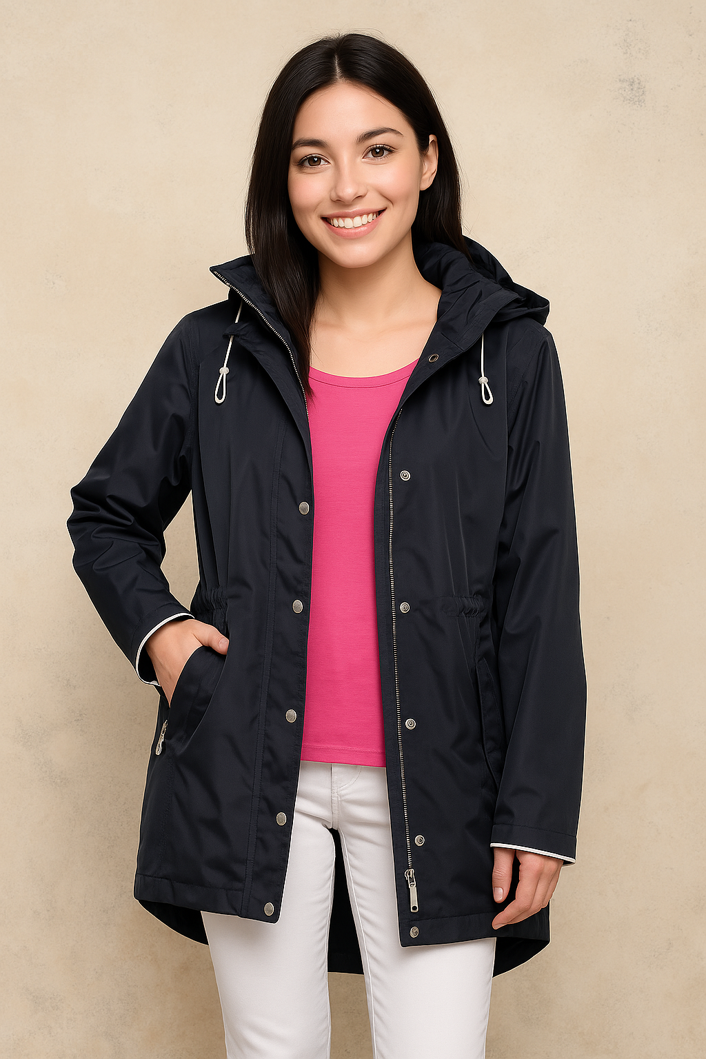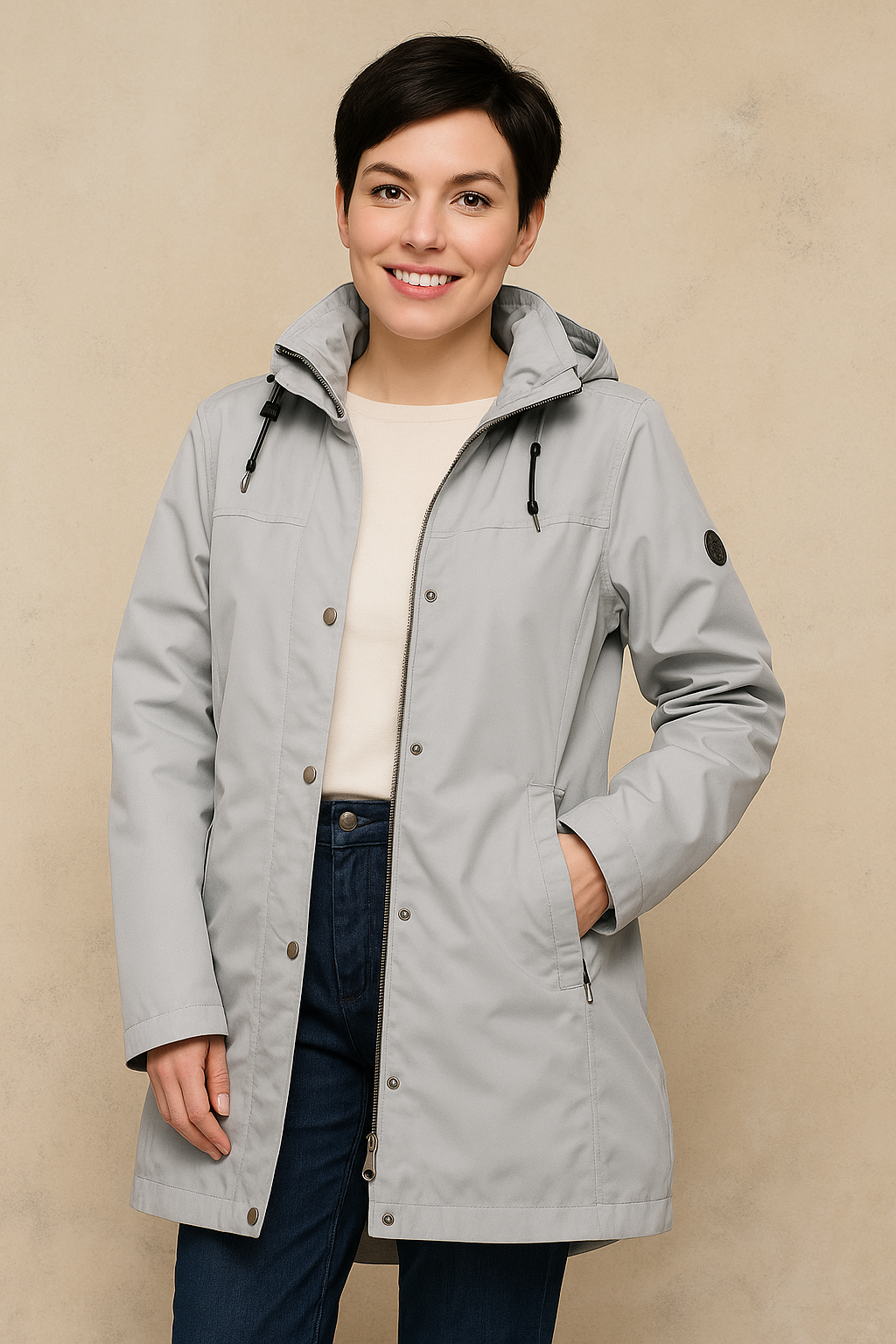 Frandsen - Oanez léttur regnjakki með hettu sem er hægt að renna af. Renndur og smelltur að framan, með góðum hliðarvösum, einum innan á vasa, stillanlegt teygjuband í mitti, aðeins síðari að aftan. Jakkinn er vind- og vatnsheldur upp að 3000 mm og andar.