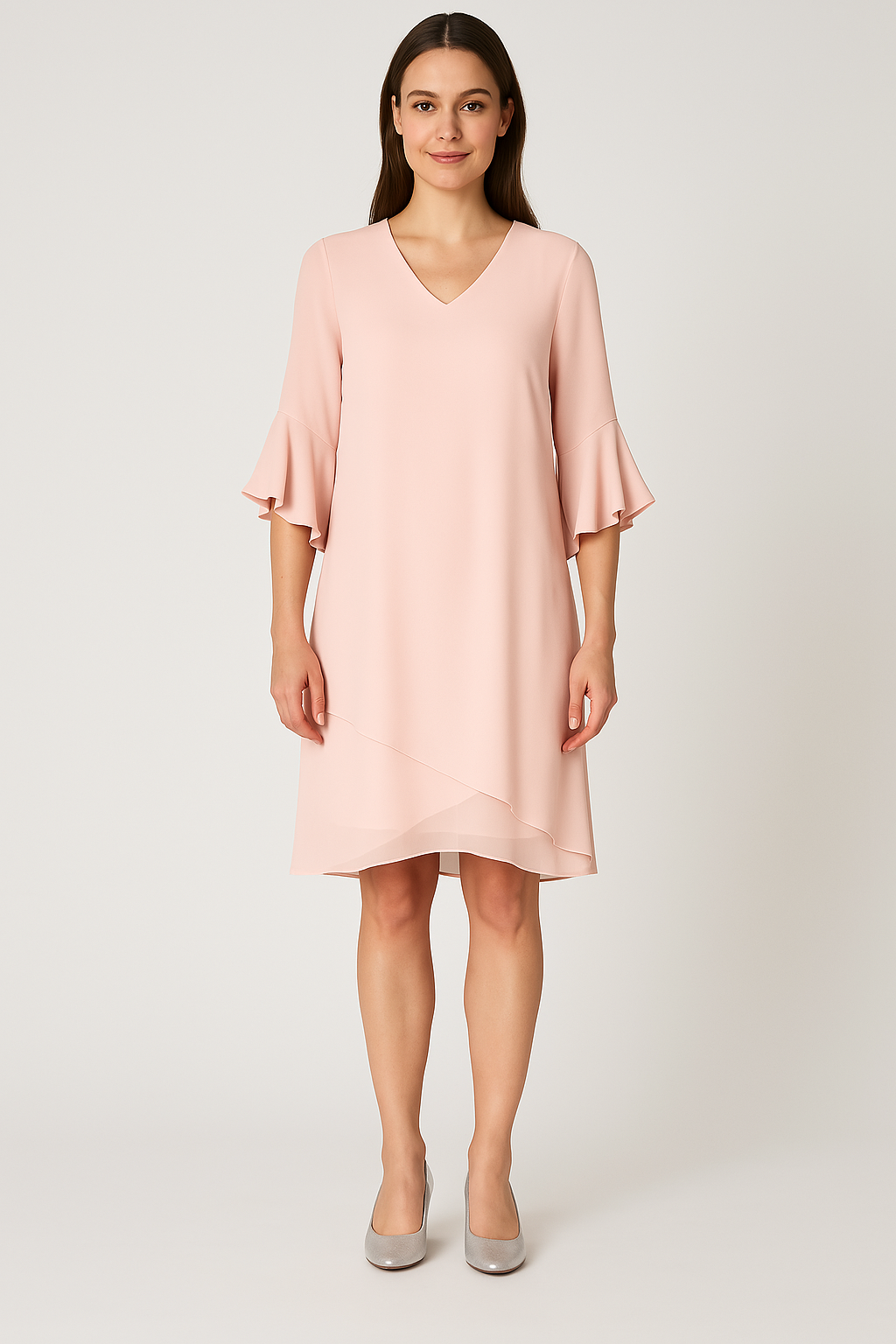 Godske - Trianna látlaus fínn sparilegur kjóll með hálf gegnsæjar shiffon kvartermar með tvöfaldri pífu. Þunnt tvöfalt shiffon efni sem krossast að framan ásamt áföstum undirkjól, V-hálmáli og rennilás að aftan.