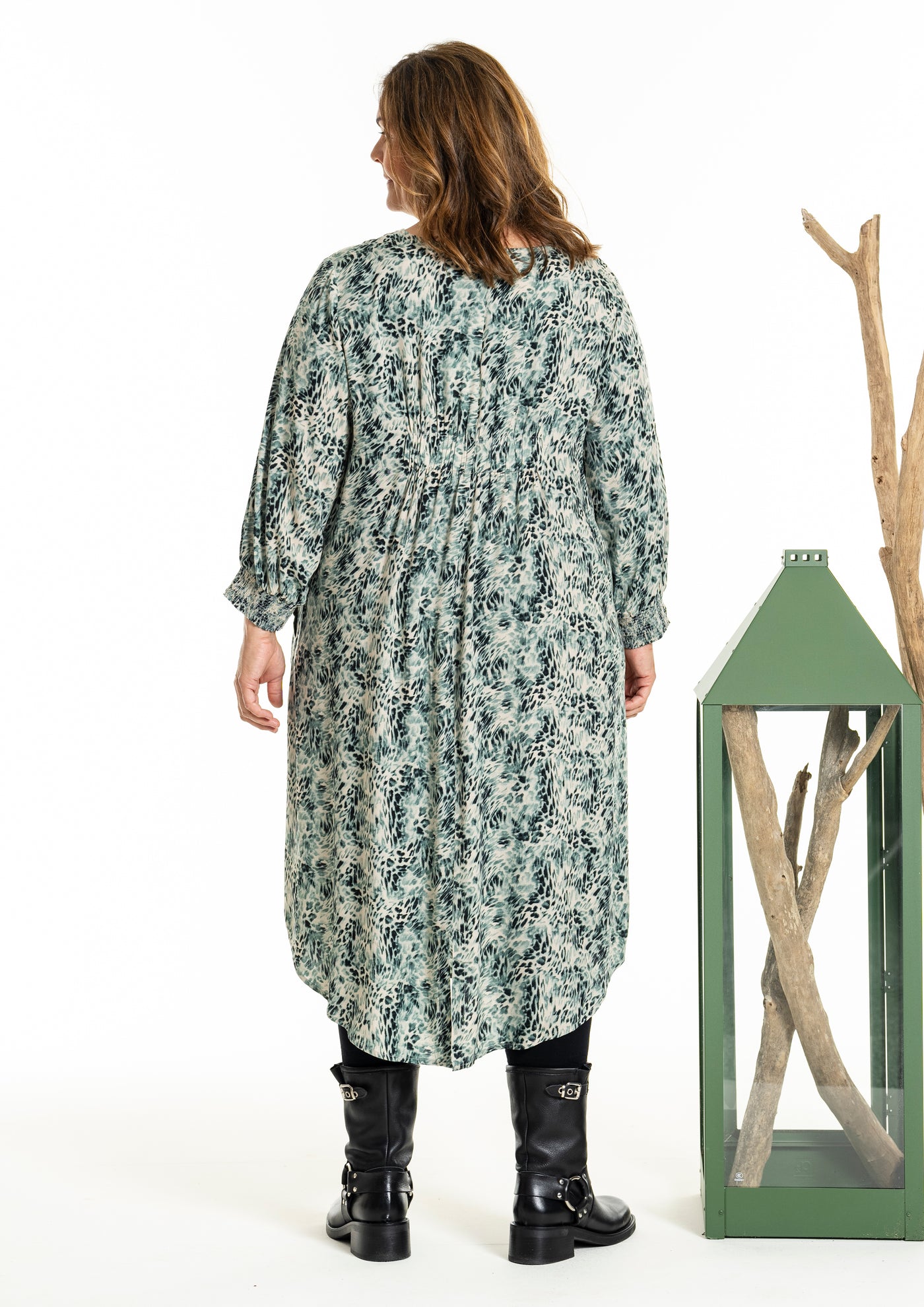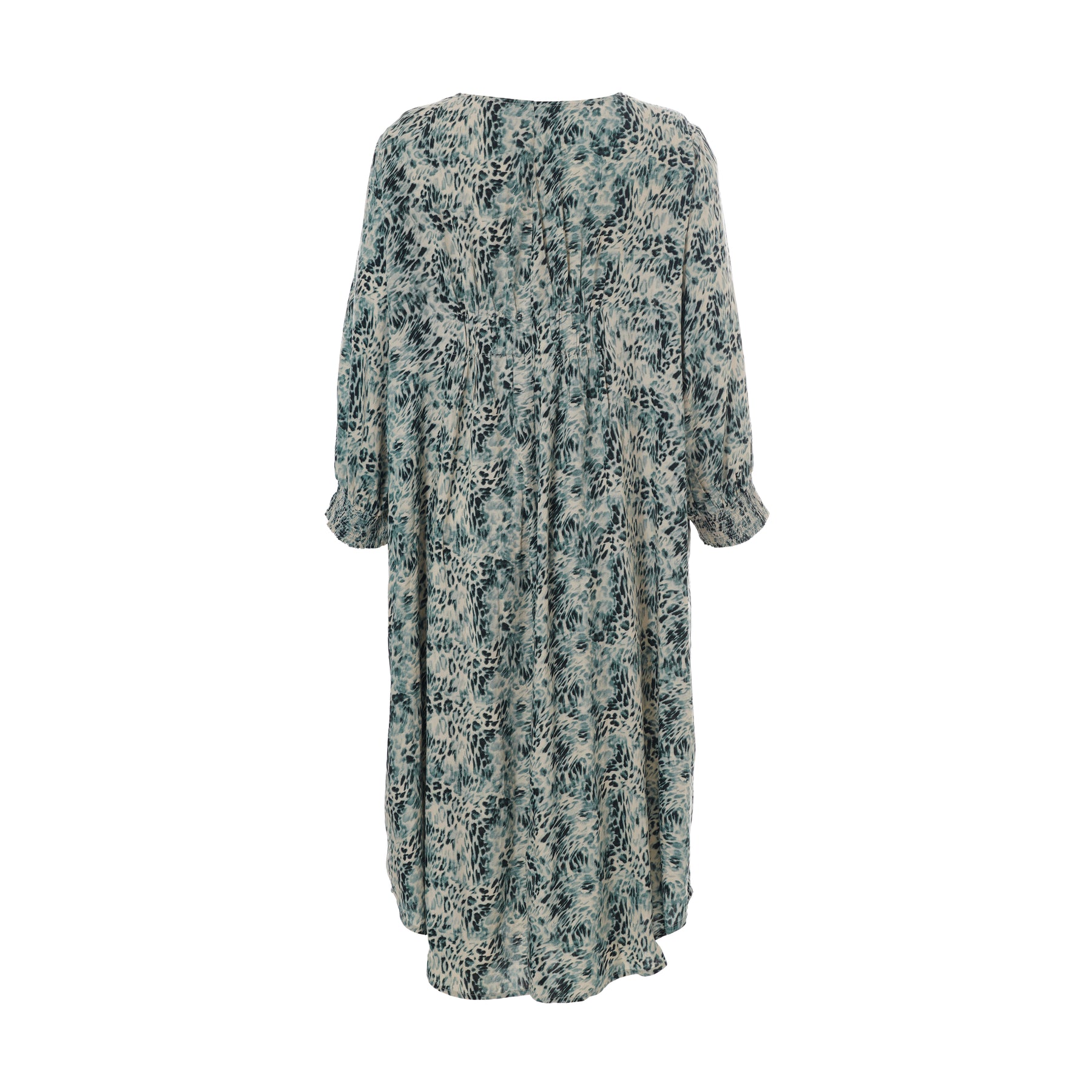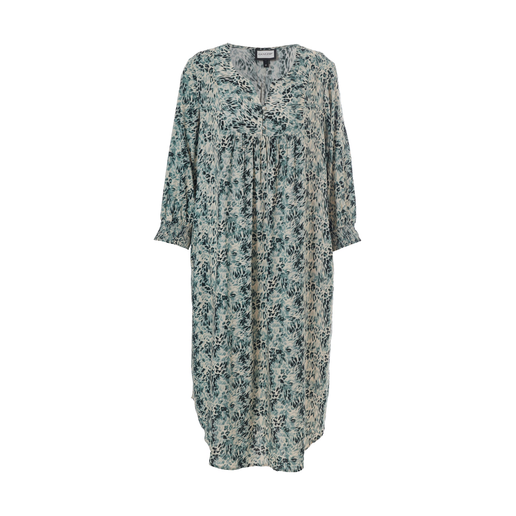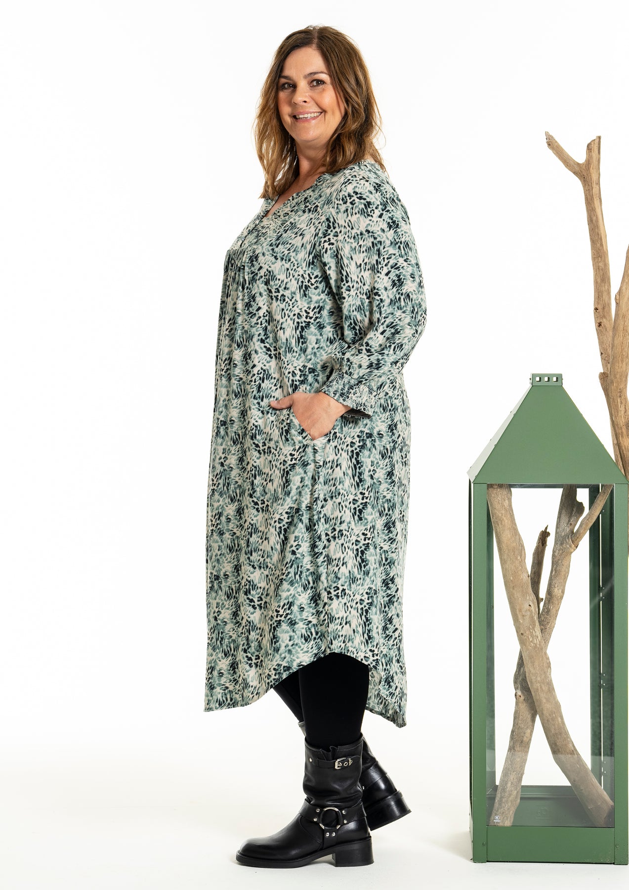 Gozzip - Alice flottur og léttur kjóll með dýramynstri. V-hálsmál sem endar í þrem tölum, víðar kvartermar sem eru teknar saman niðri með teygju, góðir hliðarvasa, rúnaður að neðan, breið teygja með rykkingu að aftan.