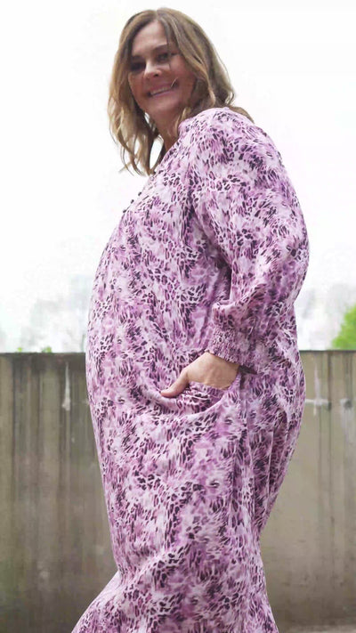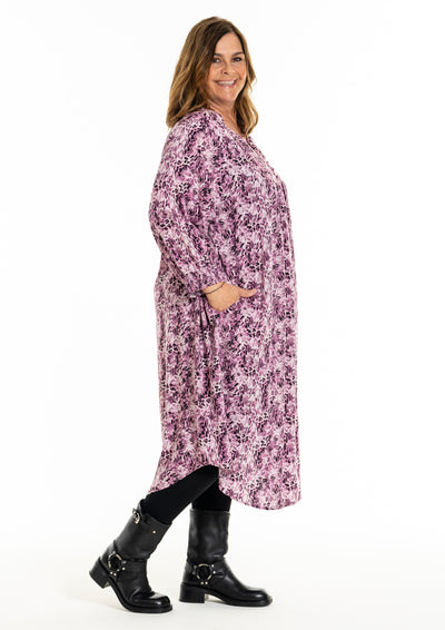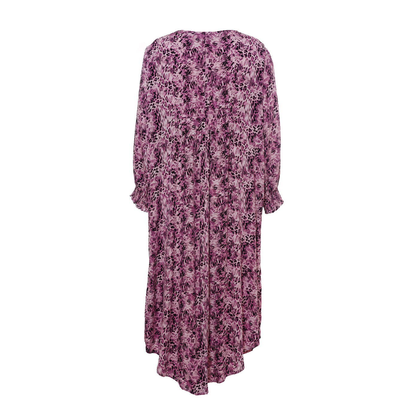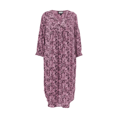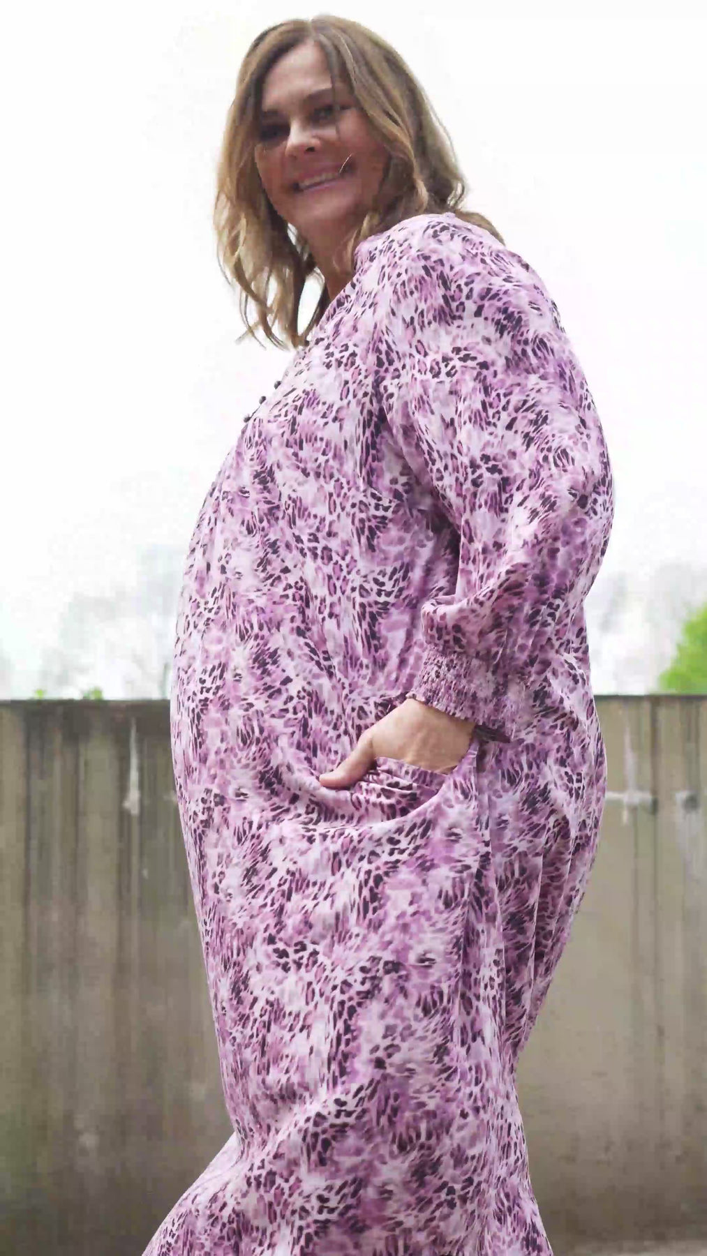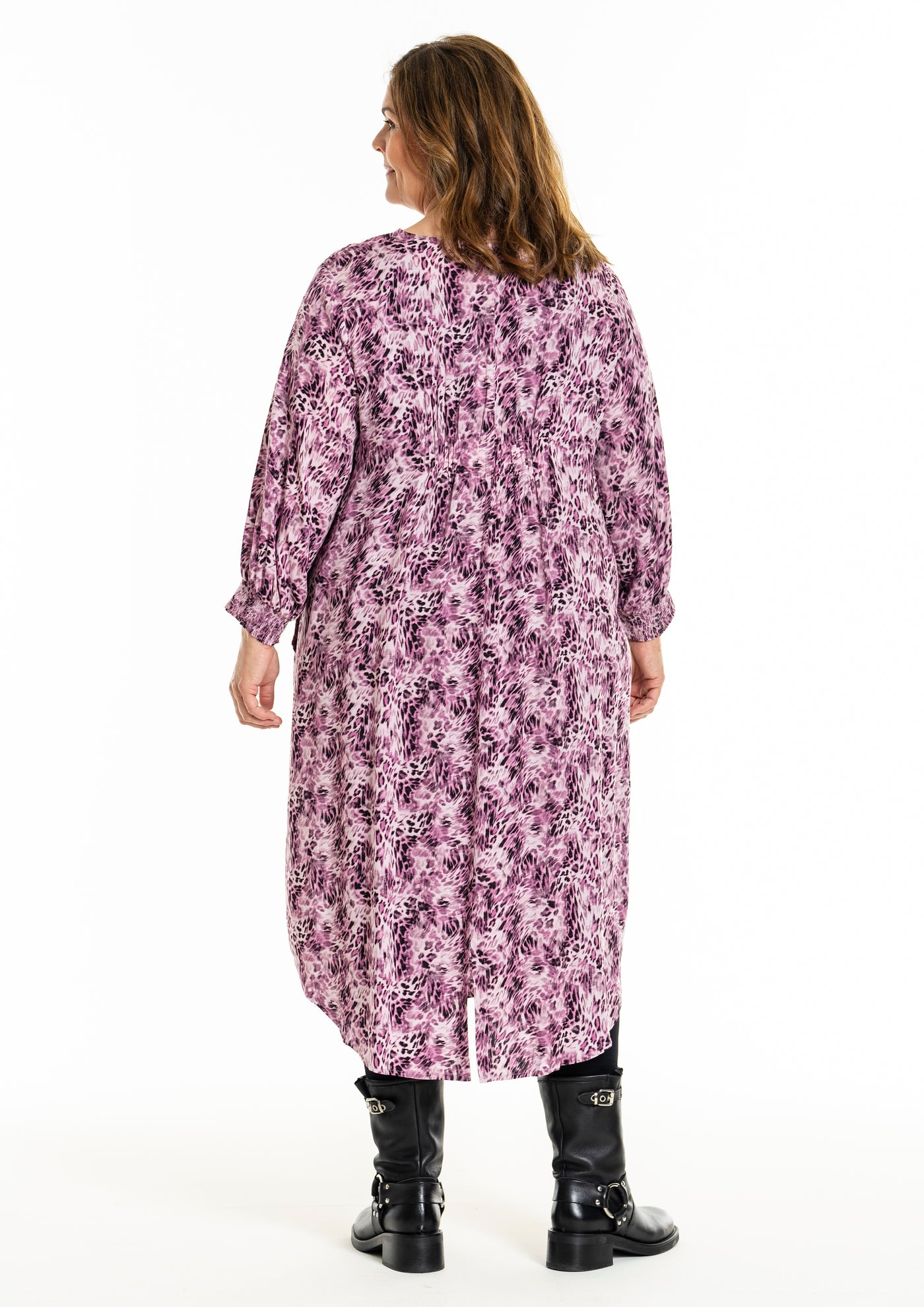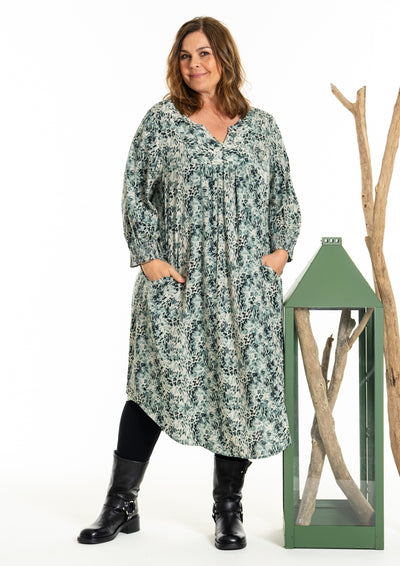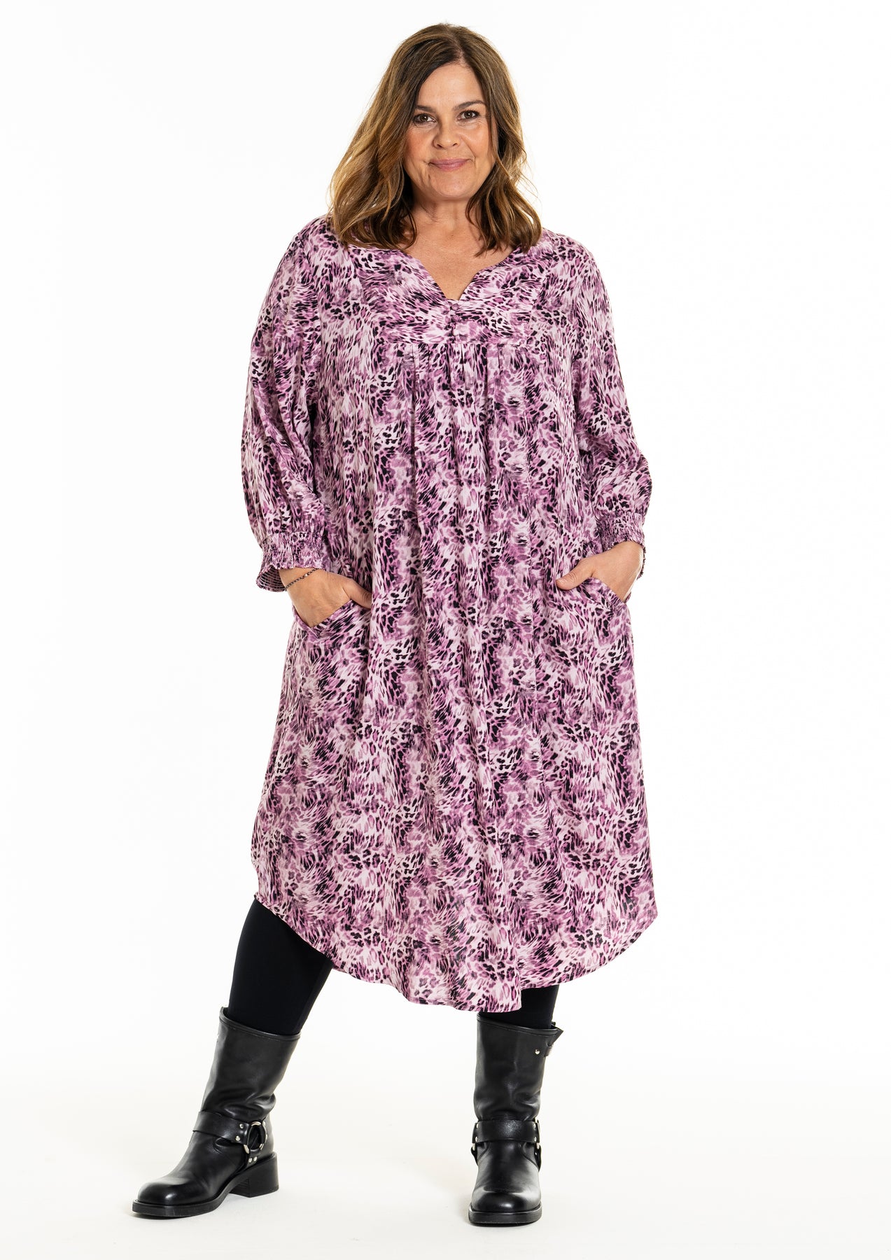 Gozzip - Alice flottur og léttur kjóll með dýramynstri. V-hálsmál sem endar í þrem tölum, víðar kvartermar sem eru teknar saman niðri með teygju, góðir hliðarvasa, rúnaður að neðan, breið teygja með rykkingu að aftan.