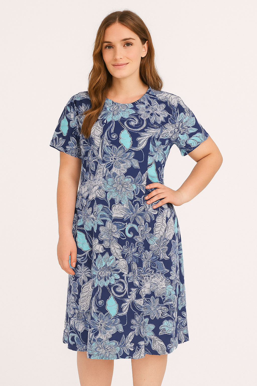Bassini - Isabella, kjóll með blómamynstri, rúnuðu hálsmáli, A-sniði og stuttum ermum. Dökkblár grunnur með lituðu mynstri í bláu, brúnu og gráu. Í hvítu efni eru hvítar smágerðar upphleyptar doppur sem gefa efninu skemmtilega vídd.