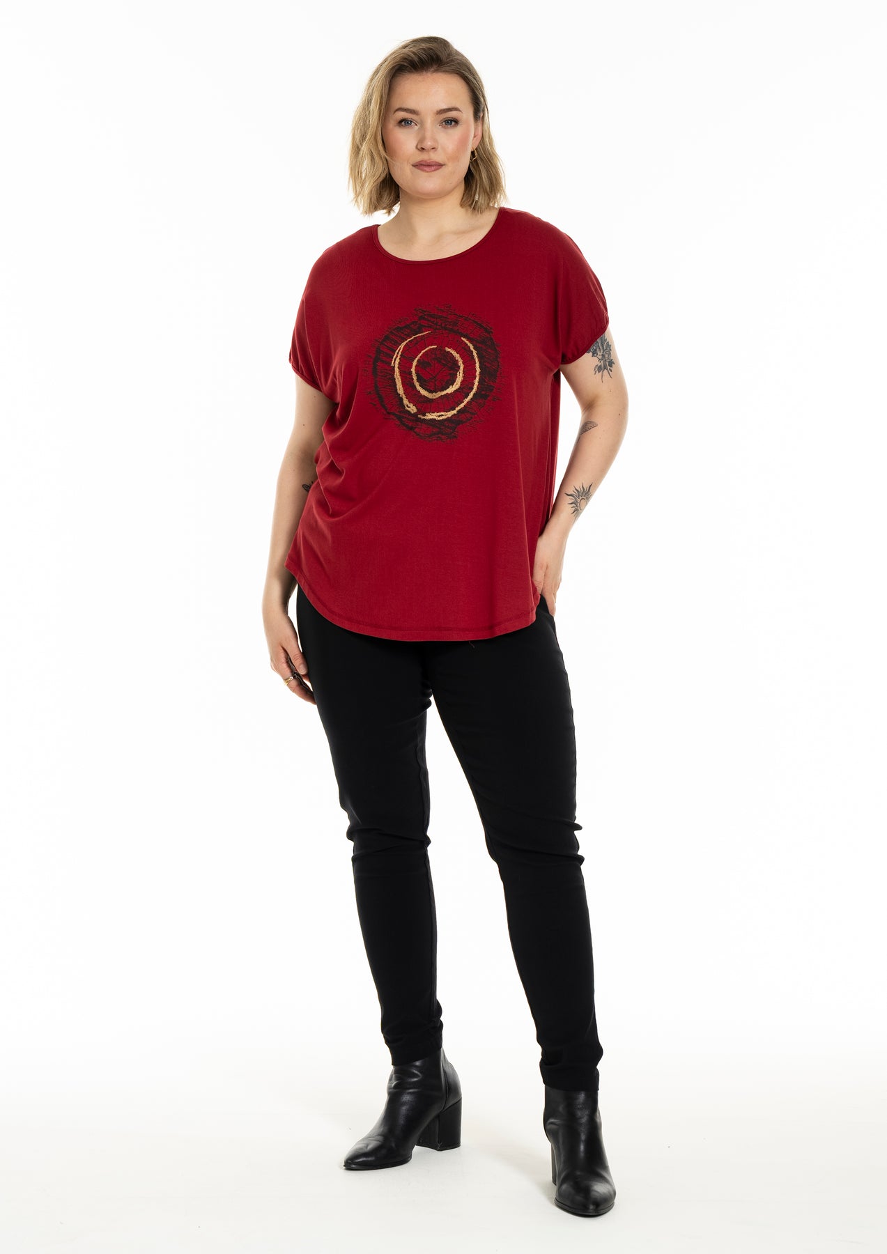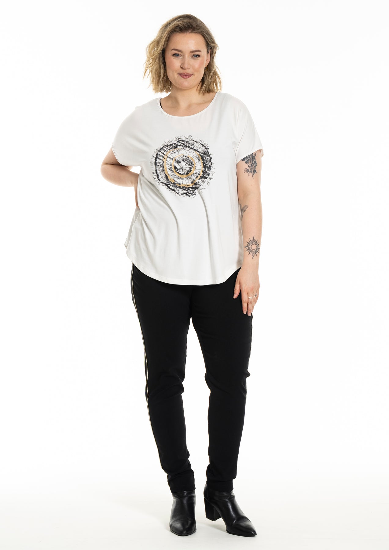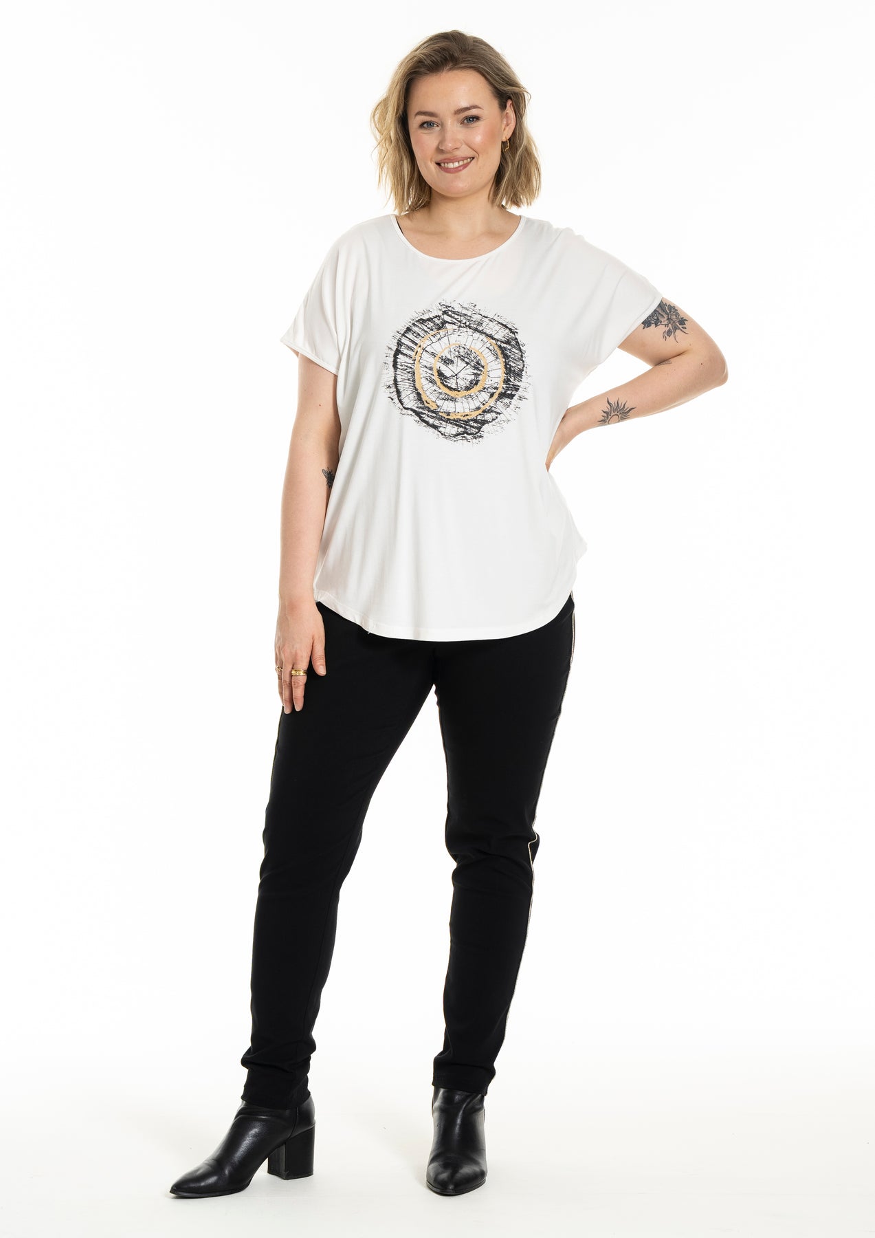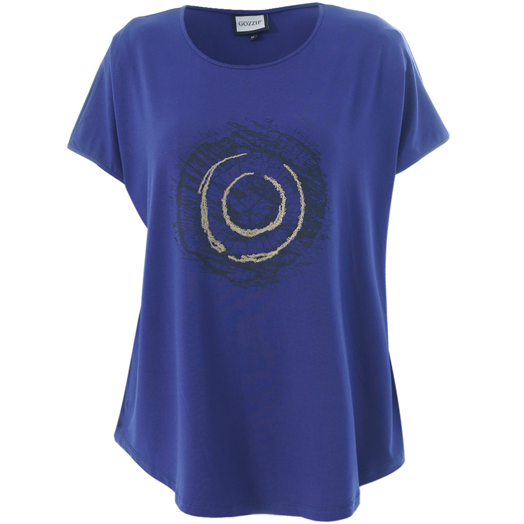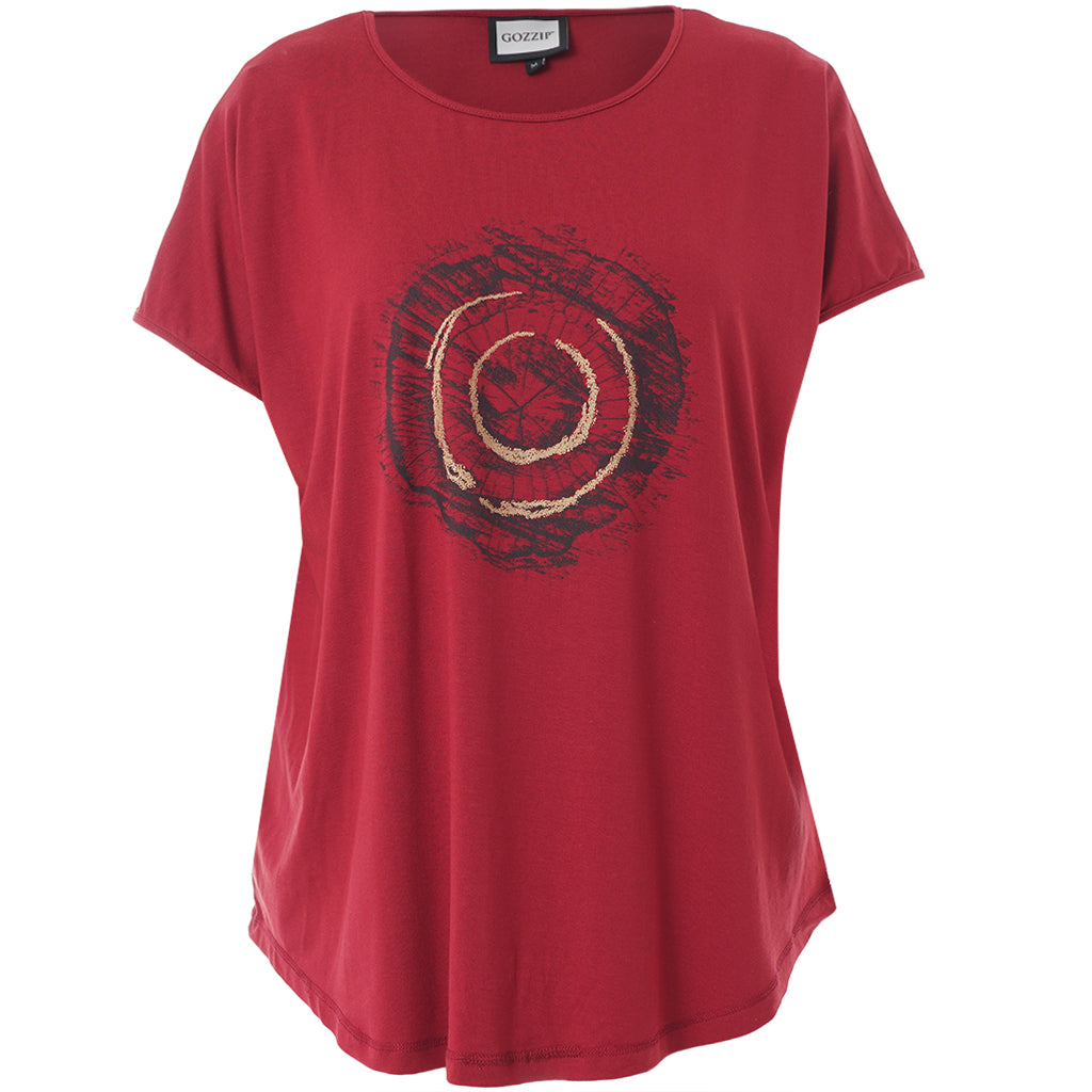 Gozzip - Gitte stuttermabolur með prenti sem minnir á snið í tréhring með gylltum hringjum í miðju. Hlýtt og stílhreint mynstur. Bolurinn er úr góðu og þægilegu viskosefni, rúnað hálsmál, rúnaður að neðan og örlítið meiri sídd að aftan.