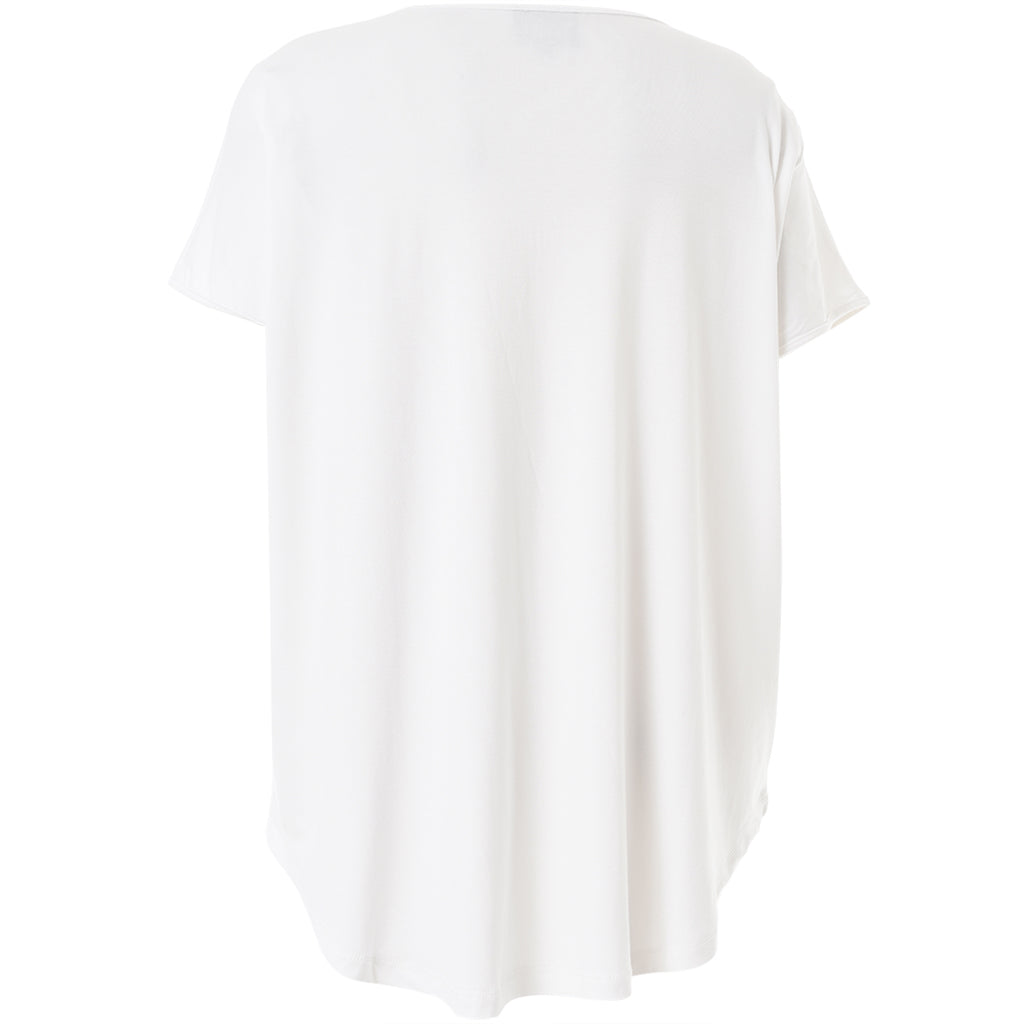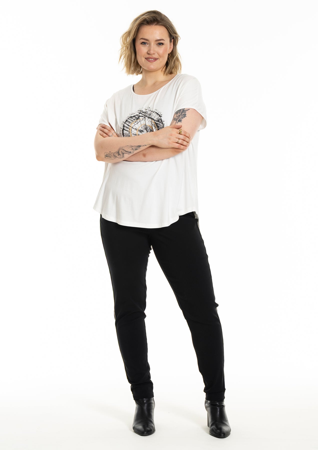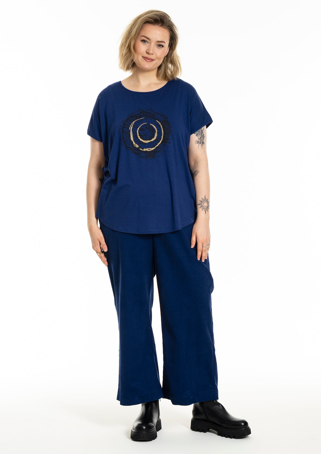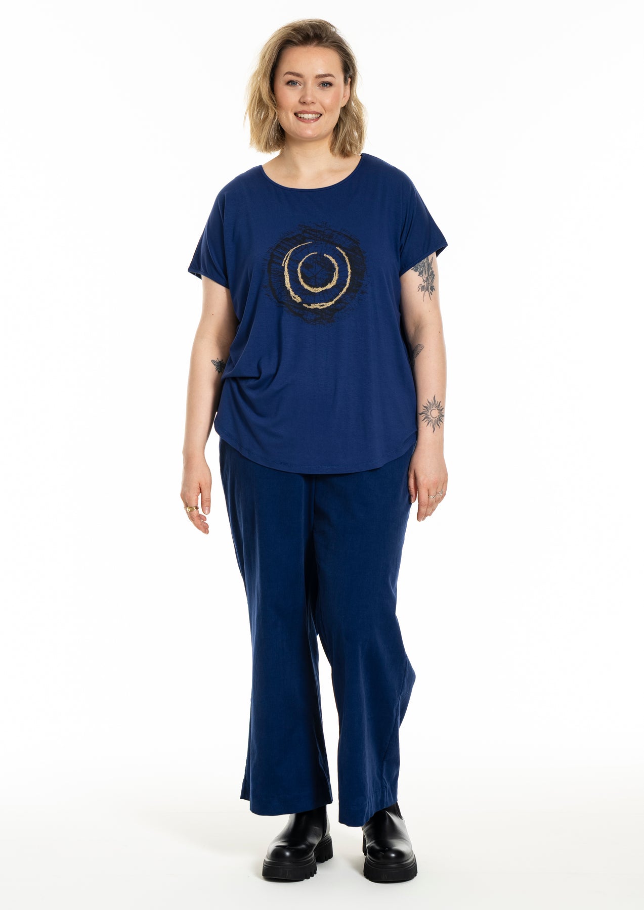 Gozzip - Gitte stuttermabolur með prenti sem minnir á snið í tréhring með gylltum hringjum í miðju. Hlýtt og stílhreint mynstur. Bolurinn er úr góðu og þægilegu viskosefni, rúnað hálsmál, rúnaður að neðan og örlítið meiri sídd að aftan.