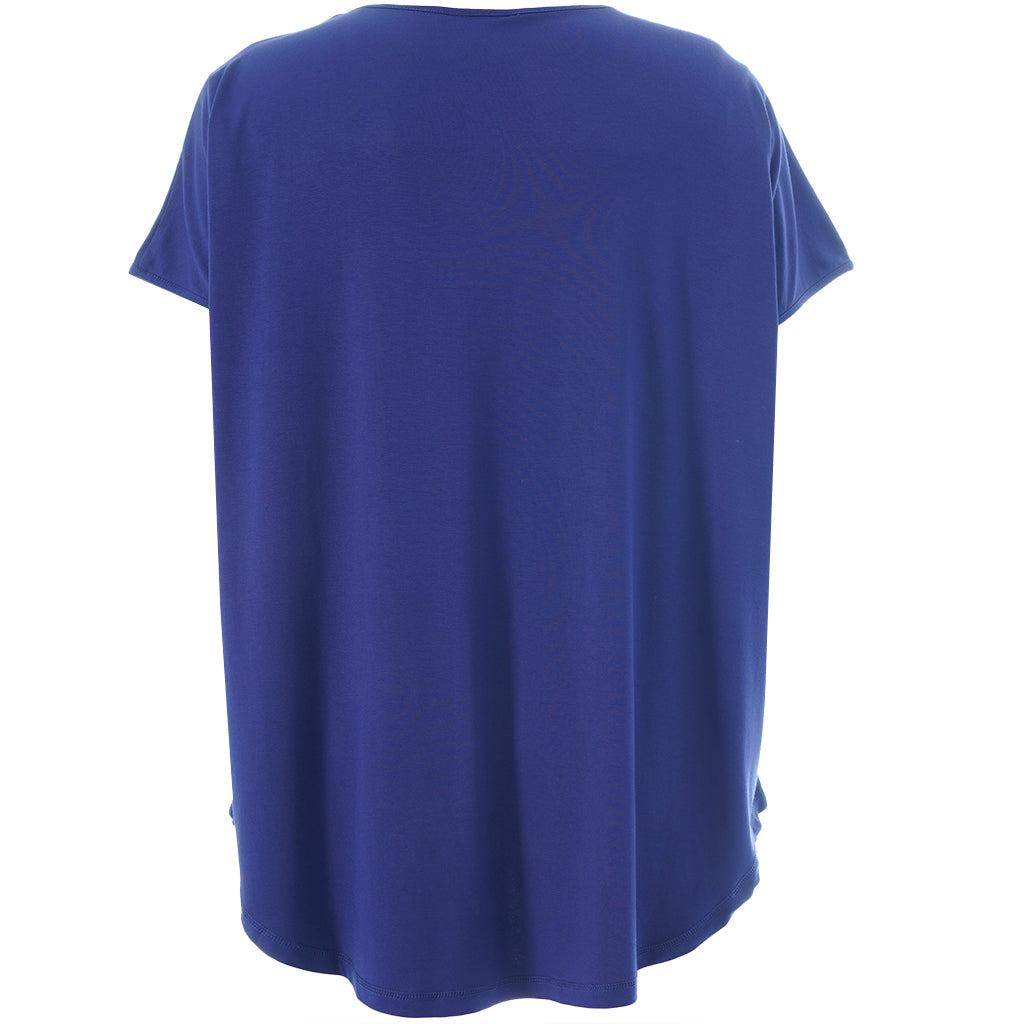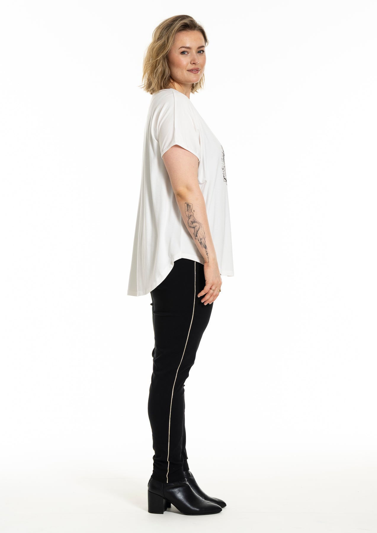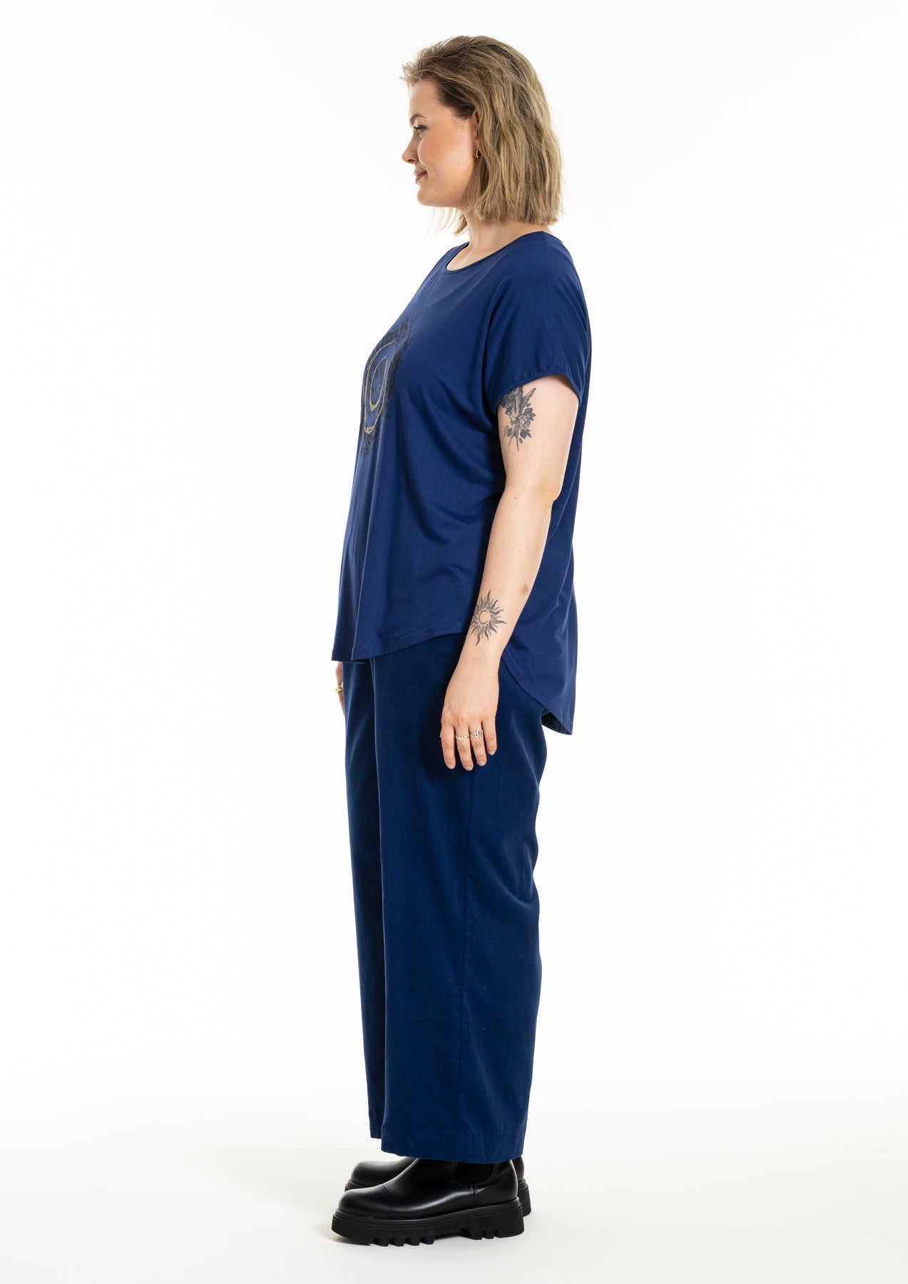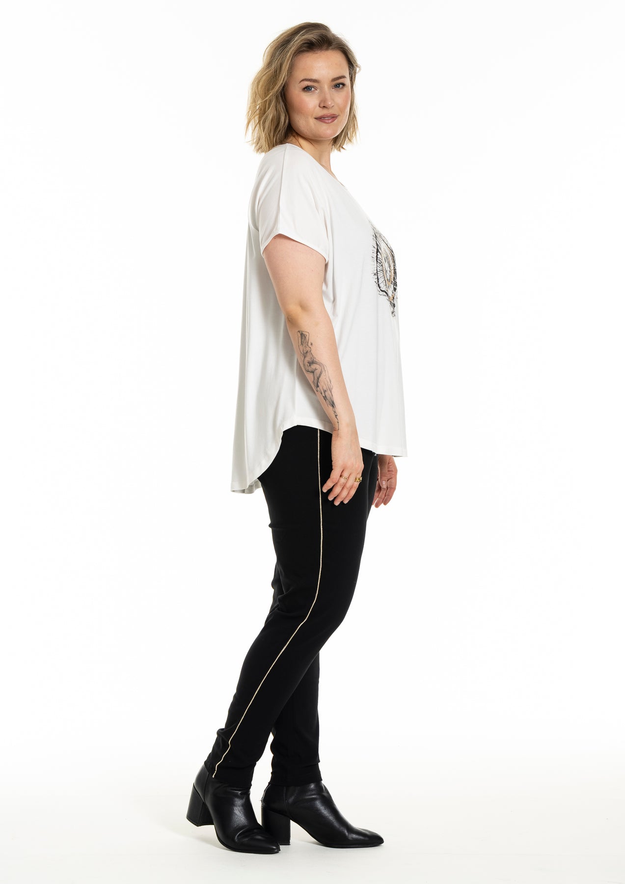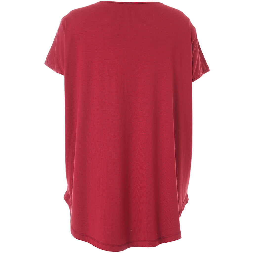 Gozzip - Gitte stuttermabolur með prenti sem minnir á snið í tréhring með gylltum hringjum í miðju. Hlýtt og stílhreint mynstur. Bolurinn er úr góðu og þægilegu viskosefni, rúnað hálsmál, rúnaður að neðan og örlítið meiri sídd að aftan.