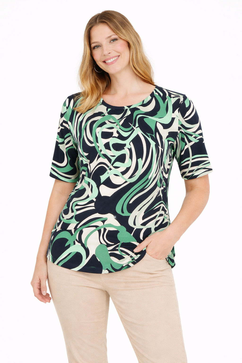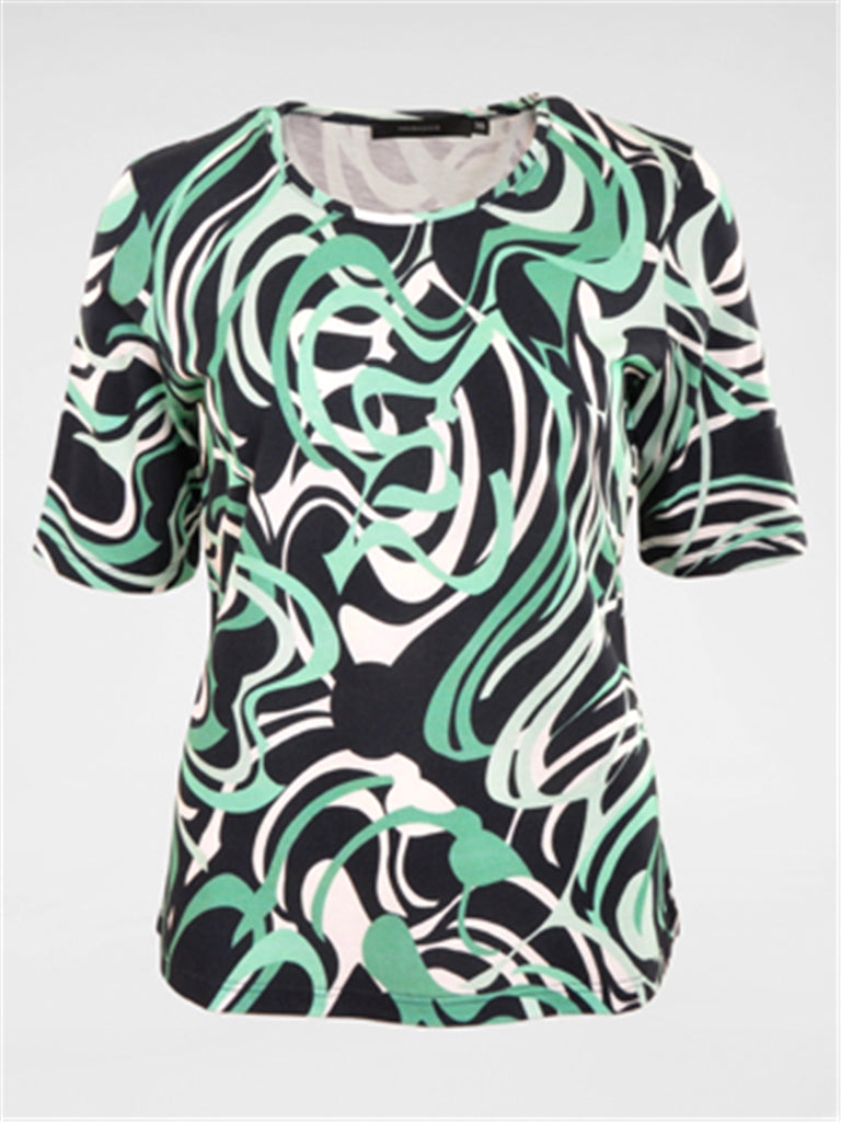 Navigazione - Abbie, mynstraður stuttermabolur úr 100% lífrænu efni með rúnuðu hálsmáli. Flottur hversdagsbolur sem passar vel við gallabuxur og treggings.