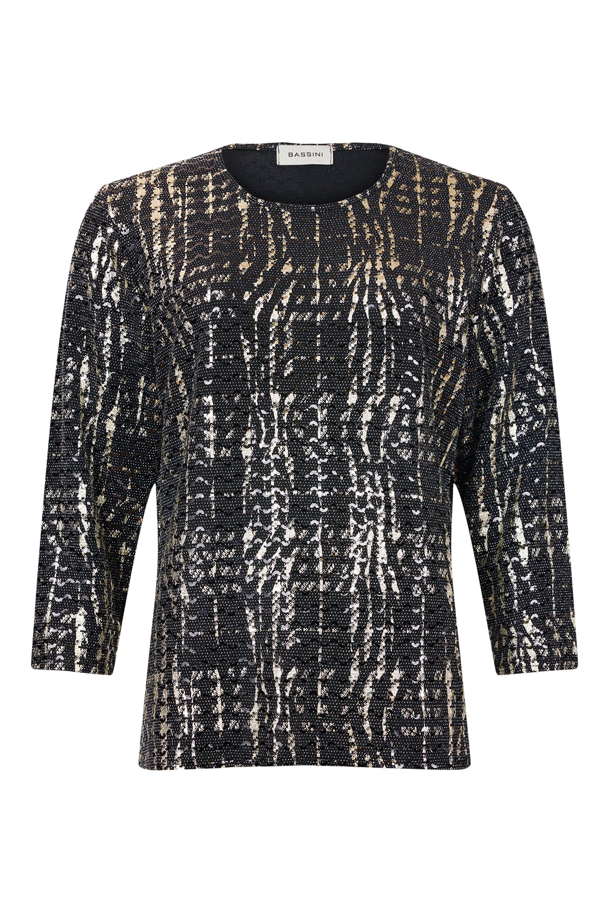 Bassini - Keyla mynstruð sparileg blússa með rúnuðu hálsmáli, kvartermum og smá klauf á hliðum. Létt og þægileg og hægt að vera í undir jakka eða peysu eða bara ein og sér.