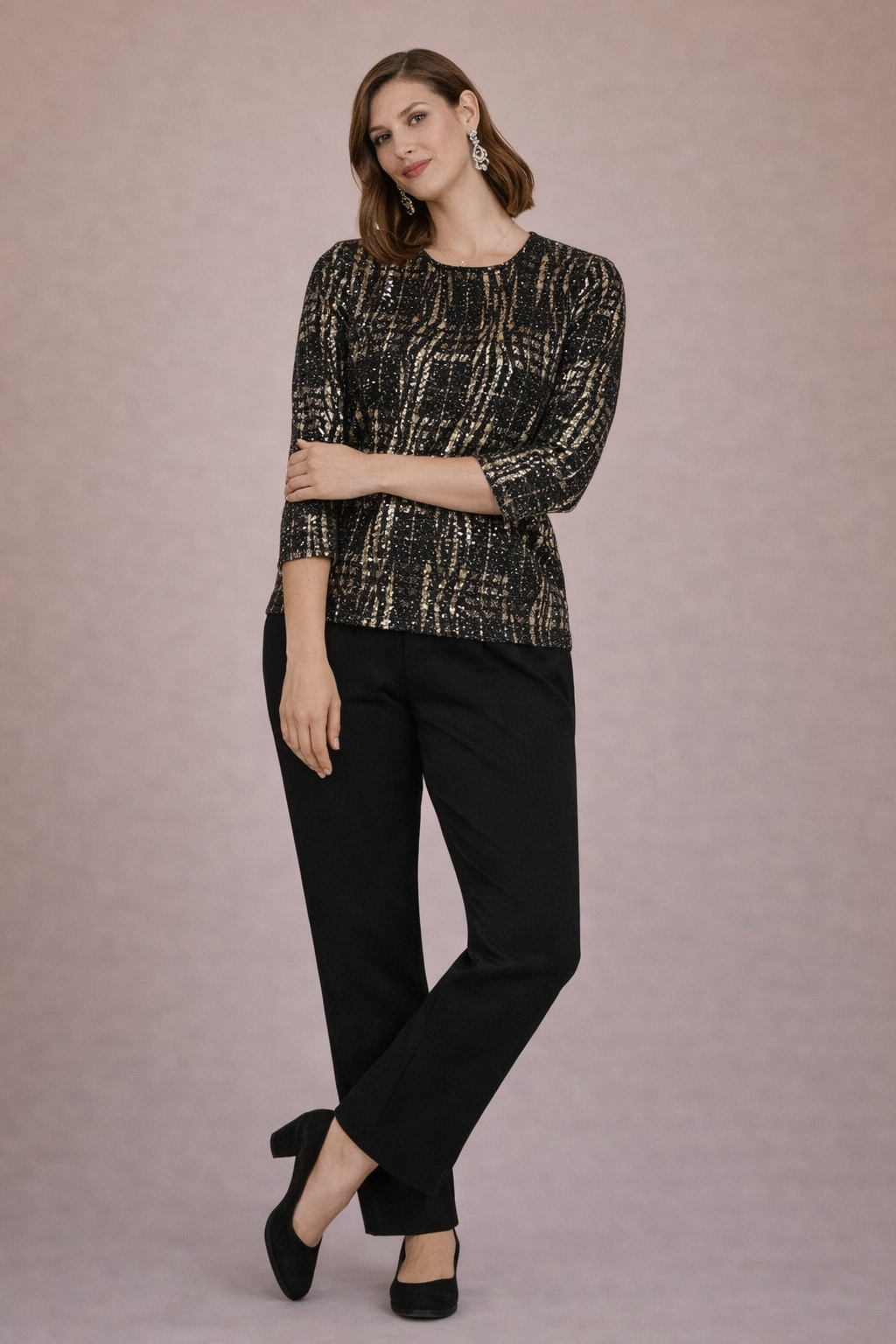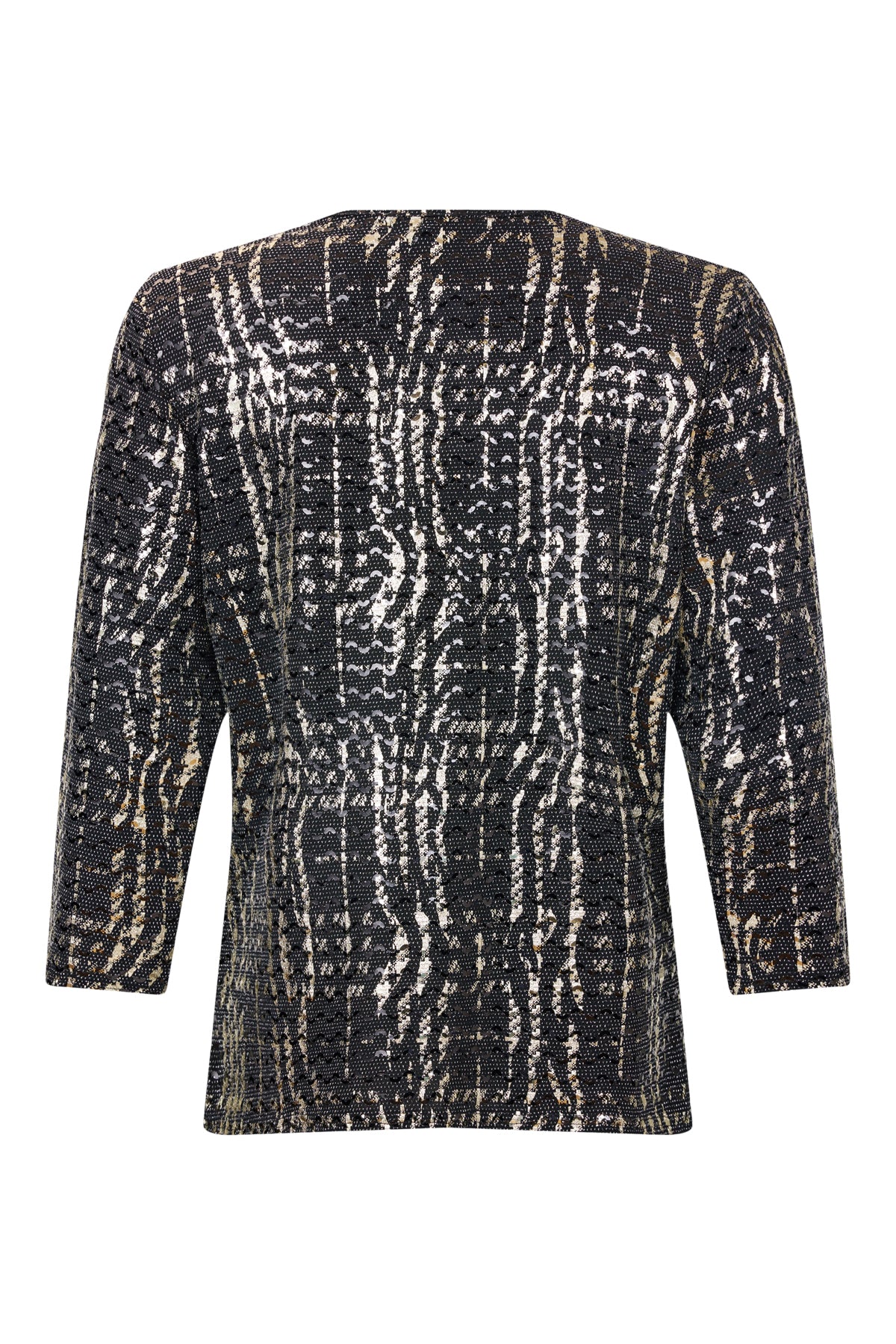 Svört í grunninn með gylltu mynstri og svörtum pallíettum.