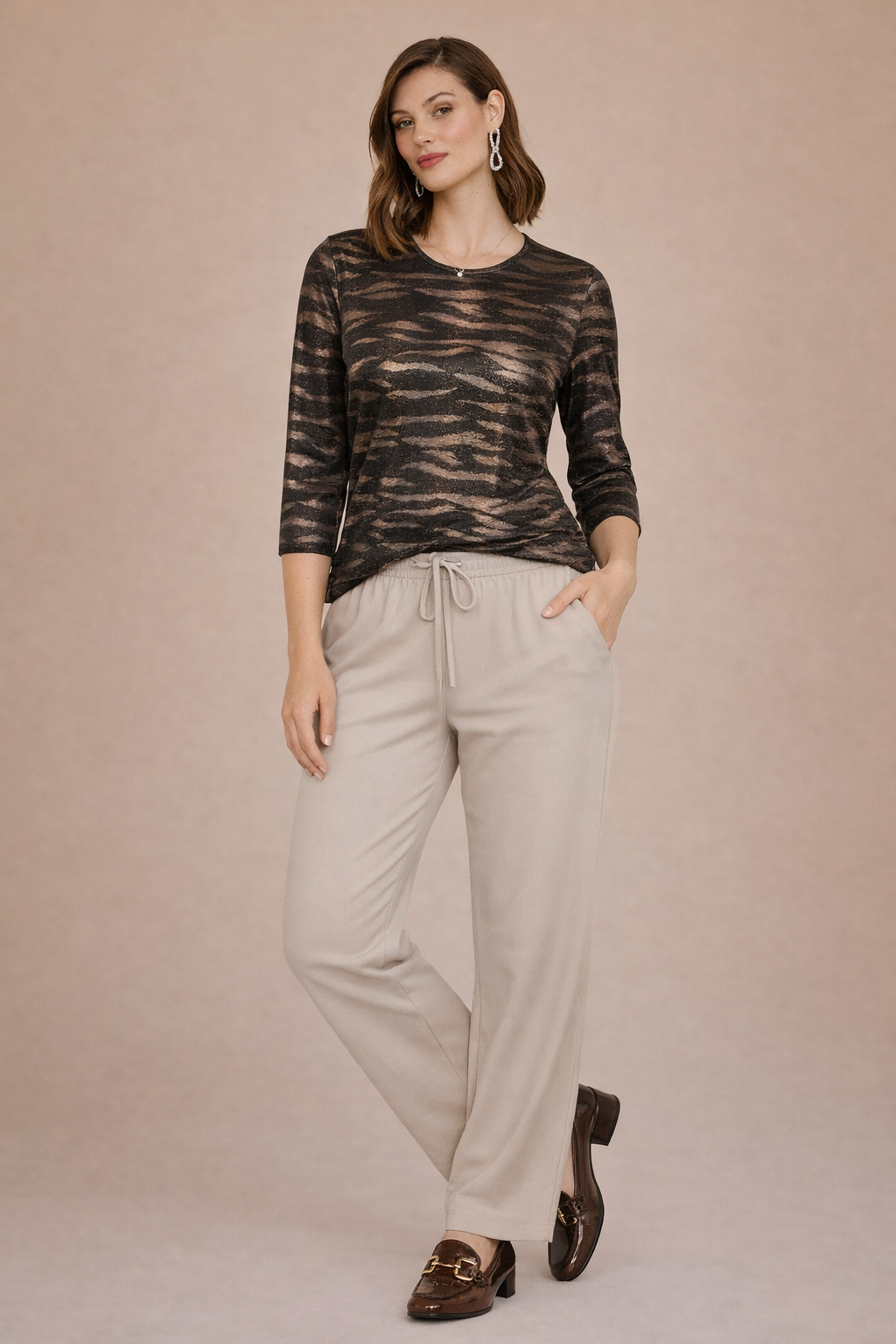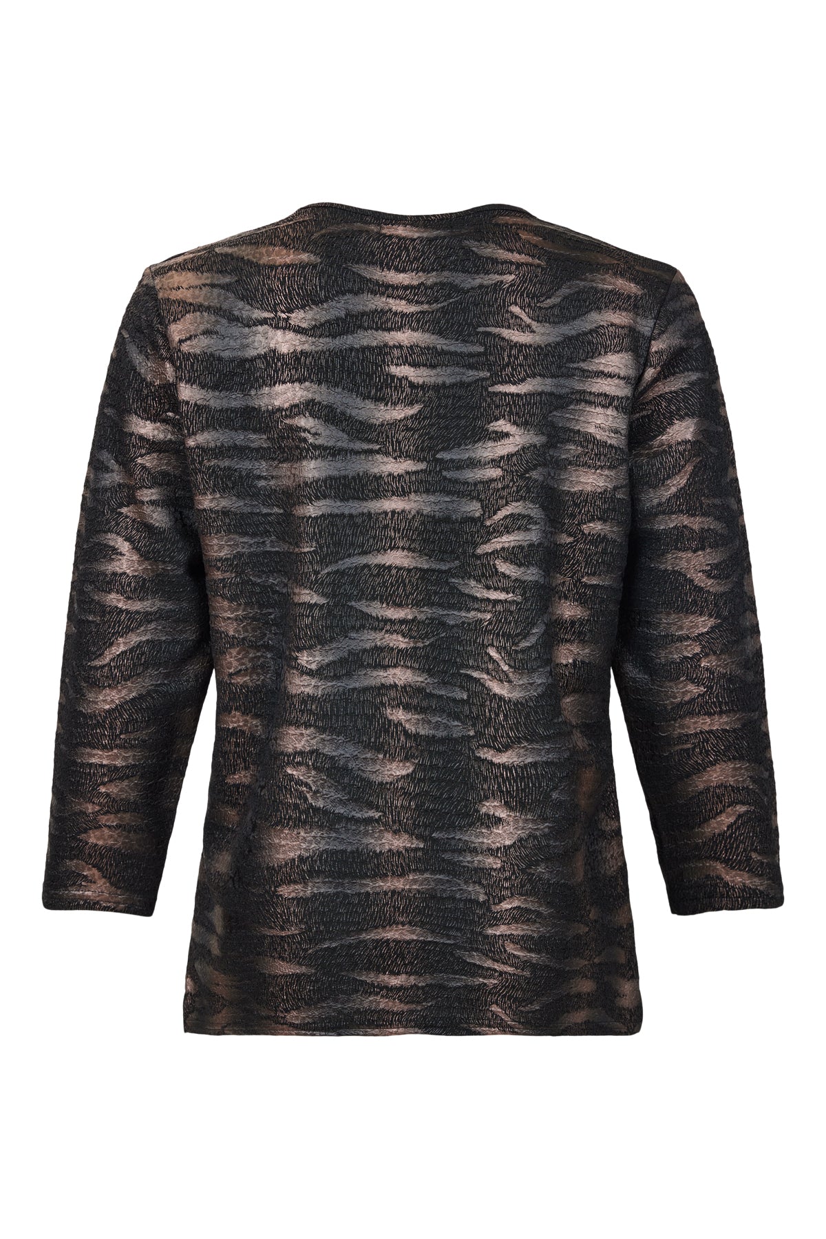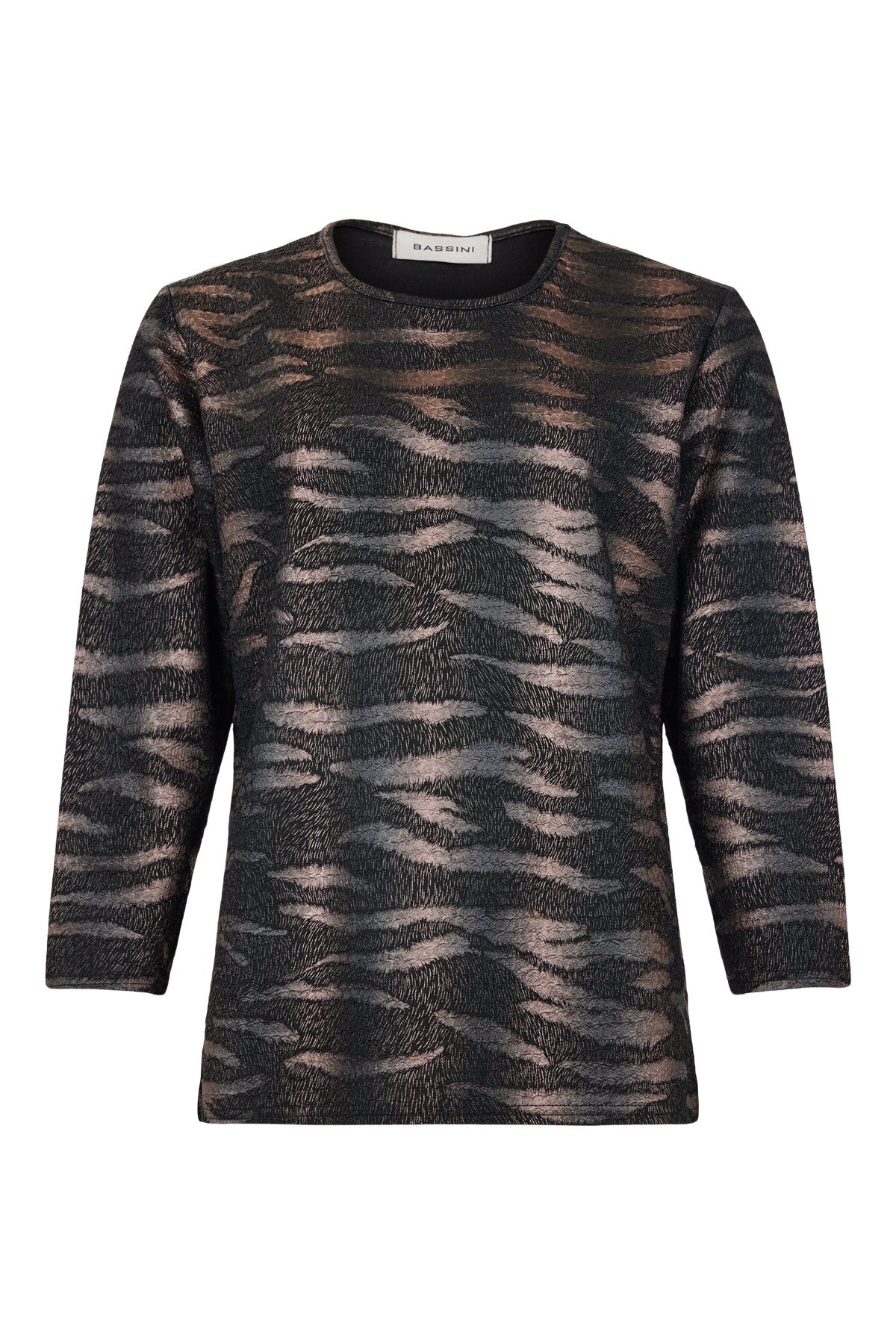 Bassini - Elisa mynstruð sparileg blússa með rúnuðu hálsmáli, kvartermum og smá klauf á hliðum. Létt og þægileg og hægt að vera í undir jakka eða peysu eða bara ein og sér.