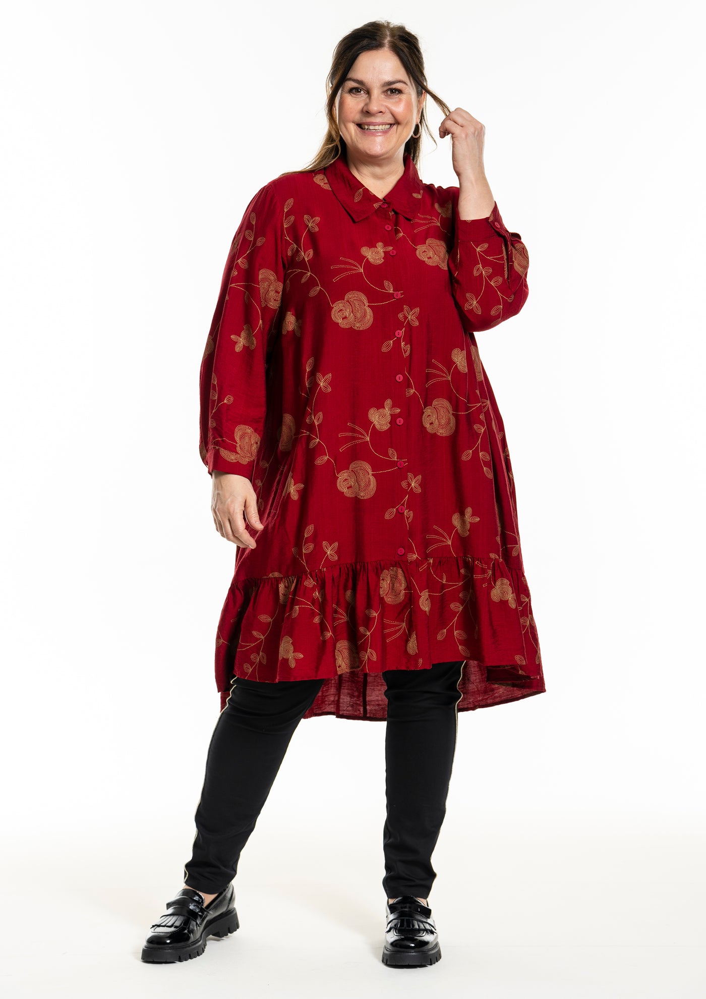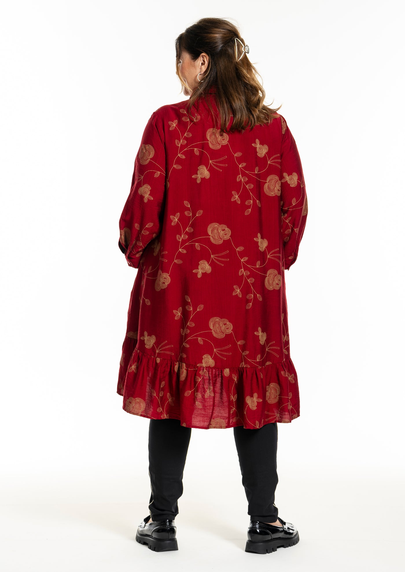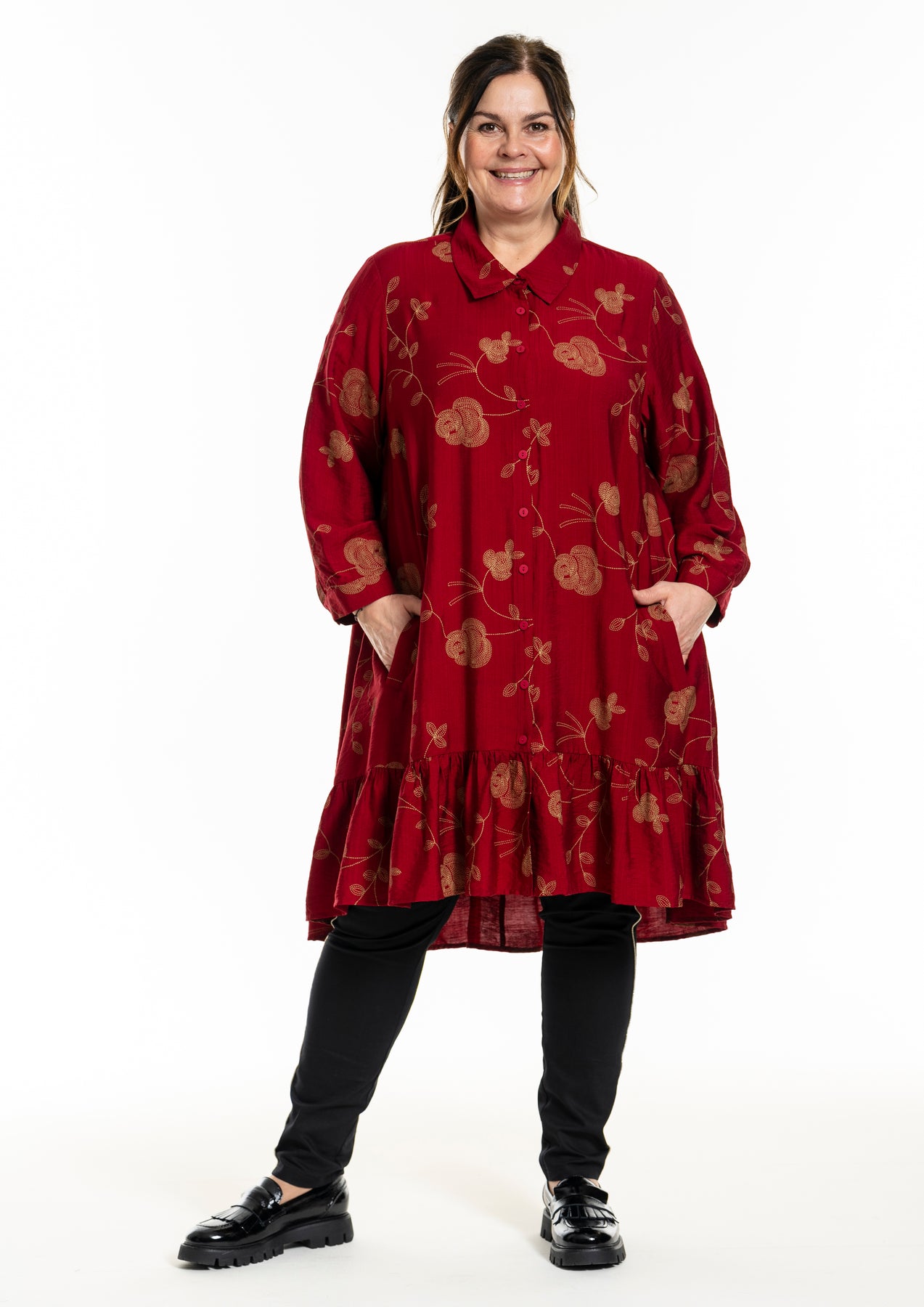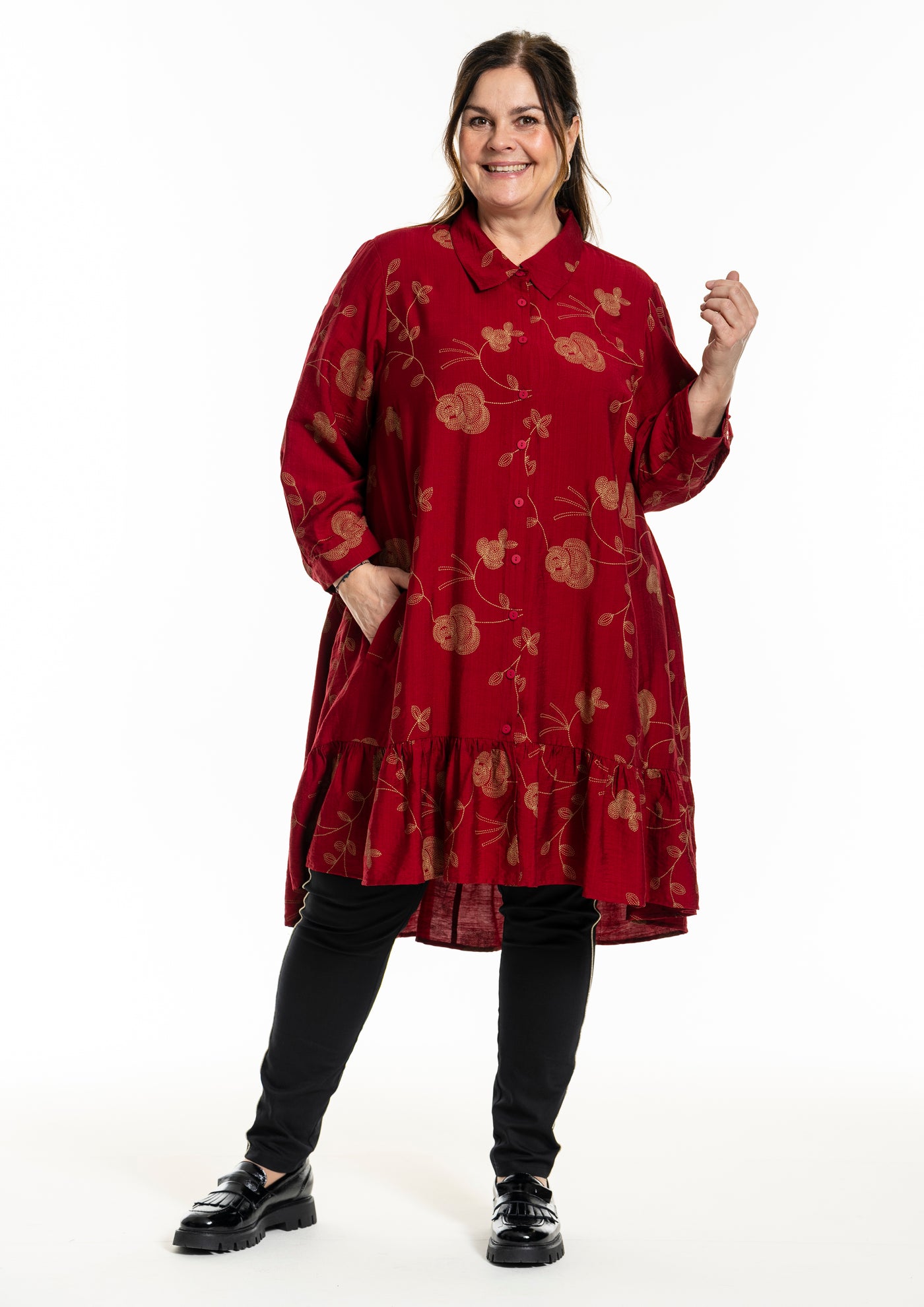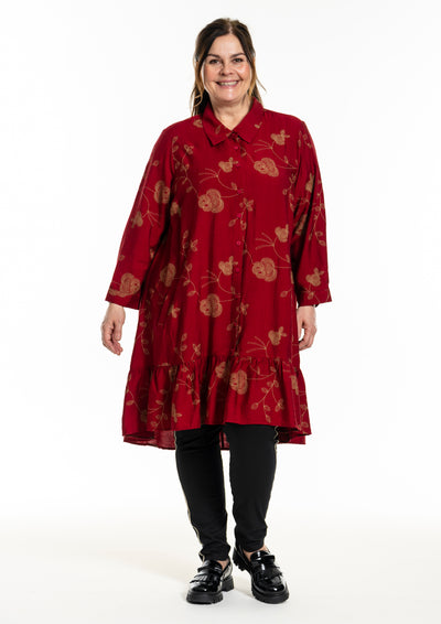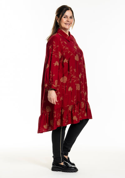 Gozzip - Edith, flottur einlitur skyrtukjóll með gylltum blómum, skyrtukraga hnepptum upp í háls, góðum vösum, langar ermar og gott A snið sem passar vel allsstaðar. Smá pífukanntur neðst. Hægt að nota opinn yfir buxur og topp eða lokaðan eins og kjól eða tuniku.