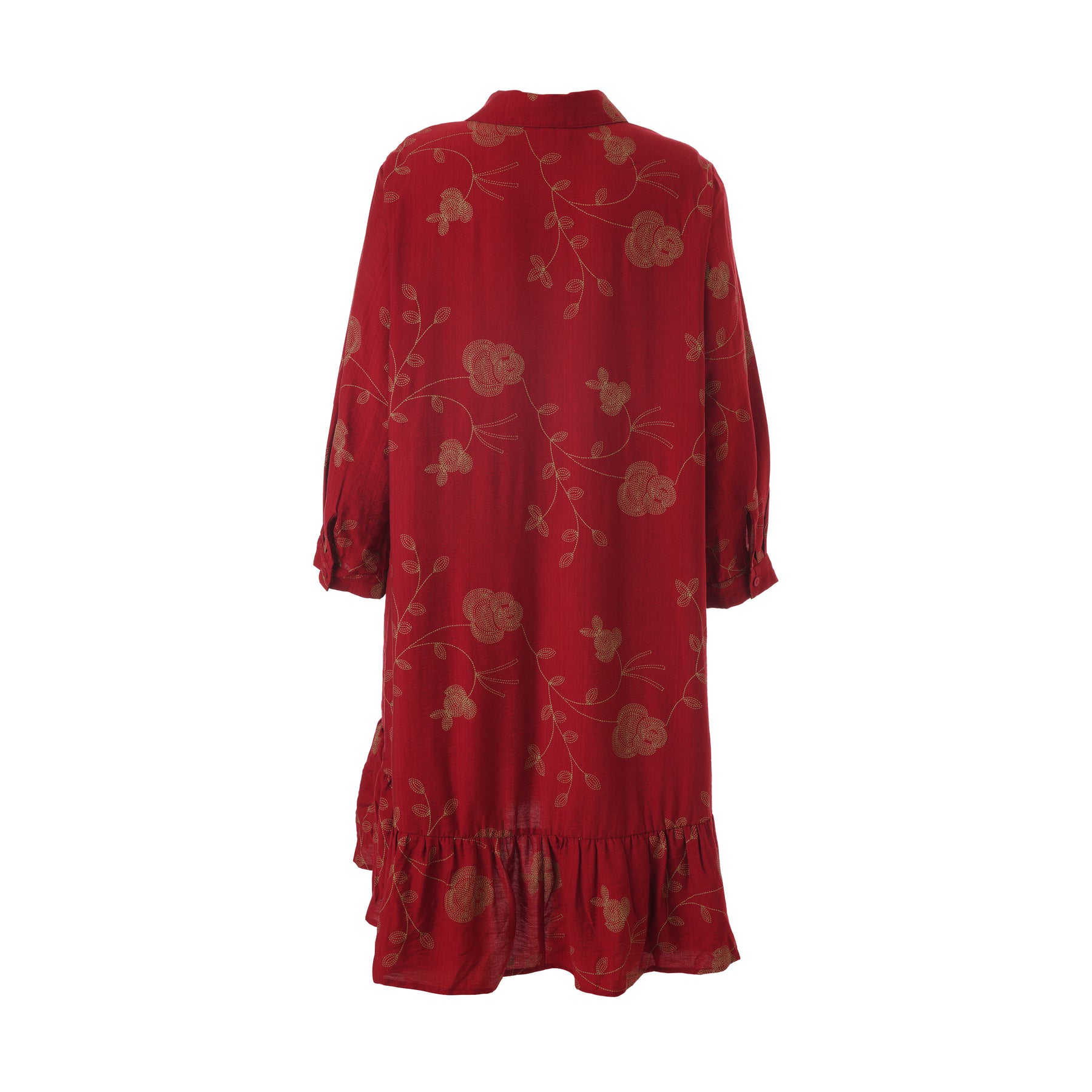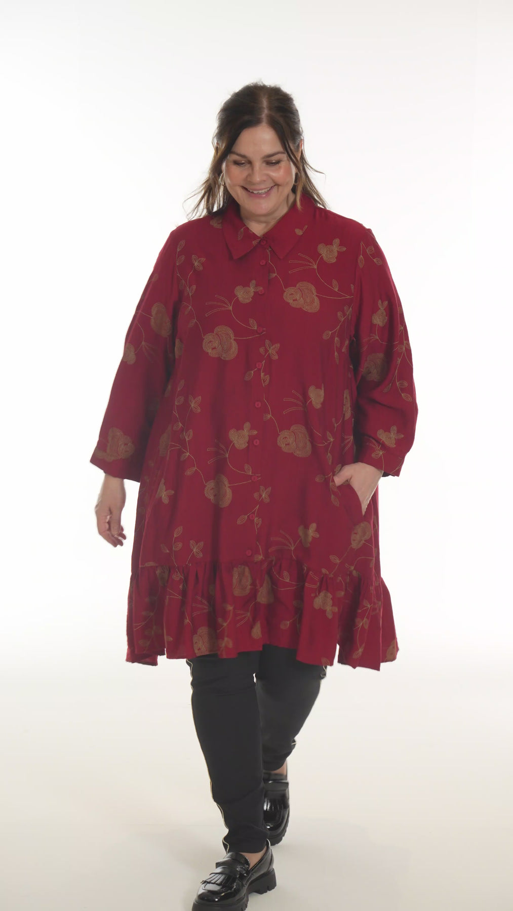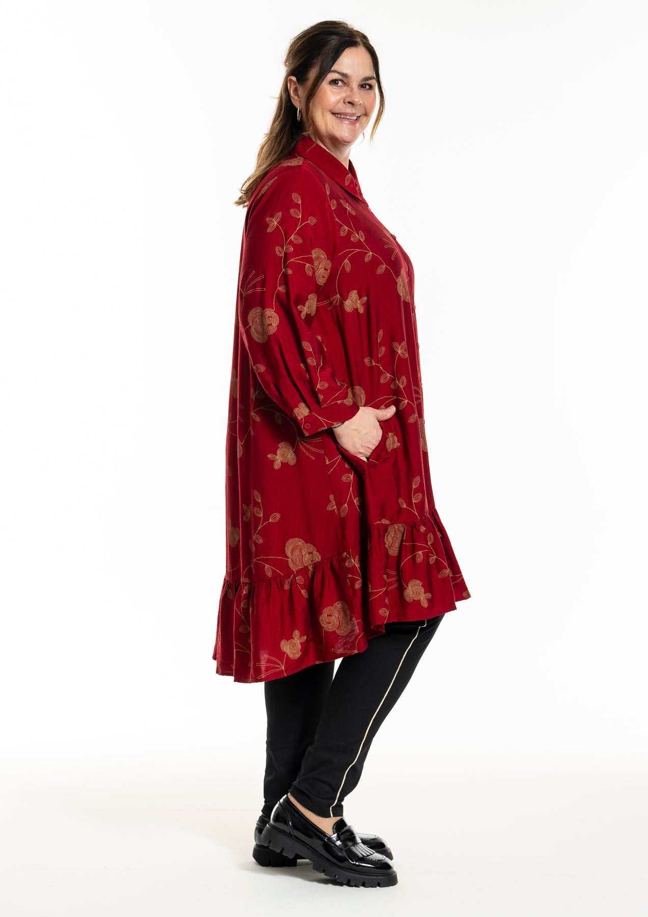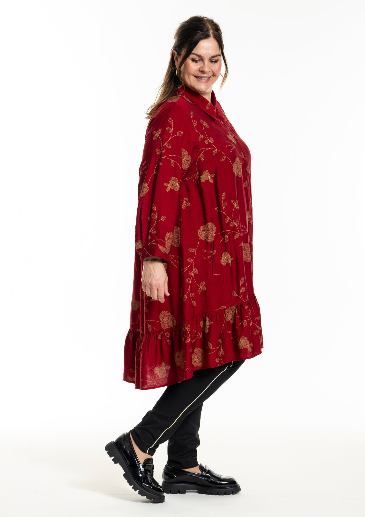 Gozzip - Edith, flottur einlitur skyrtukjóll með gylltum blómum, skyrtukraga hnepptum upp í háls, góðum vösum, langar ermar og gott A snið sem passar vel allsstaðar. Smá pífukanntur neðst. Hægt að nota opinn yfir buxur og topp eða lokaðan eins og kjól eða tuniku.