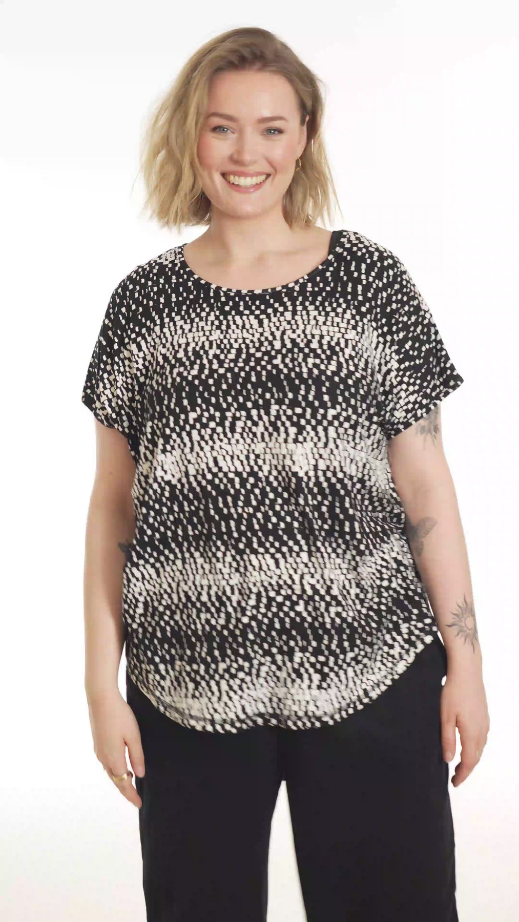 Gozzip - Gitte stuttermabolur með mynstri. Bolurinn er úr góðu og þægilegu viskosefni, rúnað hálsmál, rúnaður að neðan og örlítið meiri sídd að aftan.
