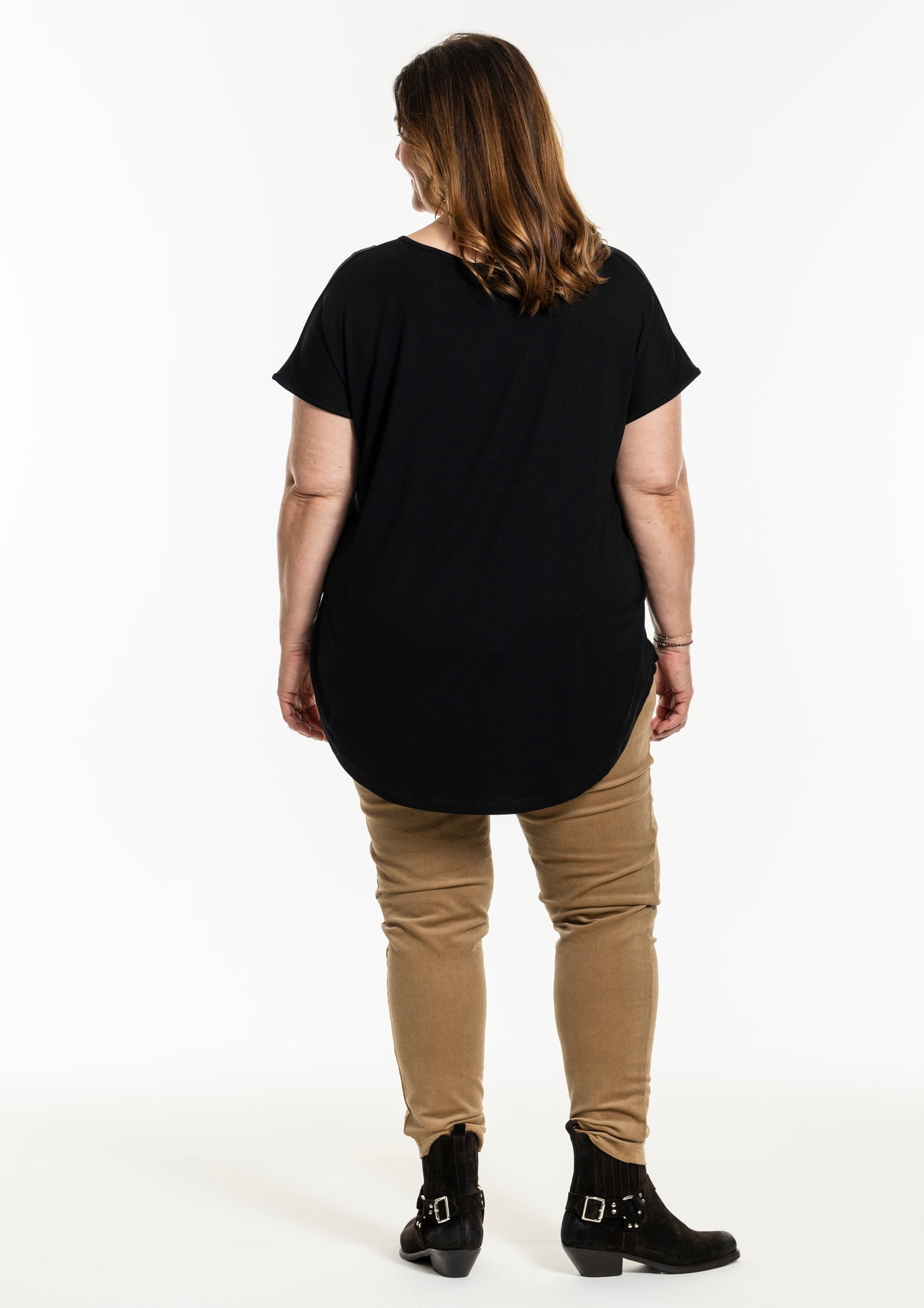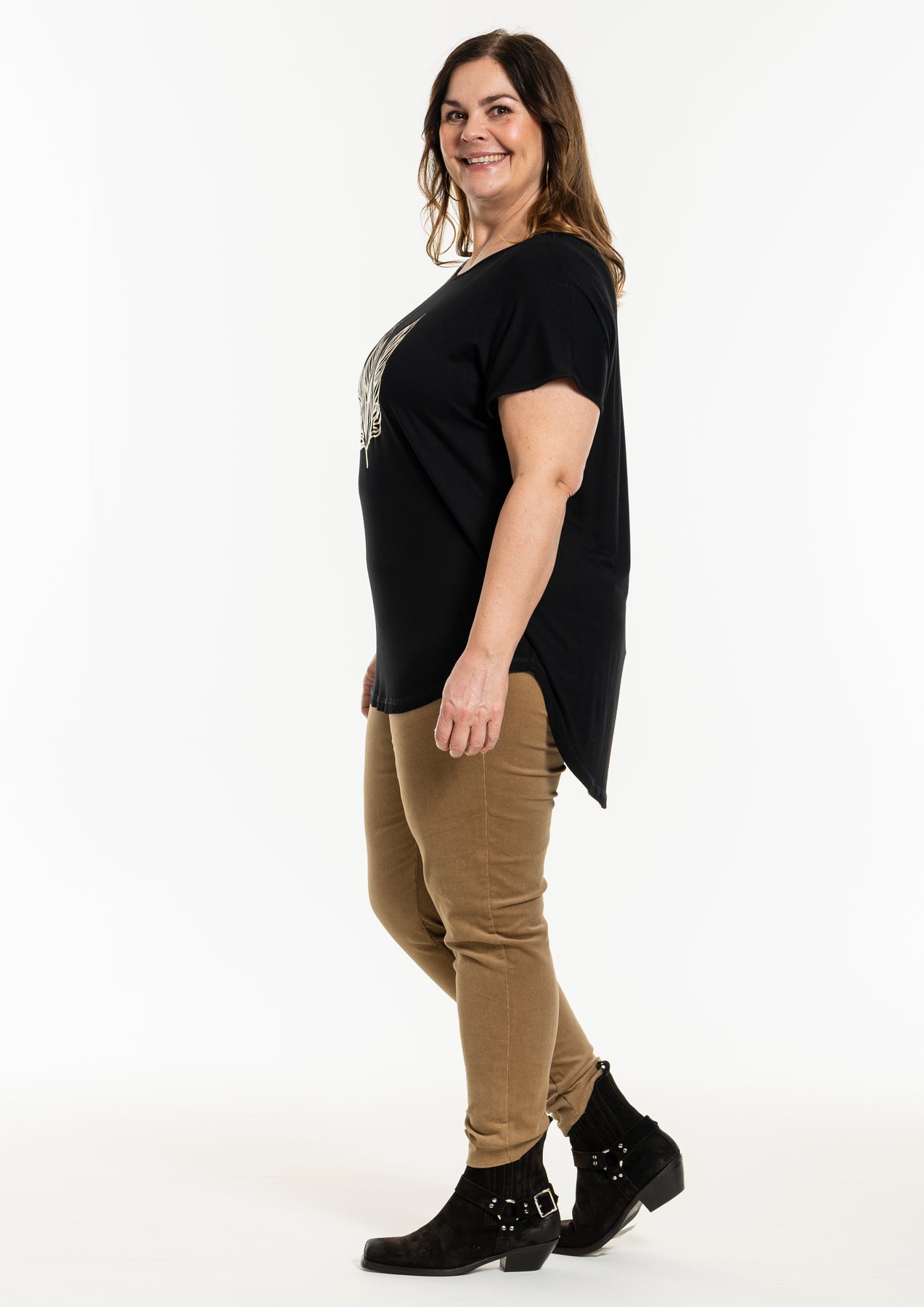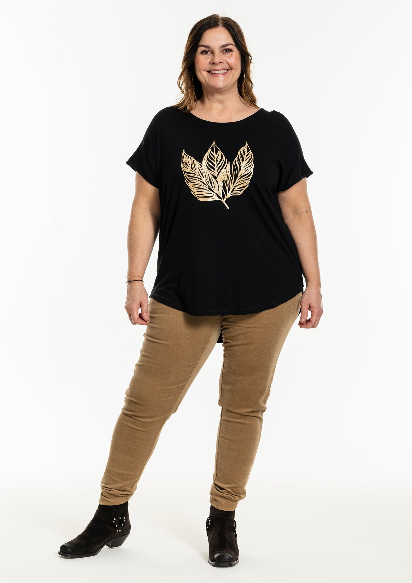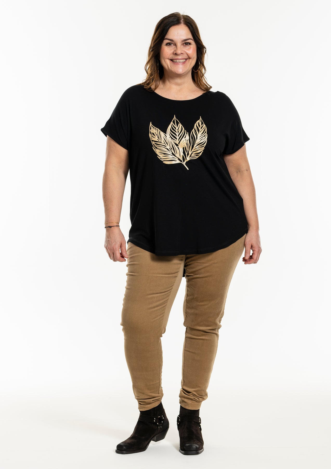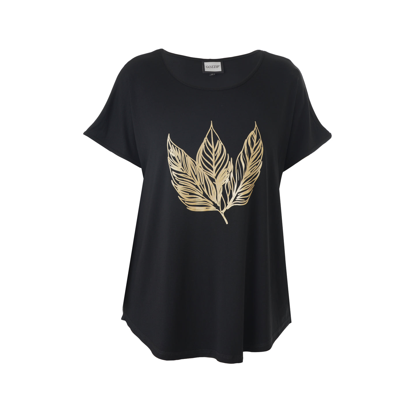 GOZZIP GOZZIP Gitte stuttermabolur með gylltum laufum framan á. Bolurinn er úr góðu og þægilegu viskosefni, rúnað hálsmál og örlítið meiri sídd að aftan.