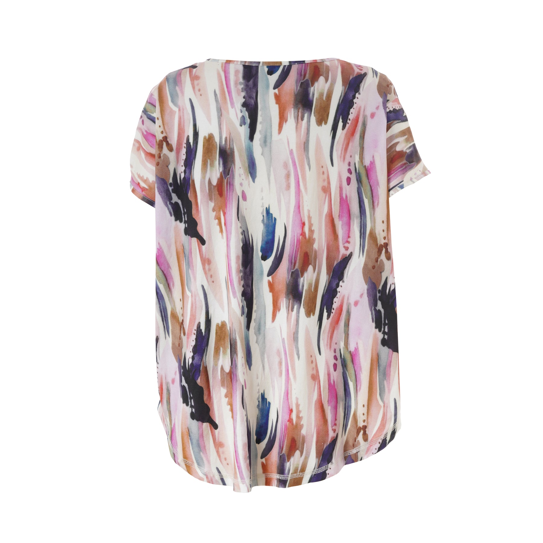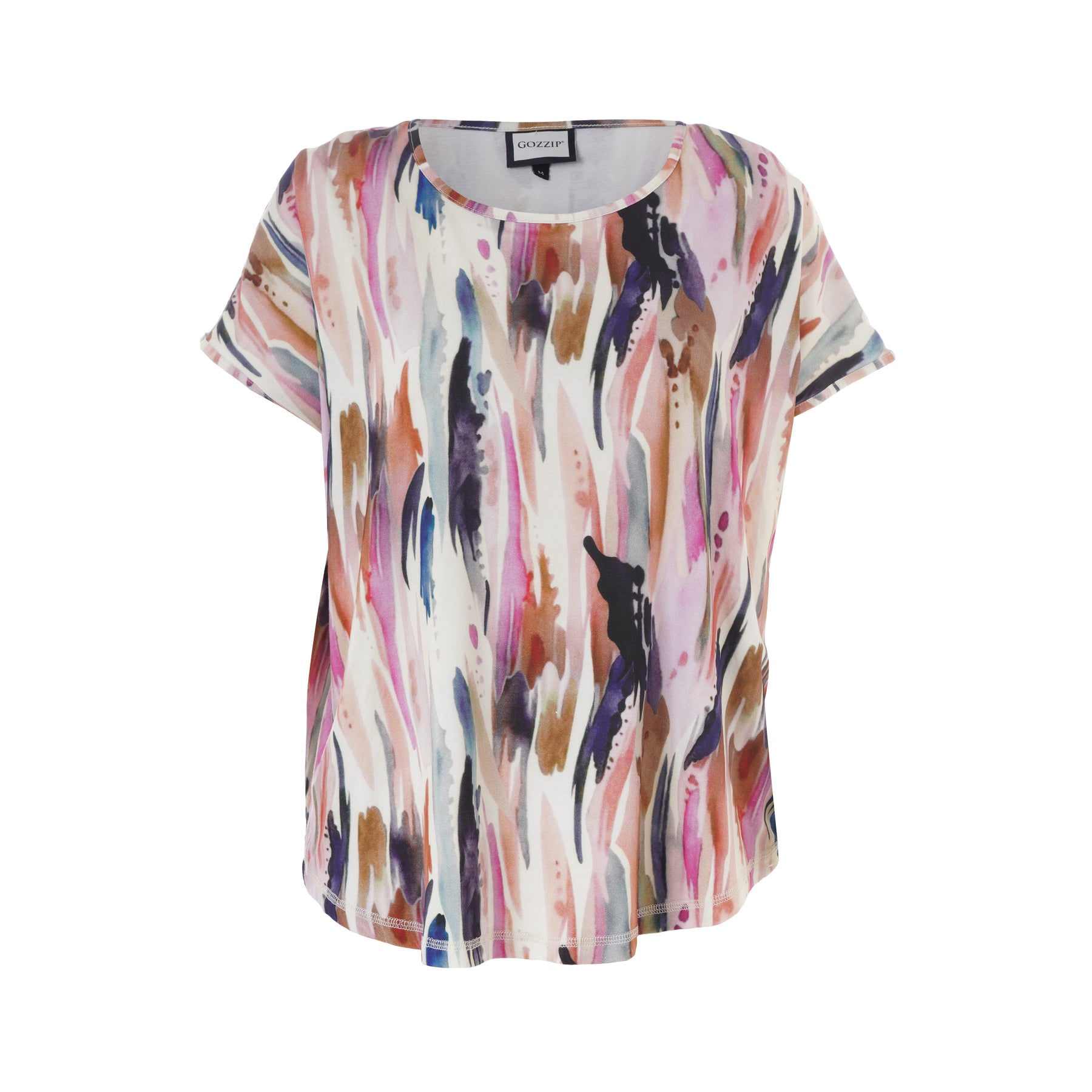 GOZZIP - Gitte stuttermabolur með litríku mynstri. Bolurinn er úr góðu og þægilegu viskosefni, rúnað hálsmál, rúnaður að neðan og örlítið meiri sídd að aftan.