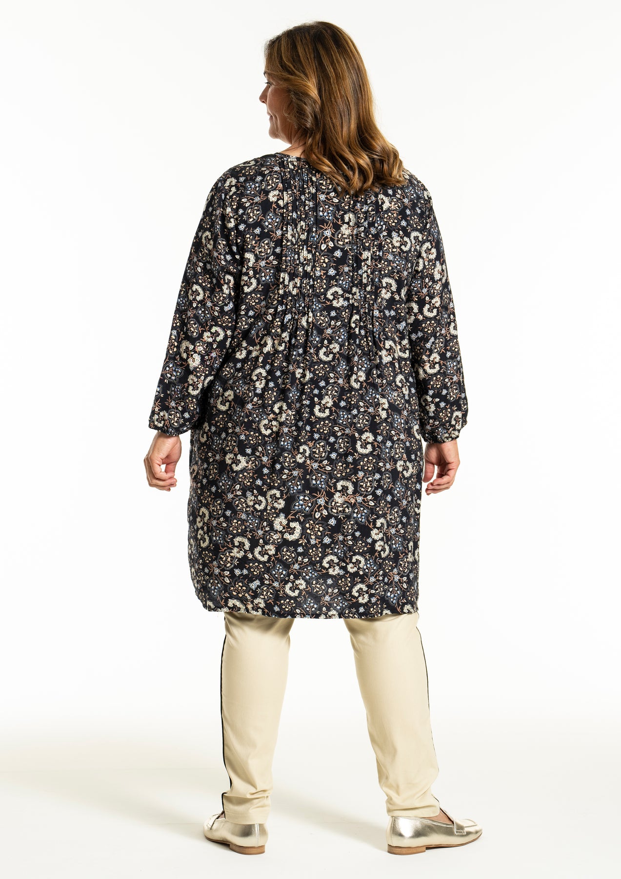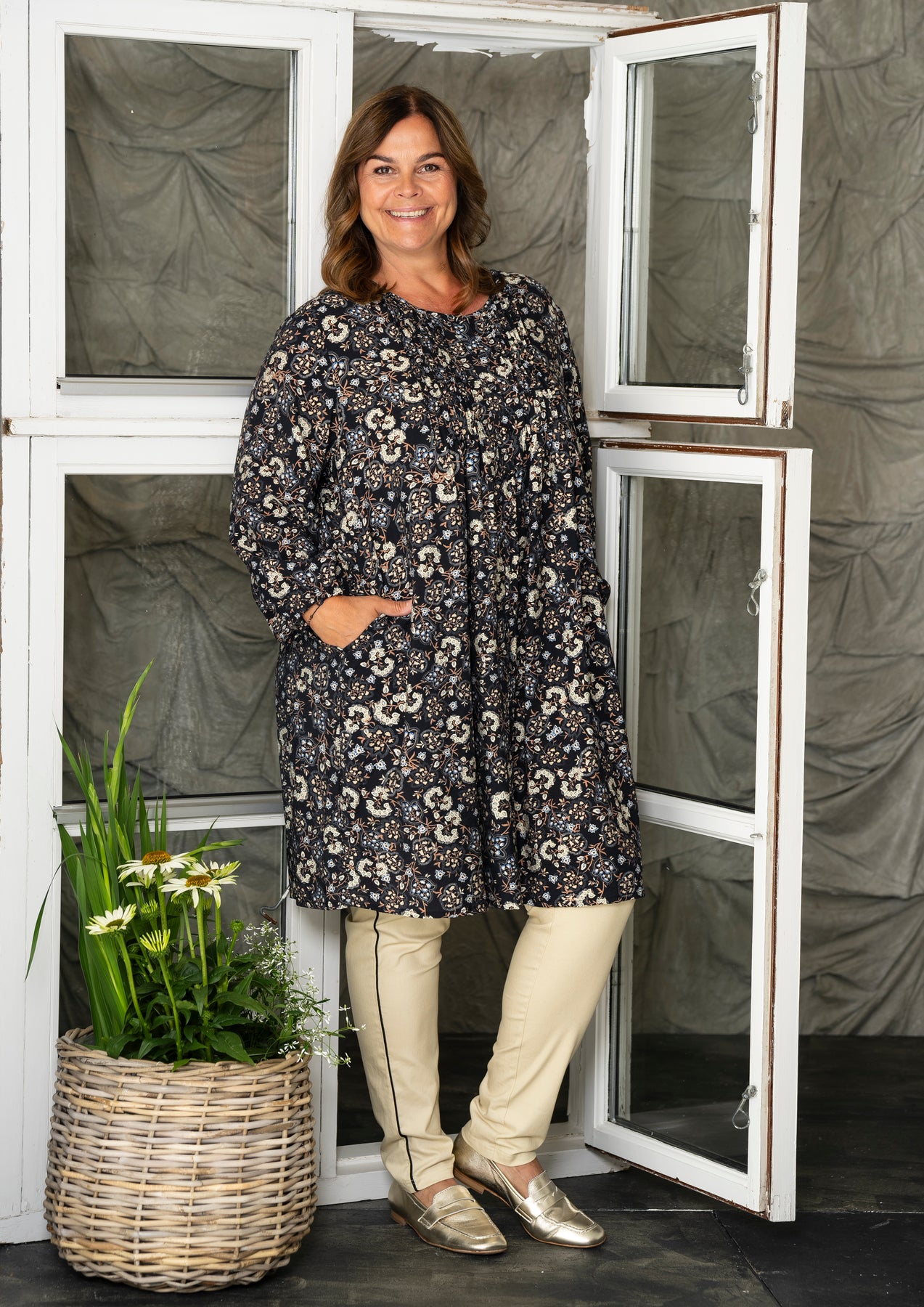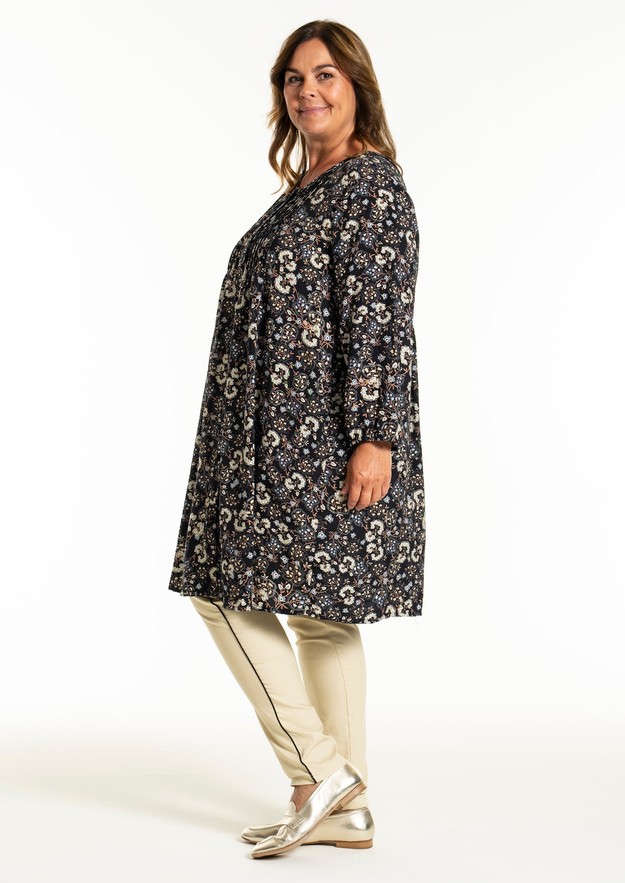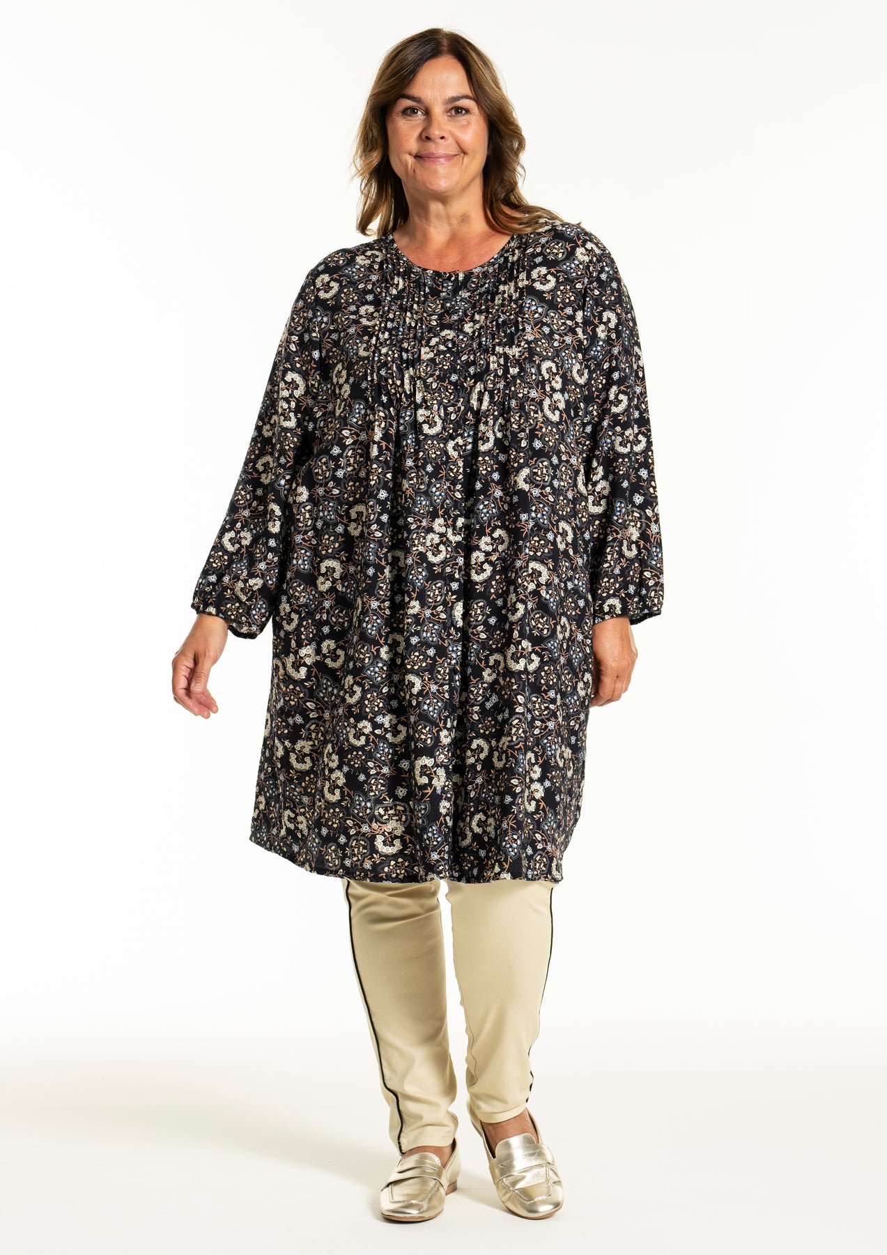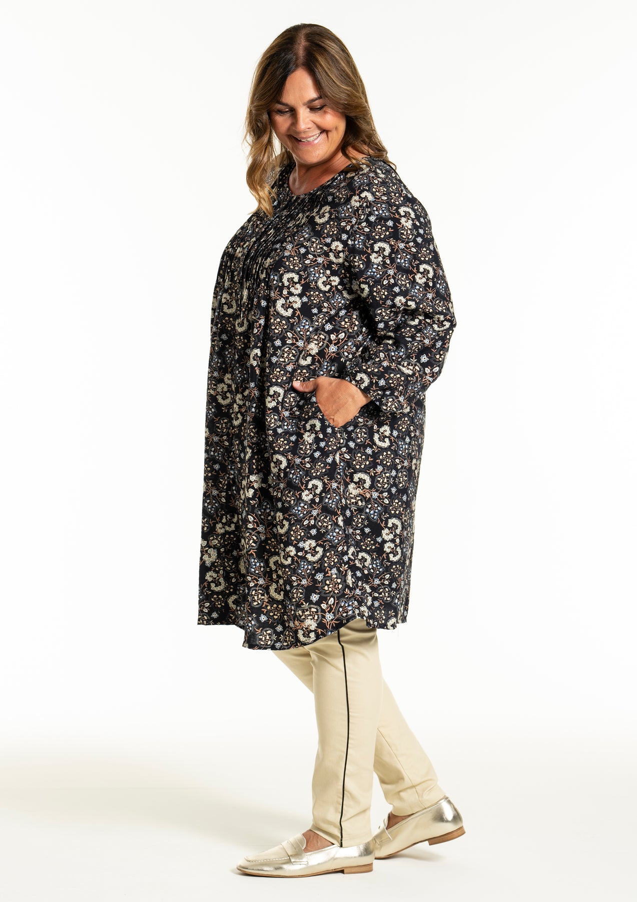 Gozzip - Johanne skyrtukjóll með svörtu og gráu blómamynstri. Látlaus með plíseringu að framan, tölur alla leið, langar ermar með teygju og góðum vösum, hægt að nota opinn yfir buxur og topp eða lokaðan eins og kjól eða tuniku.