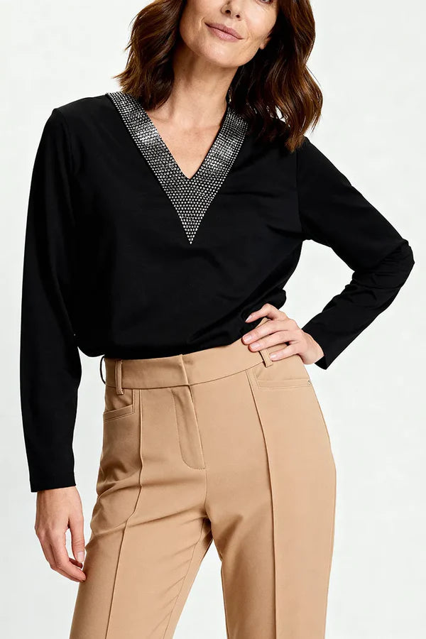 Habella - Taniya fallegur og sparilegur langermabolur með V-hálsmáli og skrautsteinum í hálsmáli. Léttur og þægilegur og er smart einn og sér eða undir jakka eða peysu.