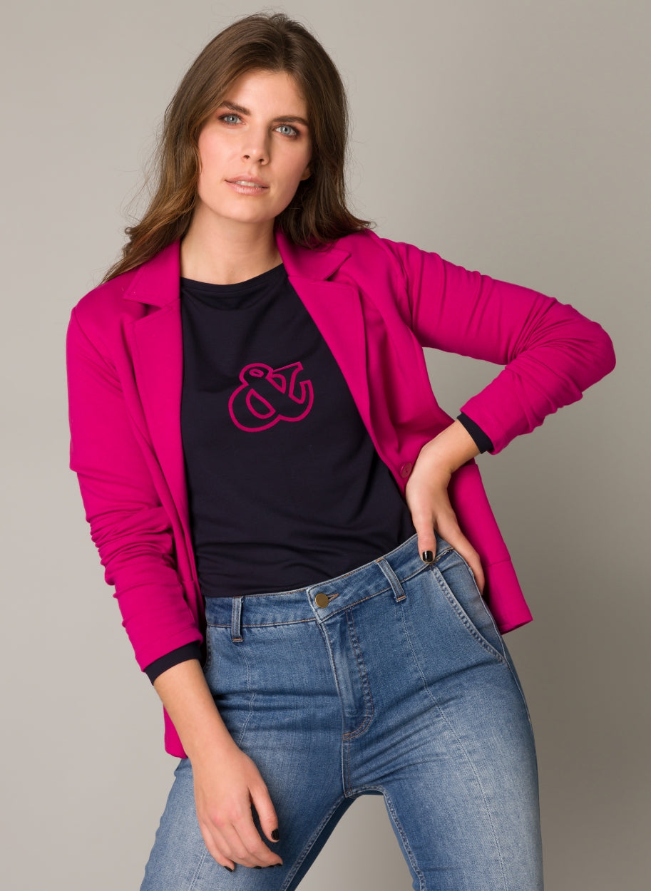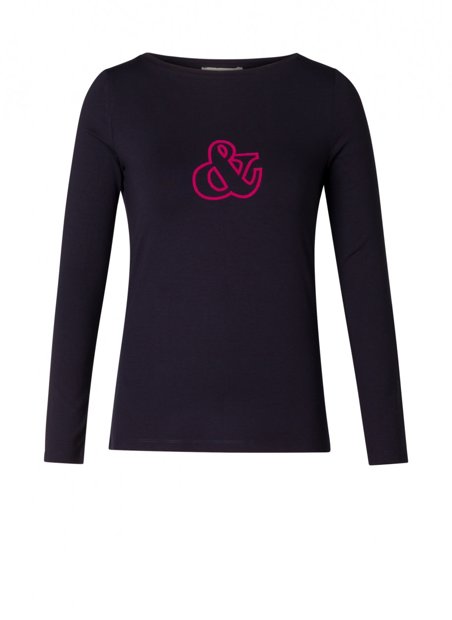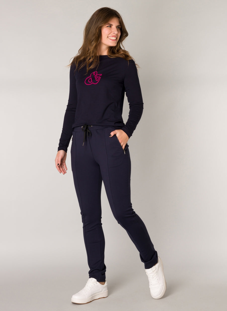 Ivy Beau - Zoe þægilegur langermabolur, með rúnuðu hálsmáli. Dökkblár með bleiku & merki að framan. Hentar við gallabuxur eða hinar vinsælu treggings.