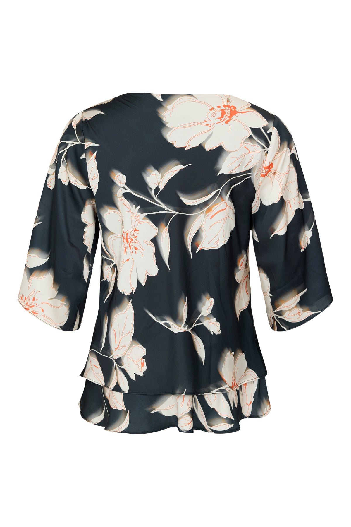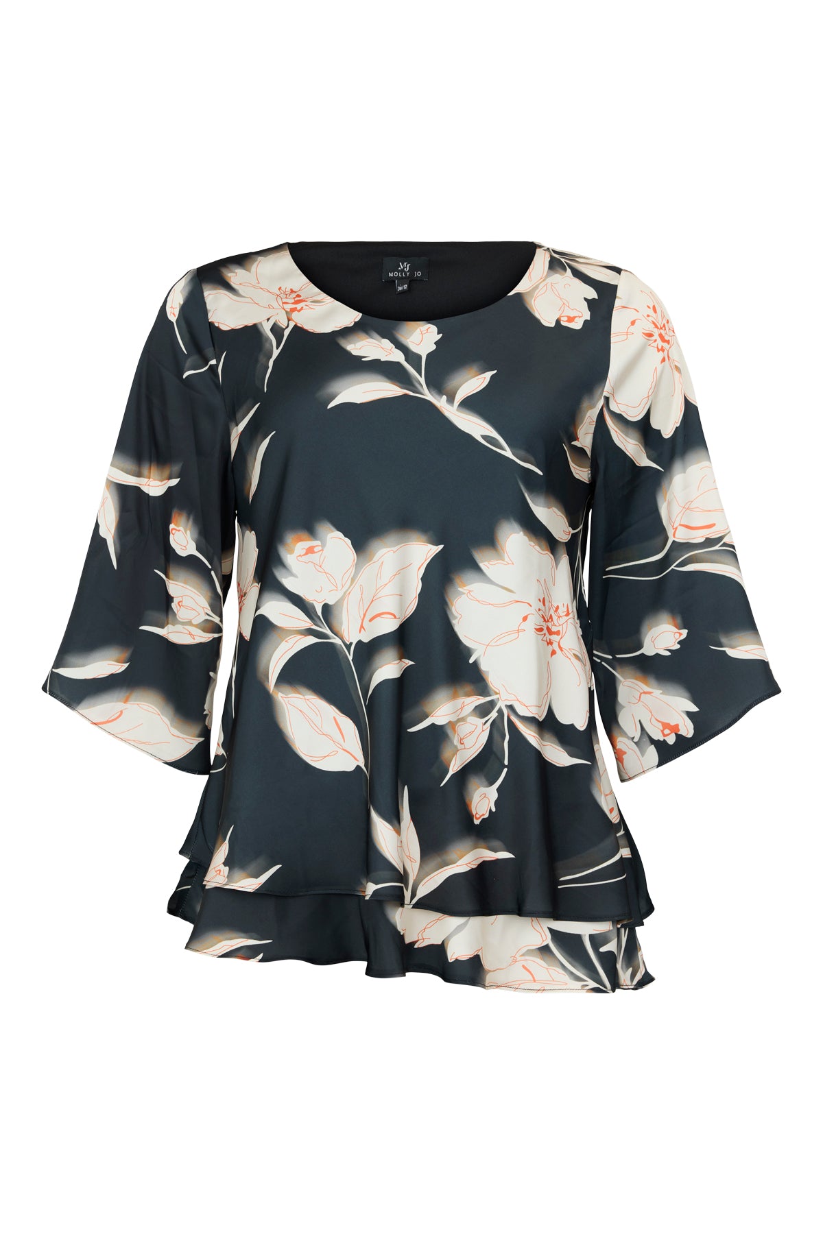 Molly Jo - Magnola flottur og vandaður sparitoppur með fallegu blómamynstri. Rúnað hálsmál, hálfgegnsæjar víðar shiffon ermar. Toppurinn hefur tvö lög sem gefur skemmtilegt flæði.