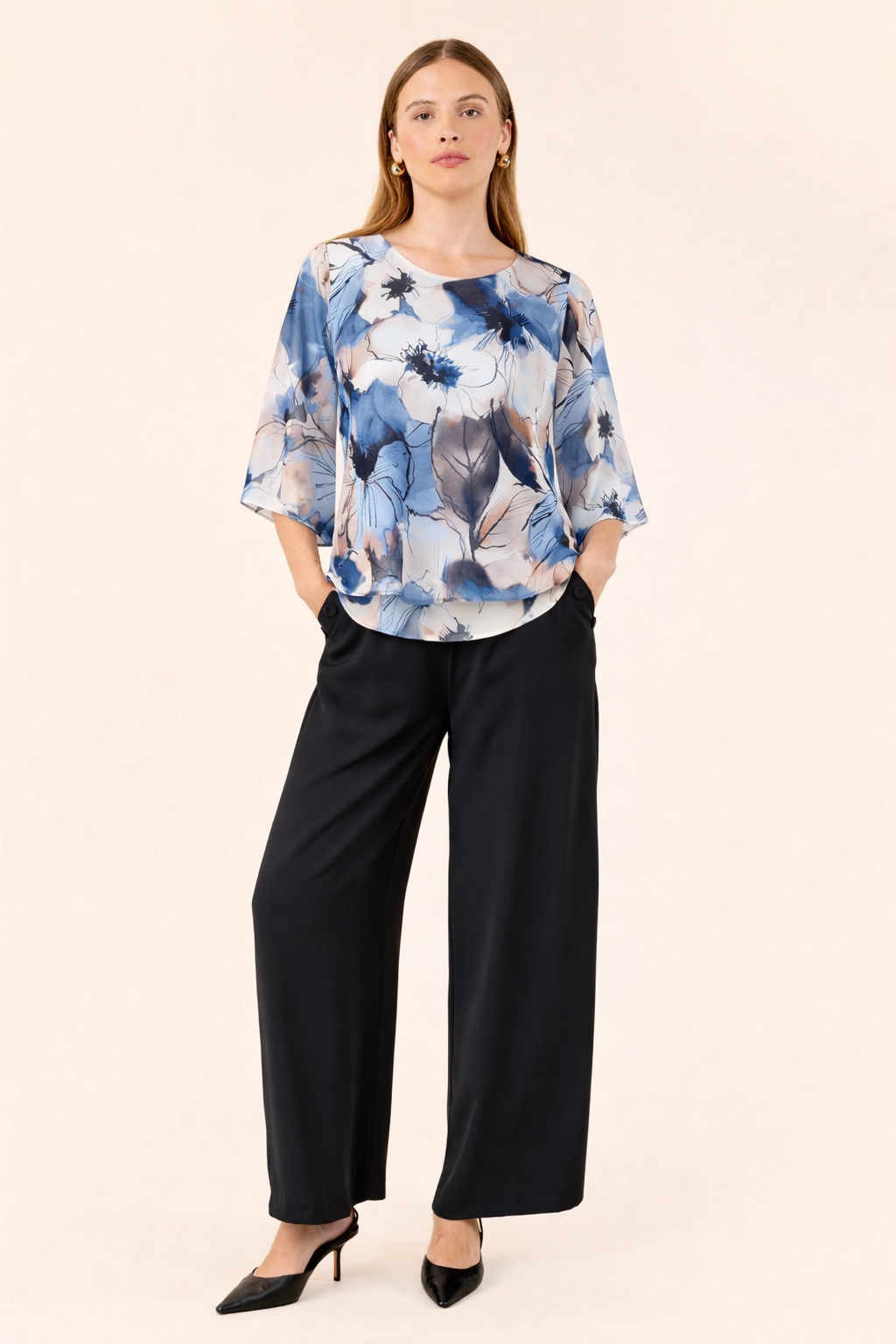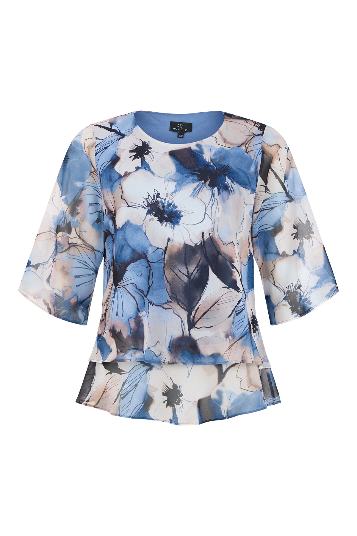 Molly Jo - Mira flottur og vandaður sparitoppur með fallegu blómamynstri. Rúnað hálsmál, hálfgegnsæjar víðar shiffon ermar. Toppurinn hefur tvö lög sem gefur skemmtilegt flæði.