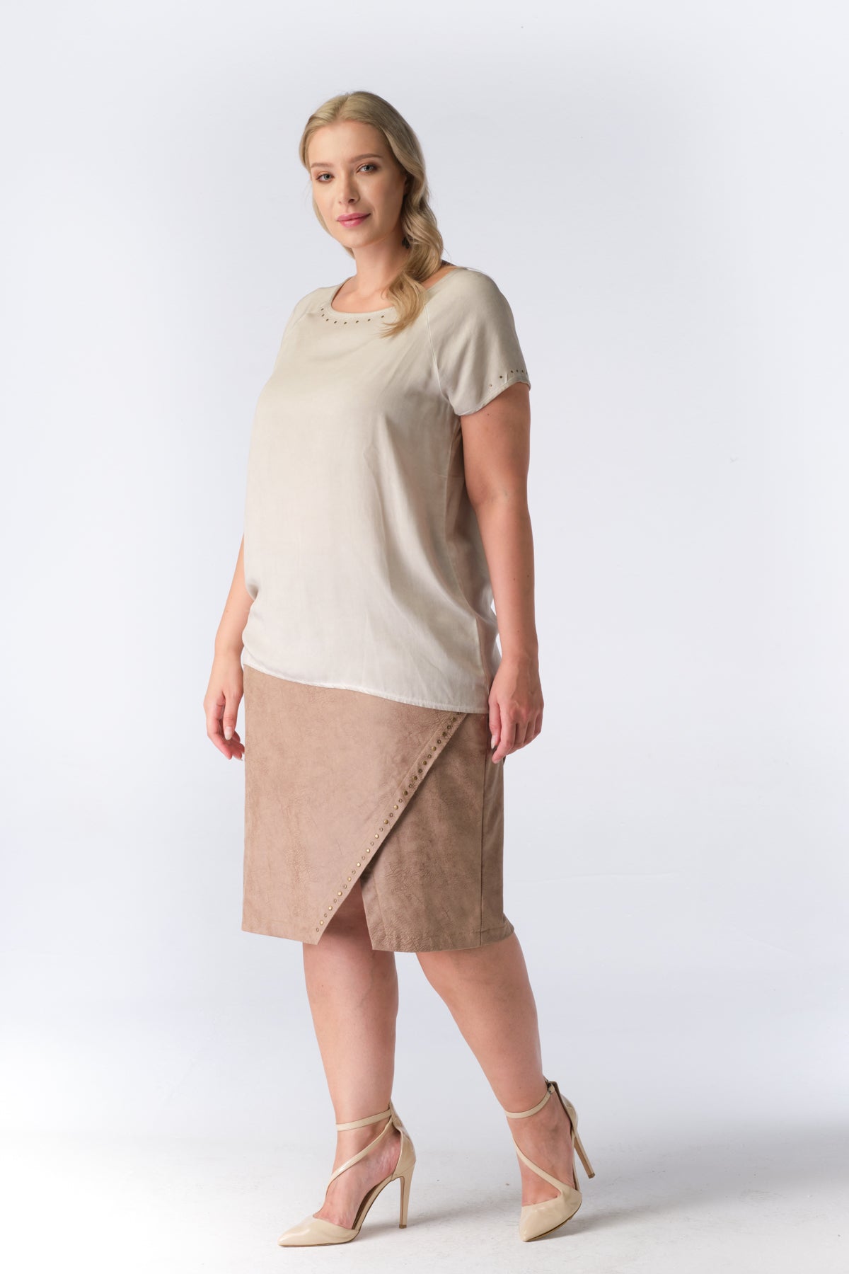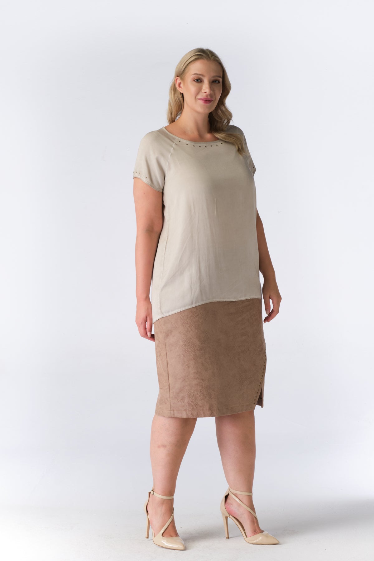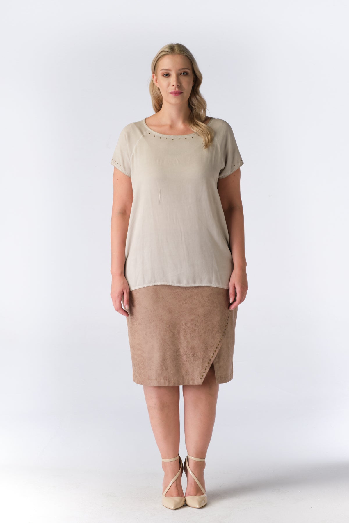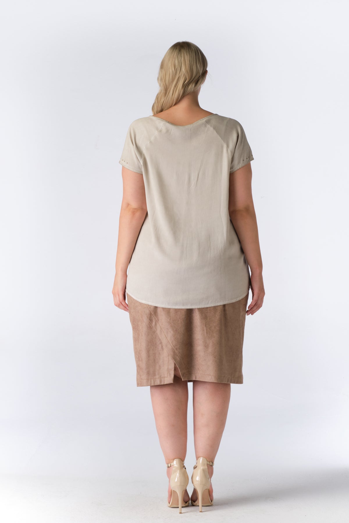 No Secret - Emmalee flottur og þægilegur stuttermabolur. Rúnað hálsmál, gylltir bóluhnappar í hálsmáli og á ermum, rúnaður að neðan og örlítið meiri sídd að aftan. Flottur við gallabuxur og margt fleira.