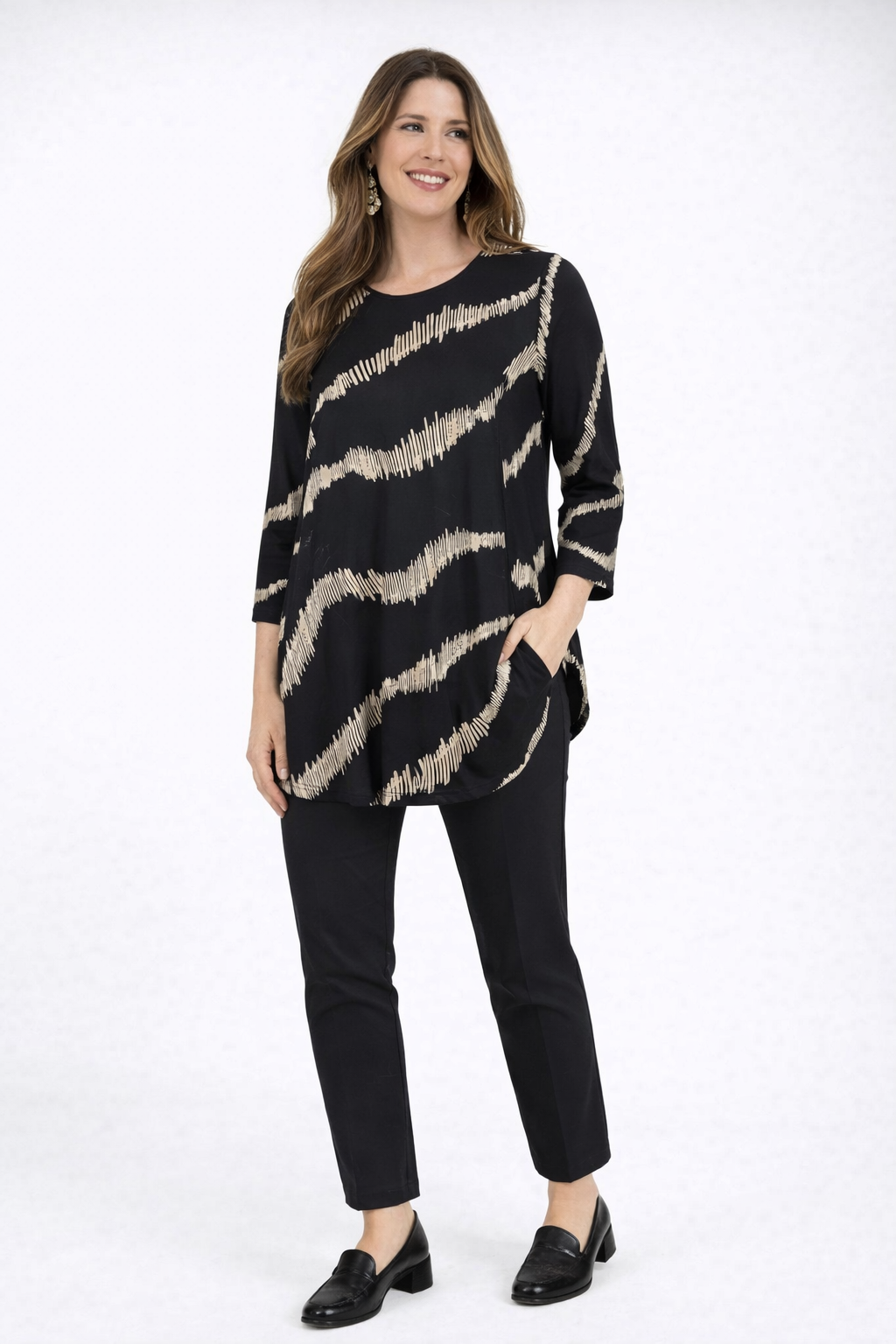 Sunday - Ash tunika með kvartermum og rúnuðu hálsmáli. Góðir vasar að framan (sjást ekki á myndunum).  A-snið. Hægt að nota bæði sem spari og hversdags. Svartur grunnur með bylgjulaga, ljósum strikum sem mynda nútímalegt abstrakt mynstur.