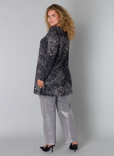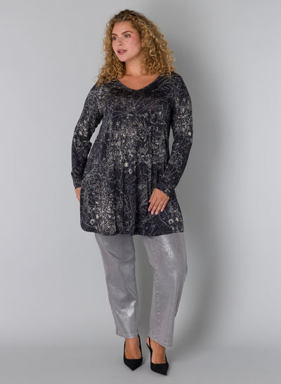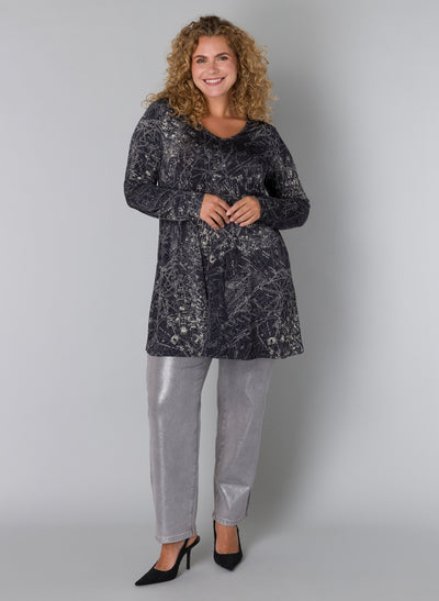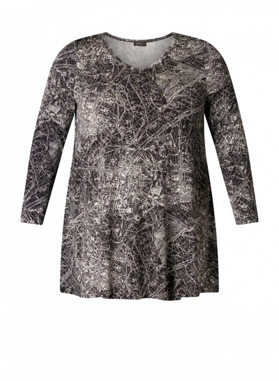 Snið- Ankaria Essental með V-hálsmáli og kvartermum. Svört í grunninn með gráu mynstri.