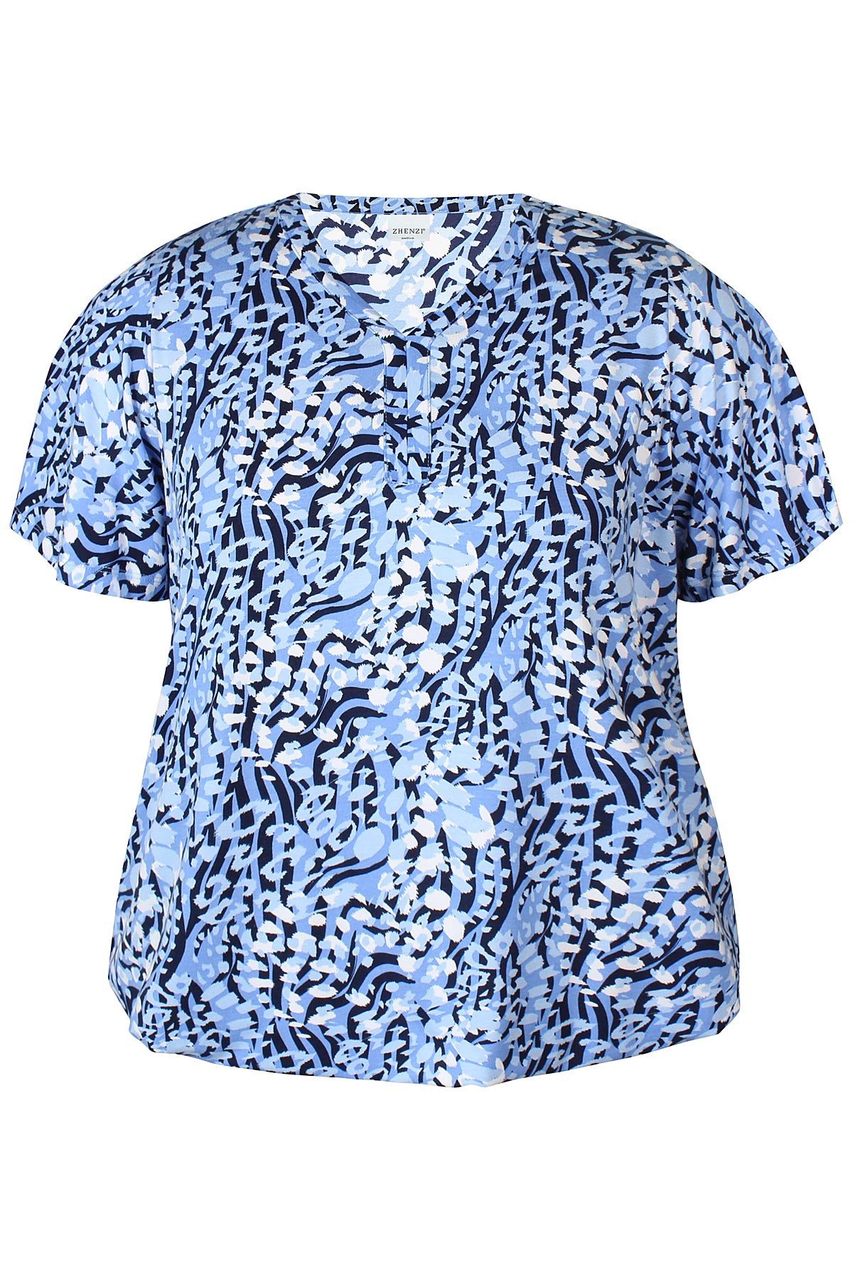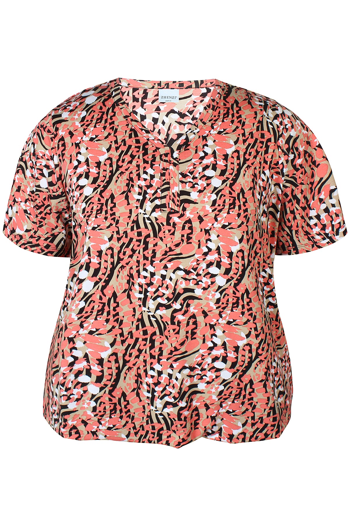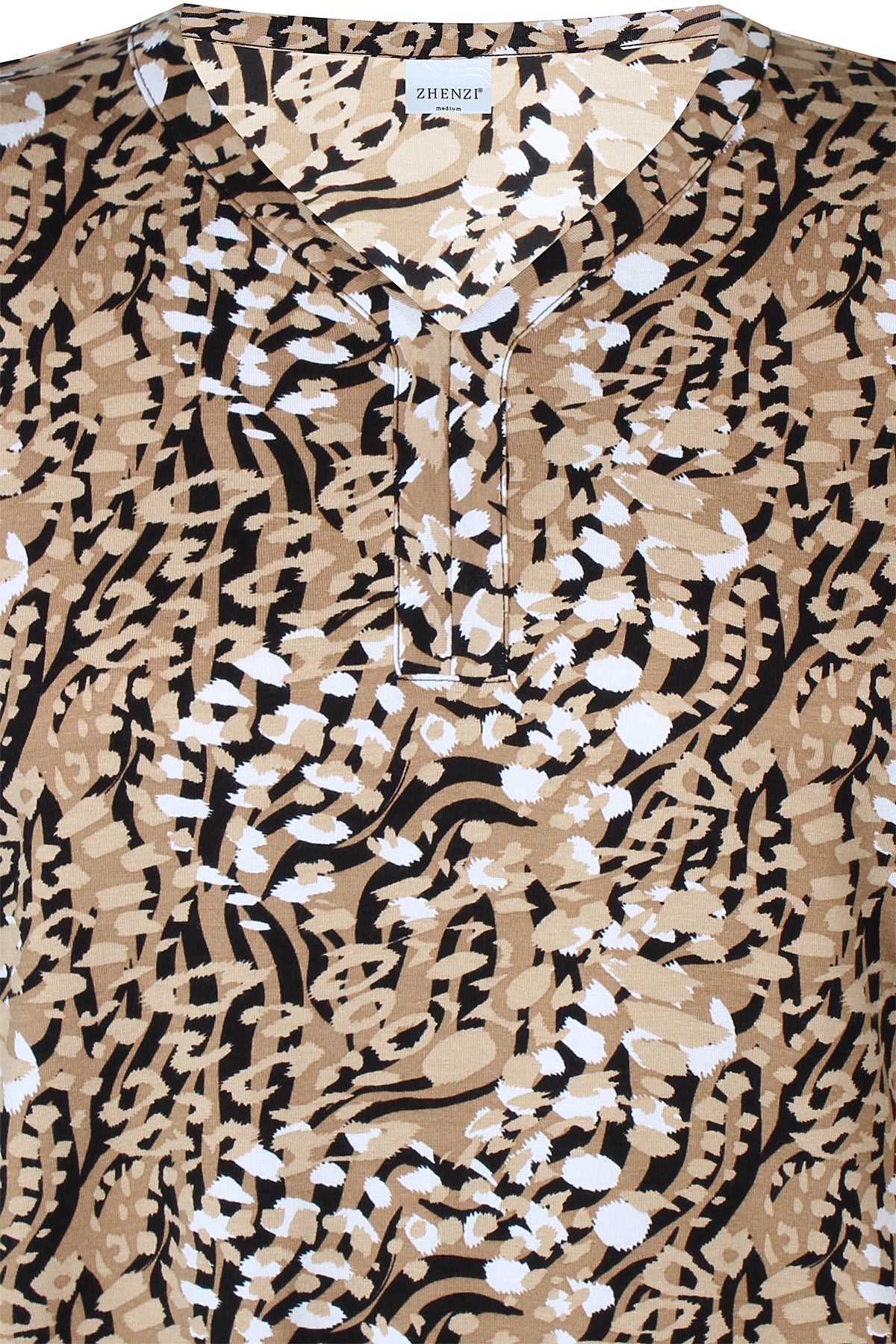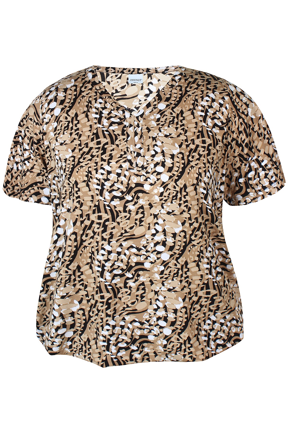 Zhenzi - Fien sætur stuttermabolur úr viscose efni með fallegu mynstri. V-hálsmál og stuttar ermar, tekinn saman að neðan með teygju. Flott bæði sem hversdags og betri flík og passar vel með hverju sem er.