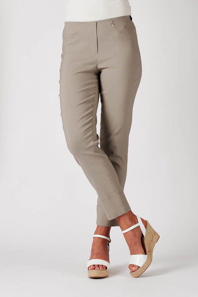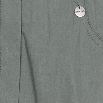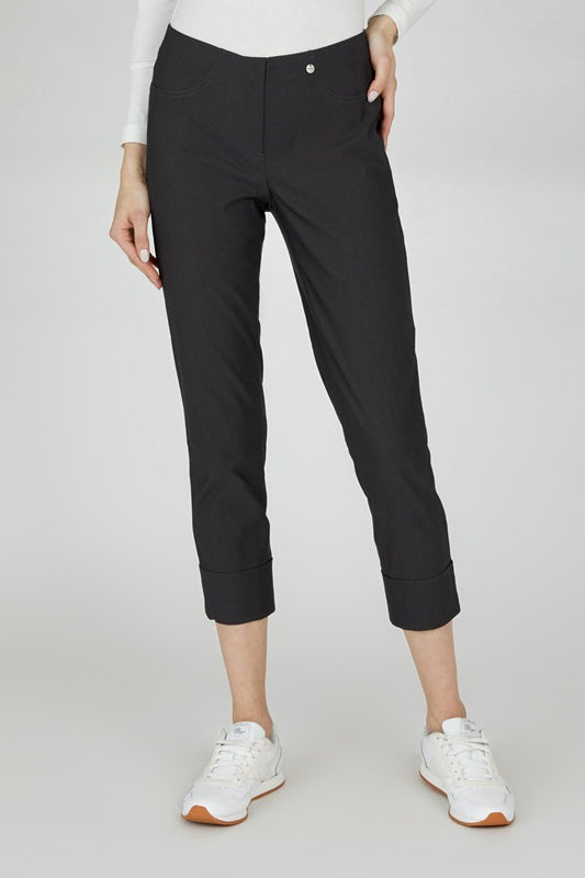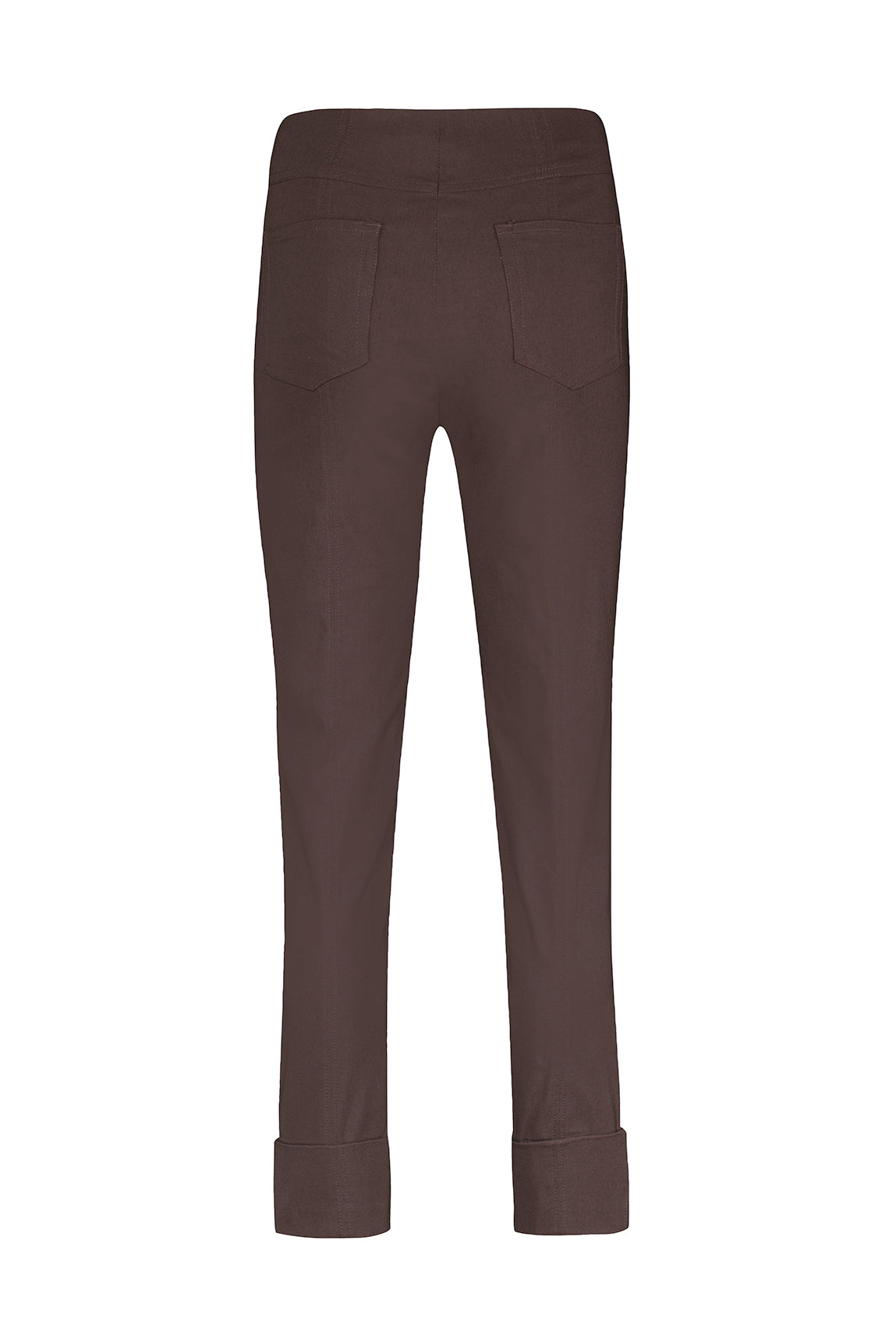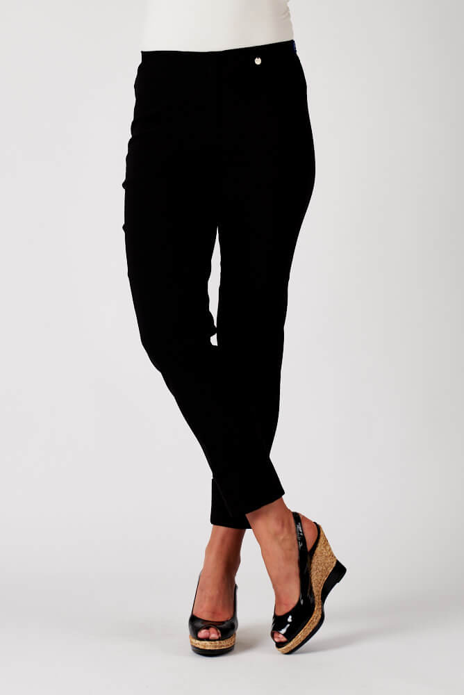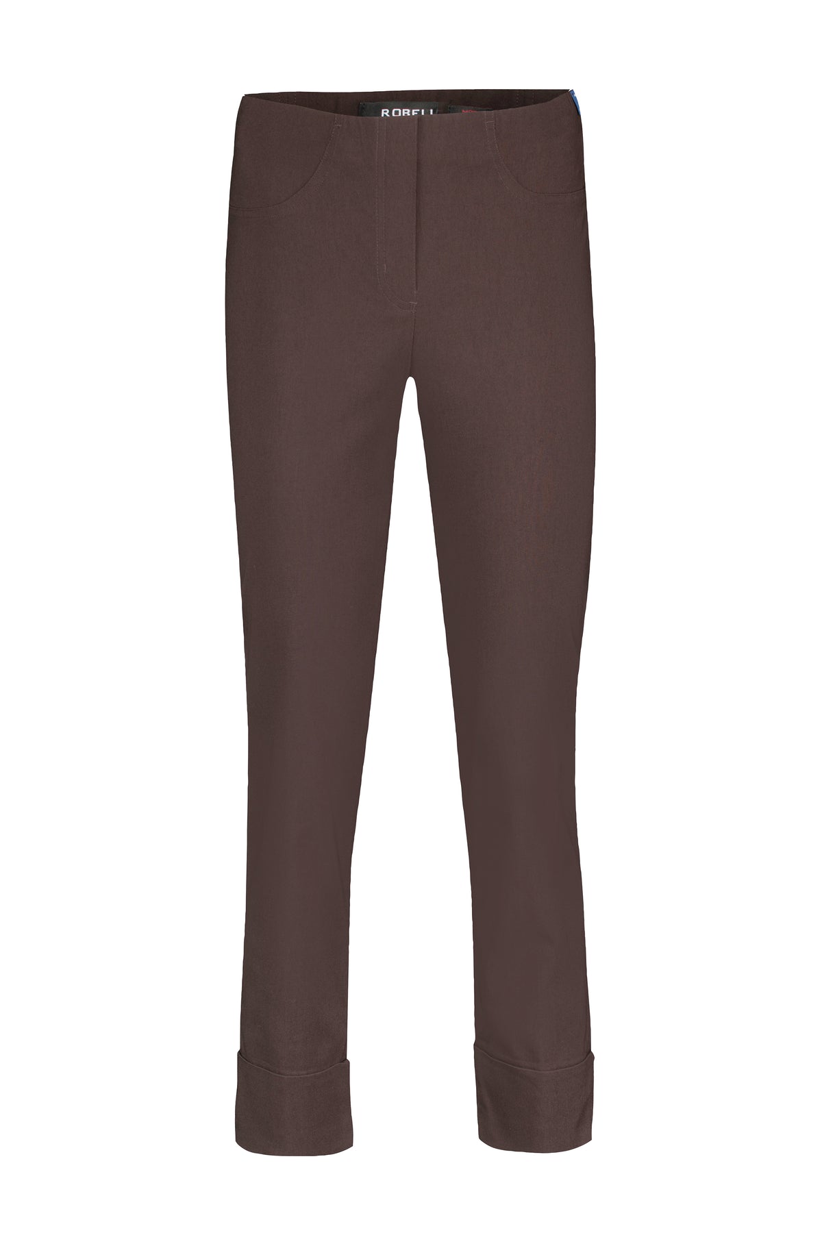 Robell súperþægilegar strechbuxur með teygju í mittið og föstu uppábroti, rennilásaklauf að framan, en það er bara fyrir útlitið, eins eru saumar fyrir vasa, en þær eru vasalausar að framan en með ágætum rassvösum. Saumar niður skálmar að aftan gefa skemmtilegt og sportlegt útlit. Flottar og þægilegar hversdagsbuxur sem sitja vel, góðar stærðir og mikið strech í efni. Síddin er ca 68 cm og henta vel sem síðbuxur fyrir konur sem þurfa styttri sídd