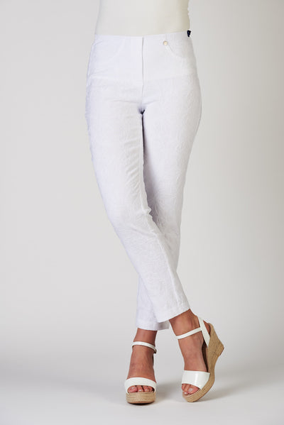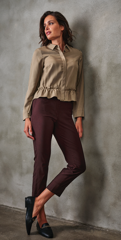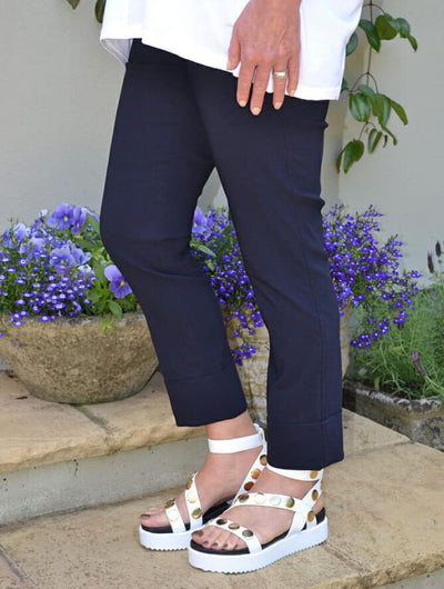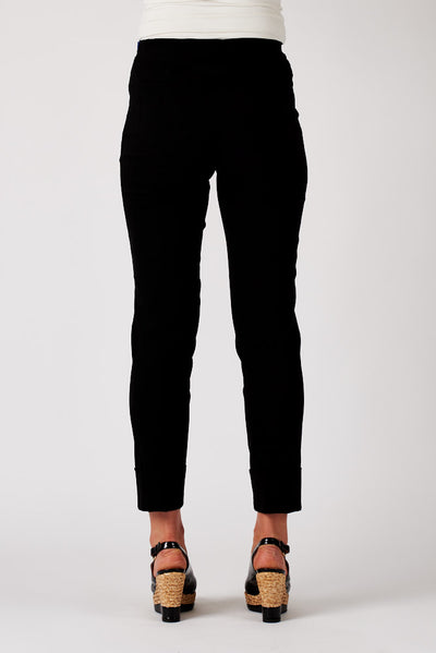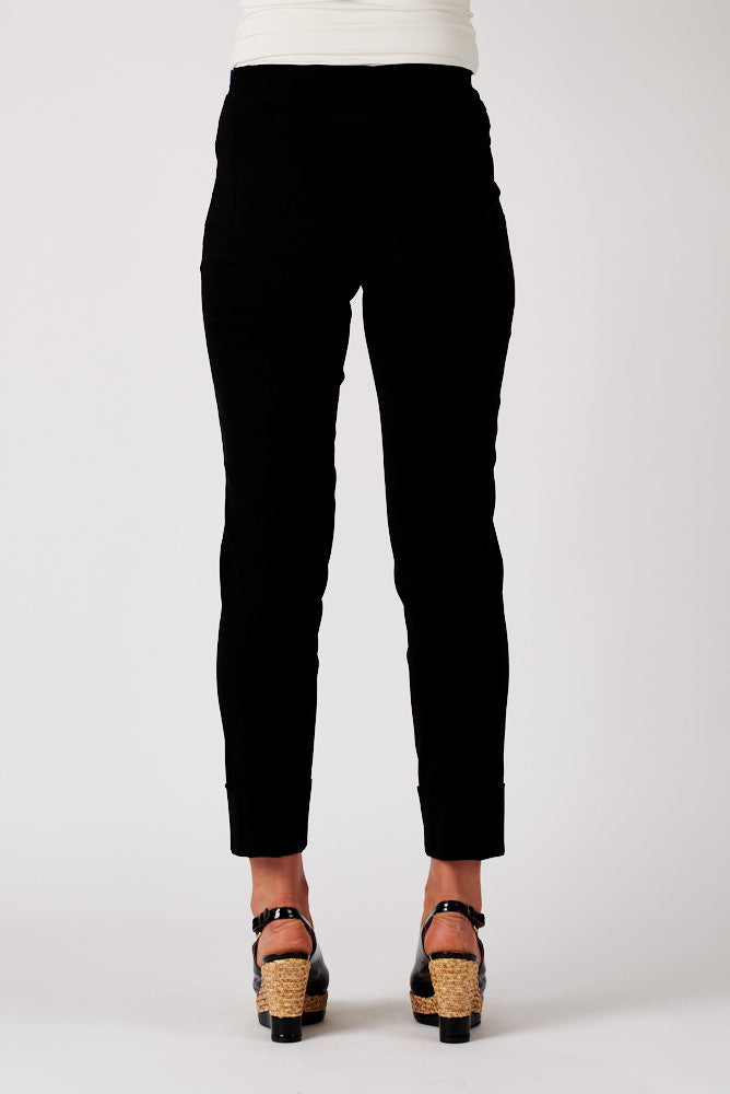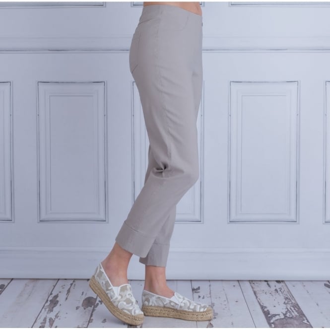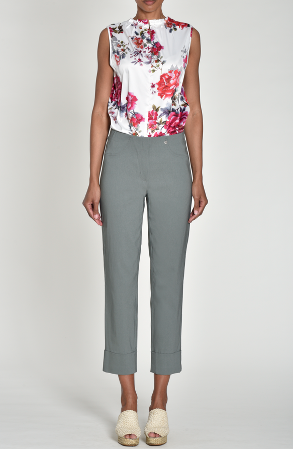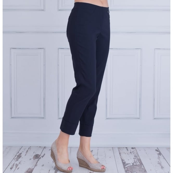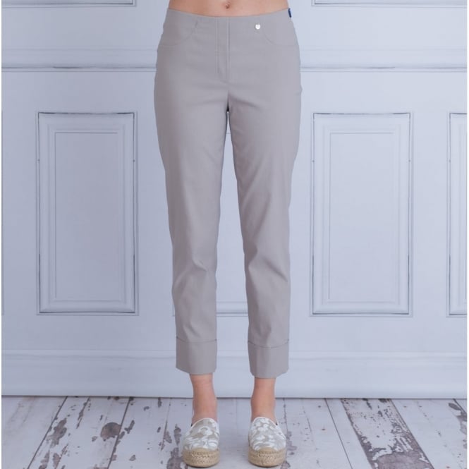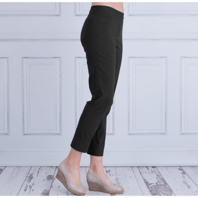 Robell súperþægilegar strechbuxur með teygju í mittið og föstu uppábroti, rennilásaklauf að framan, en það er bara fyrir útlitið, eins eru saumar fyrir vasa, en þær eru vasalausar að framan en með ágætum rassvösum. Saumar niður skálmar að aftan gefa skemmtilegt og sportlegt útlit. Flottar og þægilegar hversdagsbuxur sem sitja vel, góðar stærðir og mikið strech í efni. Síddin er ca 68 cm og henta vel sem síðbuxur fyrir konur sem þurfa styttri sídd