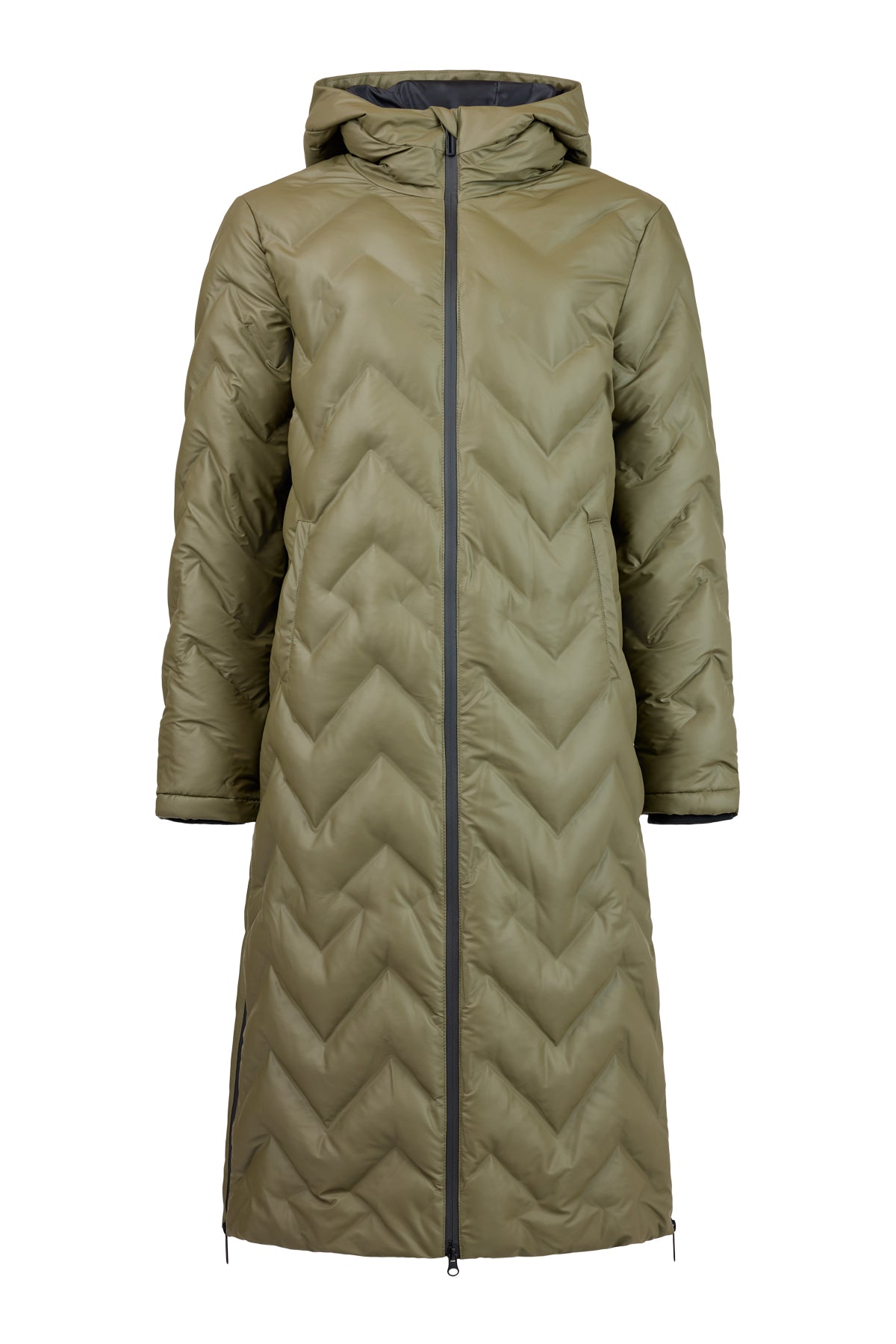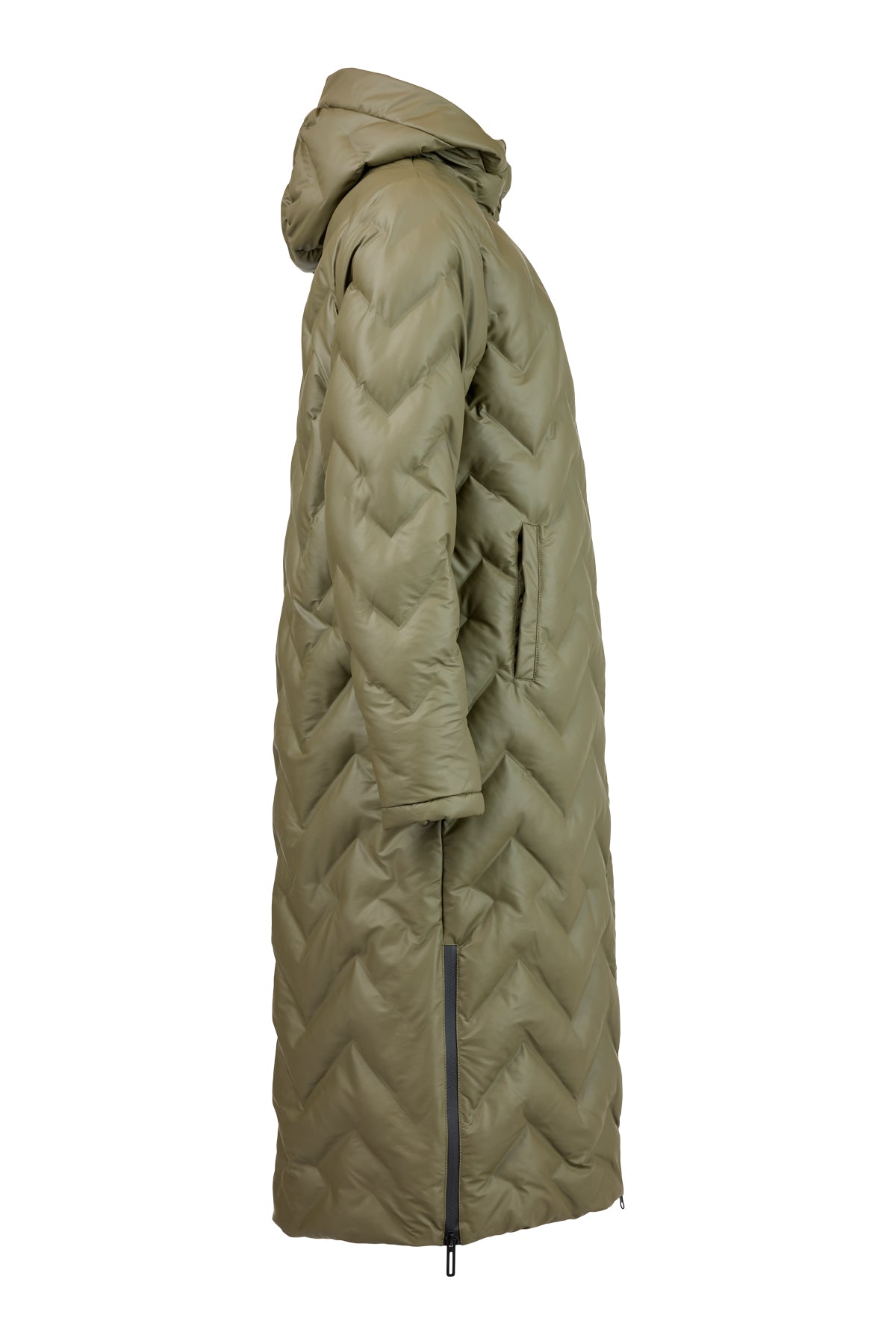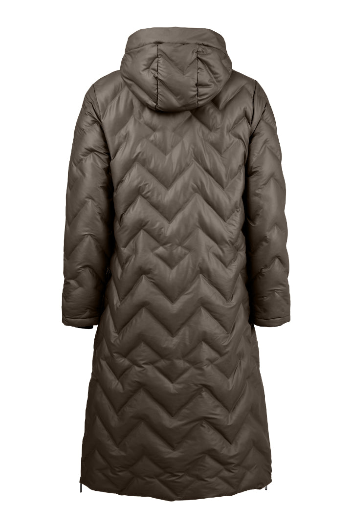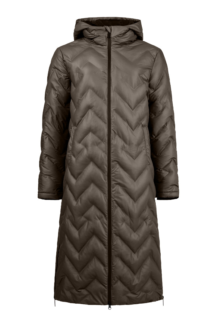 Normann - Carina regnjakki með tæknidún. Tvöfaldur rennilás að framan, áföst hetta, stroff fremst á ermum, rennilás á hliðum að neðan til að auka hreyfileika, góðir vasar að framan með smellum, innan á vasi með rennilás.