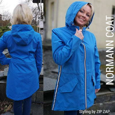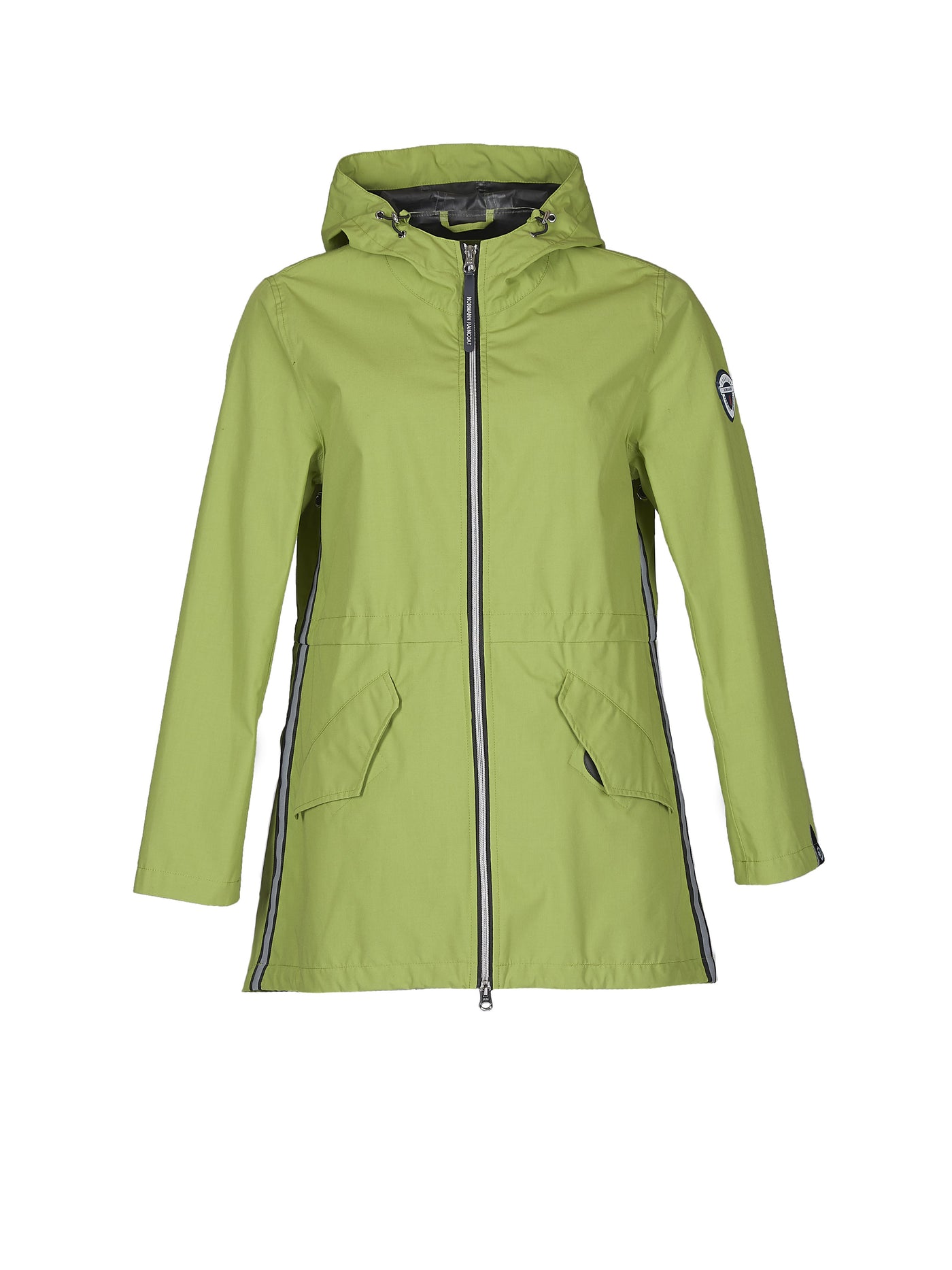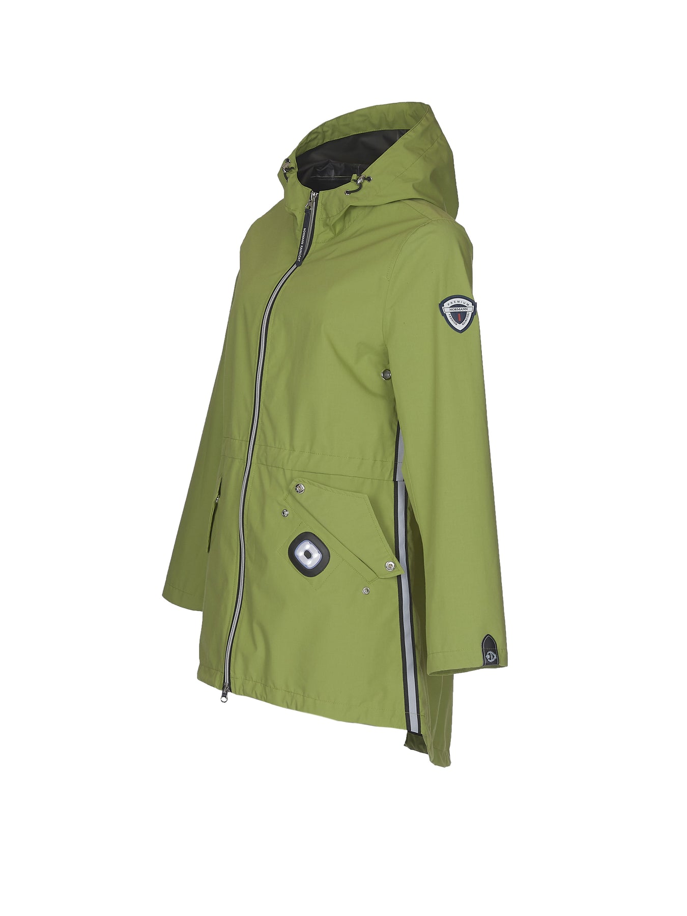 Normann regnjakki.  Þessi er vatnsheldur og vindheldur.  Örlítið síðari að aftan með góða fasta hettu. Bjartir litir, endurskinsrendur á hliðum og hlaðanlegt LED ljós hjá vasa eykur öryggi þitt í myrkrinu.