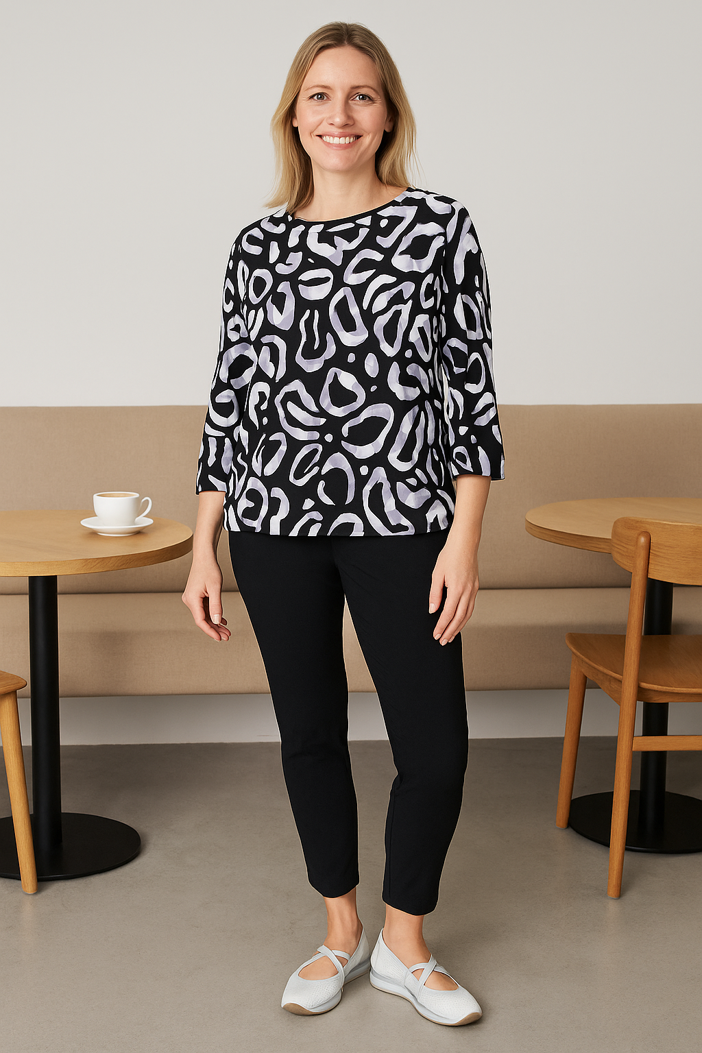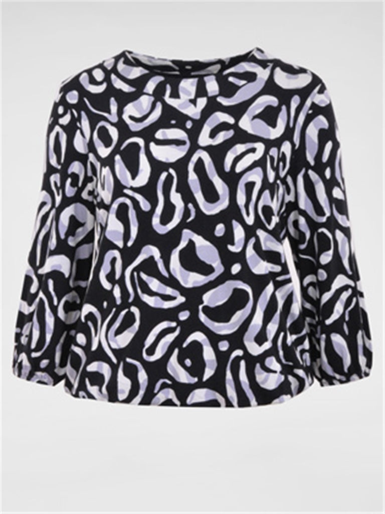 Navigazione - Elke mynstraður bolur. Svartur í grunninn með hvítu mynstri, teygja neðst, rúnað hálsmál og kvartermar með teygju neðst.