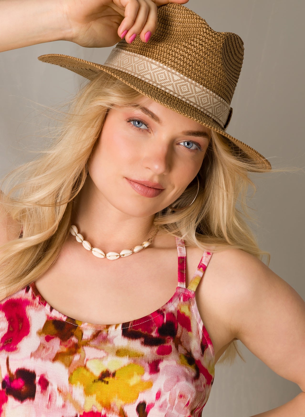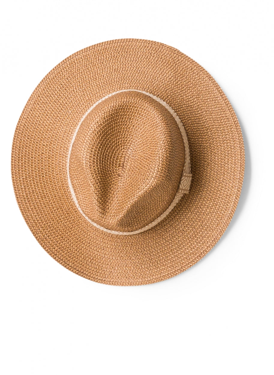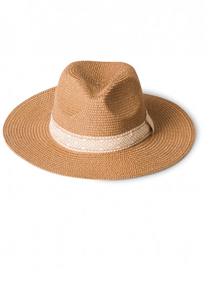 YestA - Maylah, Léttur og þægilegur stráhattur sem veitir góða sólarvörn í hlýju loftslagi. Hatturinn kemur í einni stærð en aðlagar sig auðveldlega að þinni höfuðstærð með földum strengjaböndum að innanverðu. Hattaband með mynstri sem gefur flott útlit.