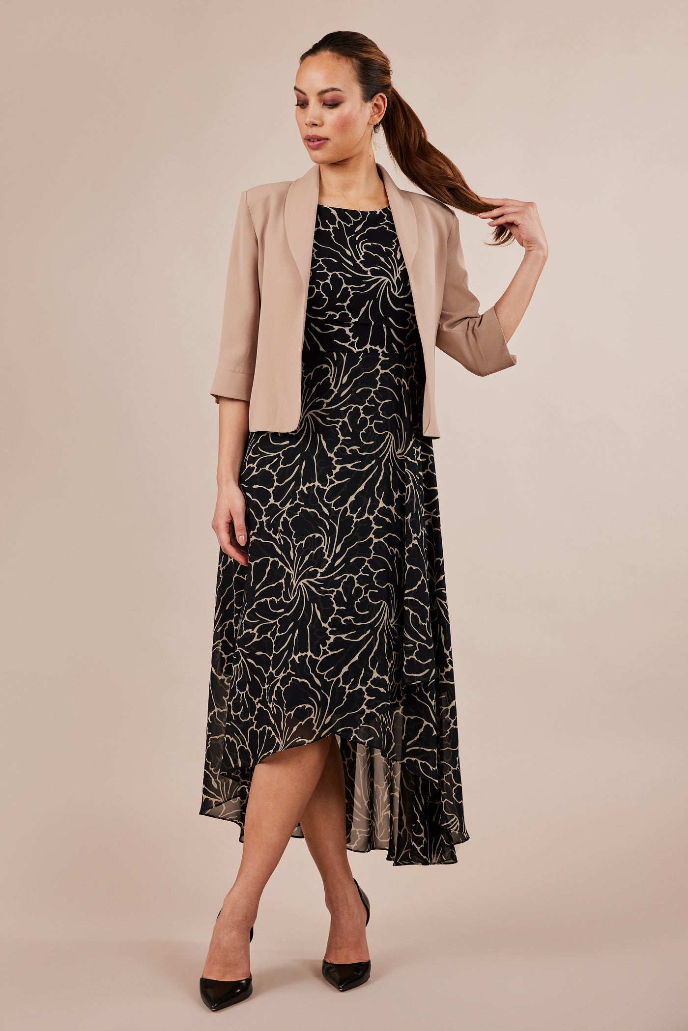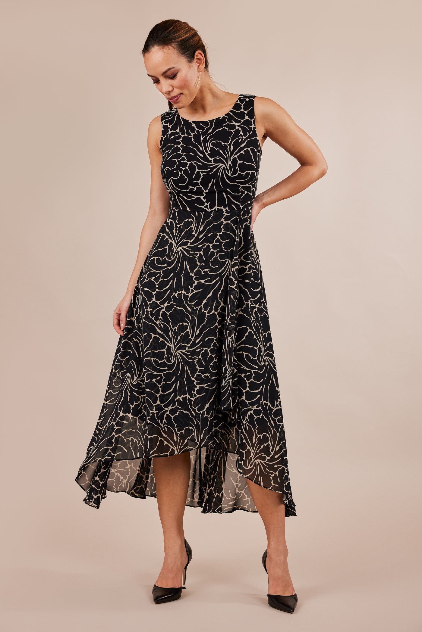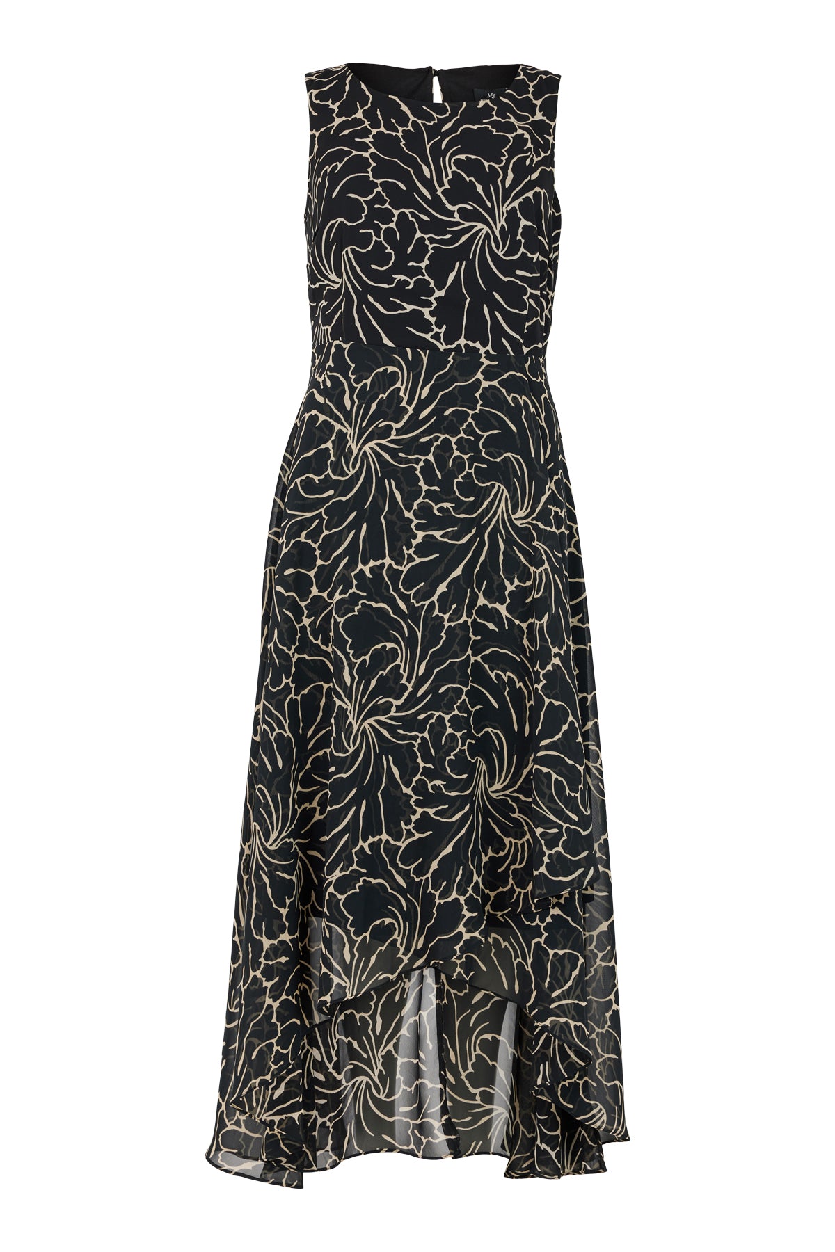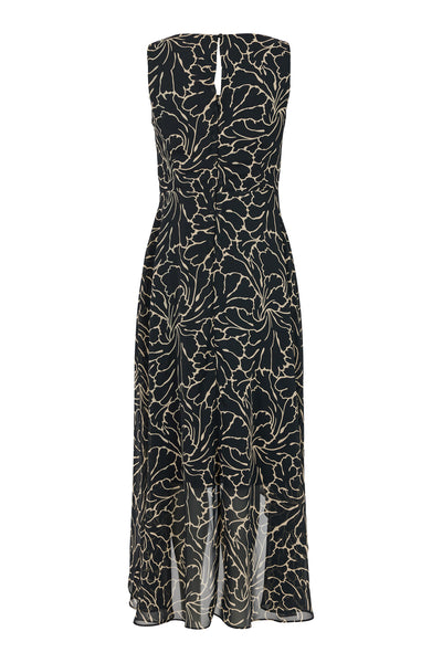Molly Jo - Flottur og vandaður ermalaus kjóll, svartur í grunnunn með beige lituðu mynstri. Áfastur undirkjóll. Rennilás og tala að aftan. Fullkominn í veislurnar.