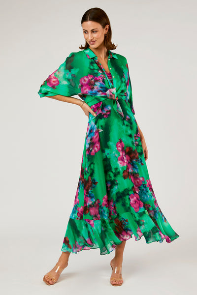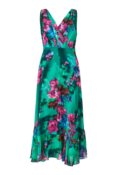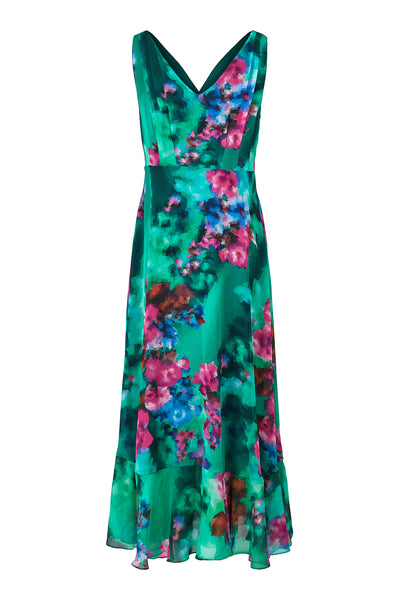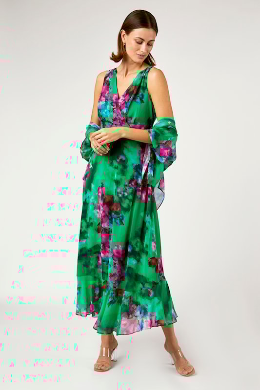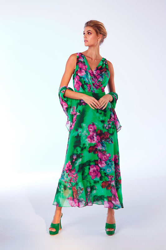 Molly Jo - Flottur og vandaður grænn kjóll með bleikum blómum, rennilás á hlið. Slæða í stíl fylgir með. Áfastur undirkjóll. Fullkominn í veislurnar.