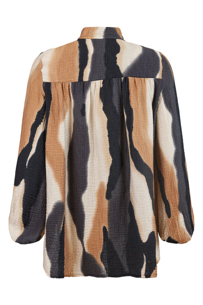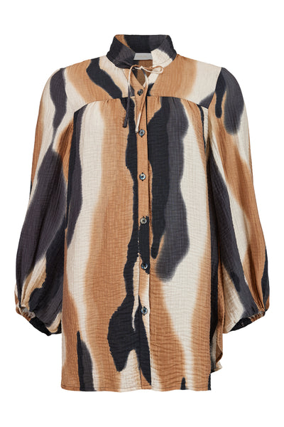 Noen - Kaori skyrta er flott og vönduð langerma skyrta úr þægilegri viskose blöndu, hneppt niður að framan, V-hálsmál og kínakragi með bandi, rúnuð að neðan með smá klauf á hliðum.
