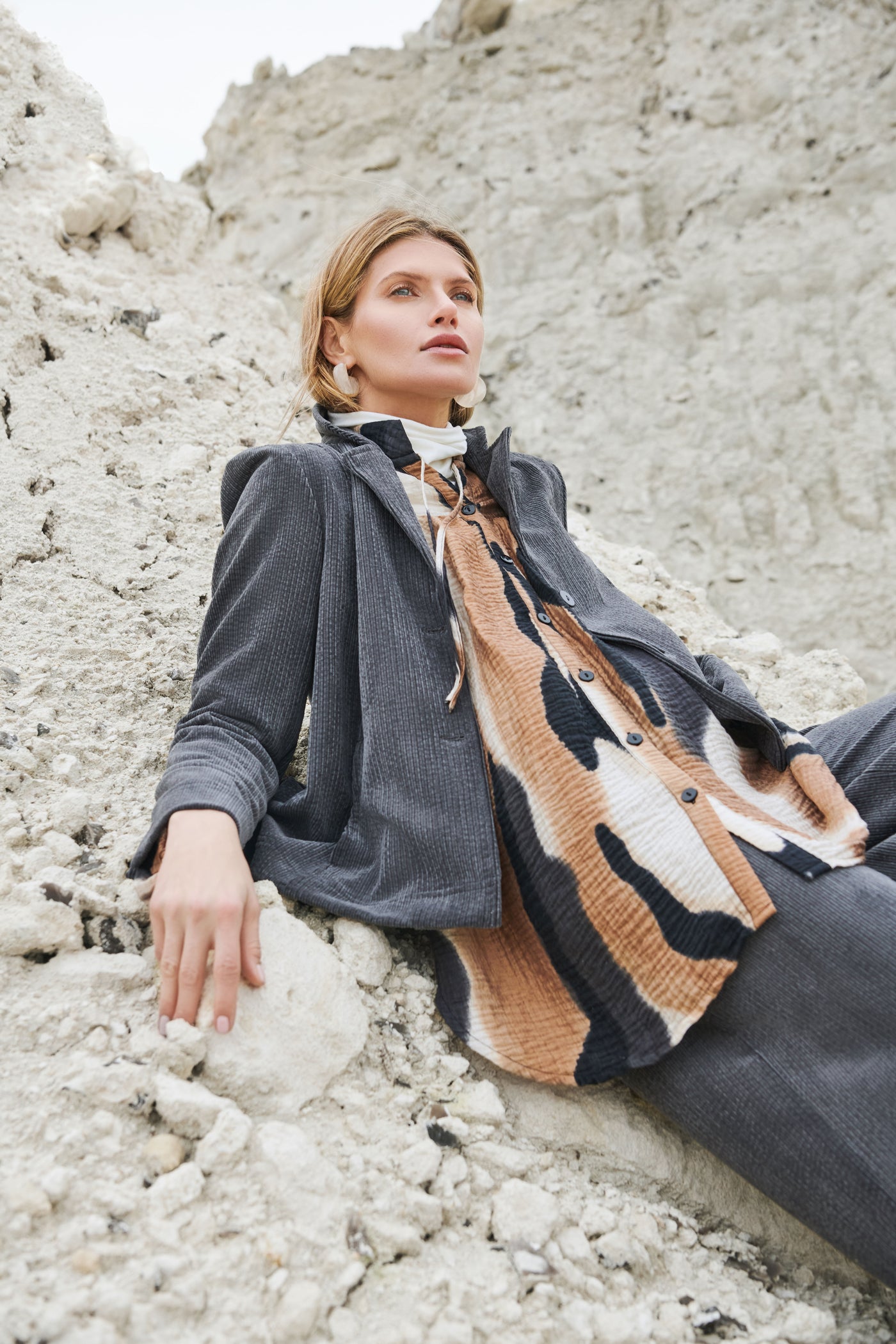 Öll mál eru tekin beint á líkamanum. Mælingarnar miðast við meðalhæð upp á 170 cm. Við mælum með að þú hafir einn fingur milli líkama og málbandar – þannig tryggirðu að flíkin sitji þægilega án þess að þrengja að.