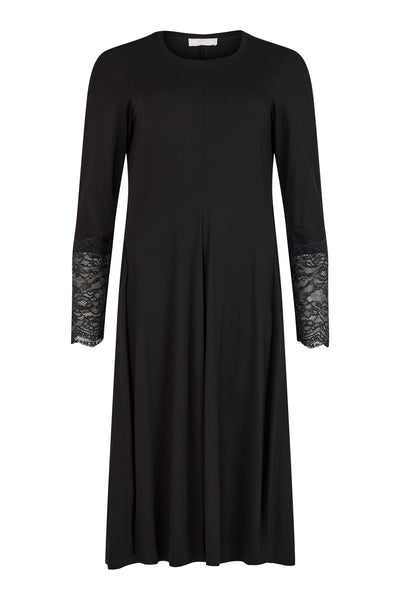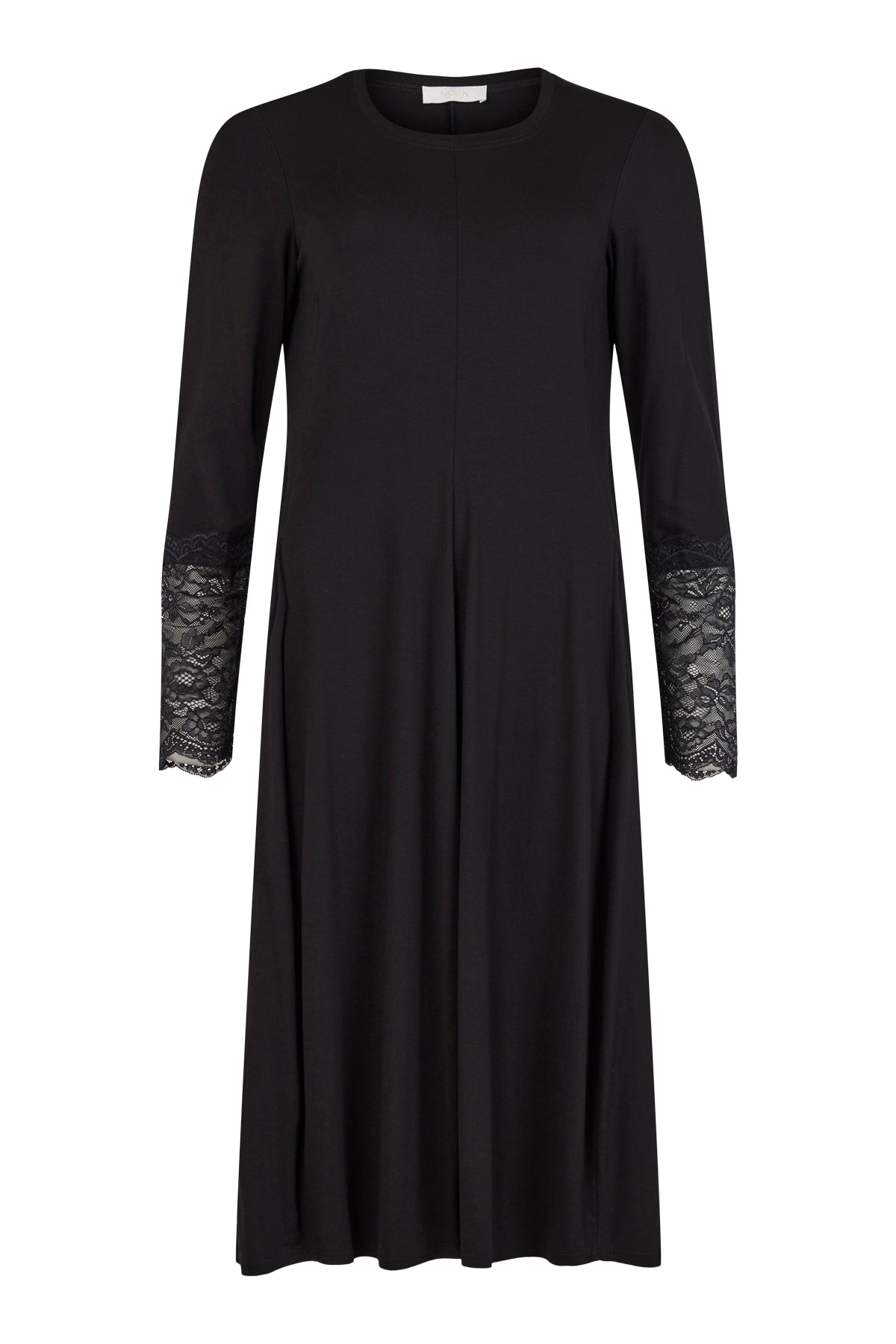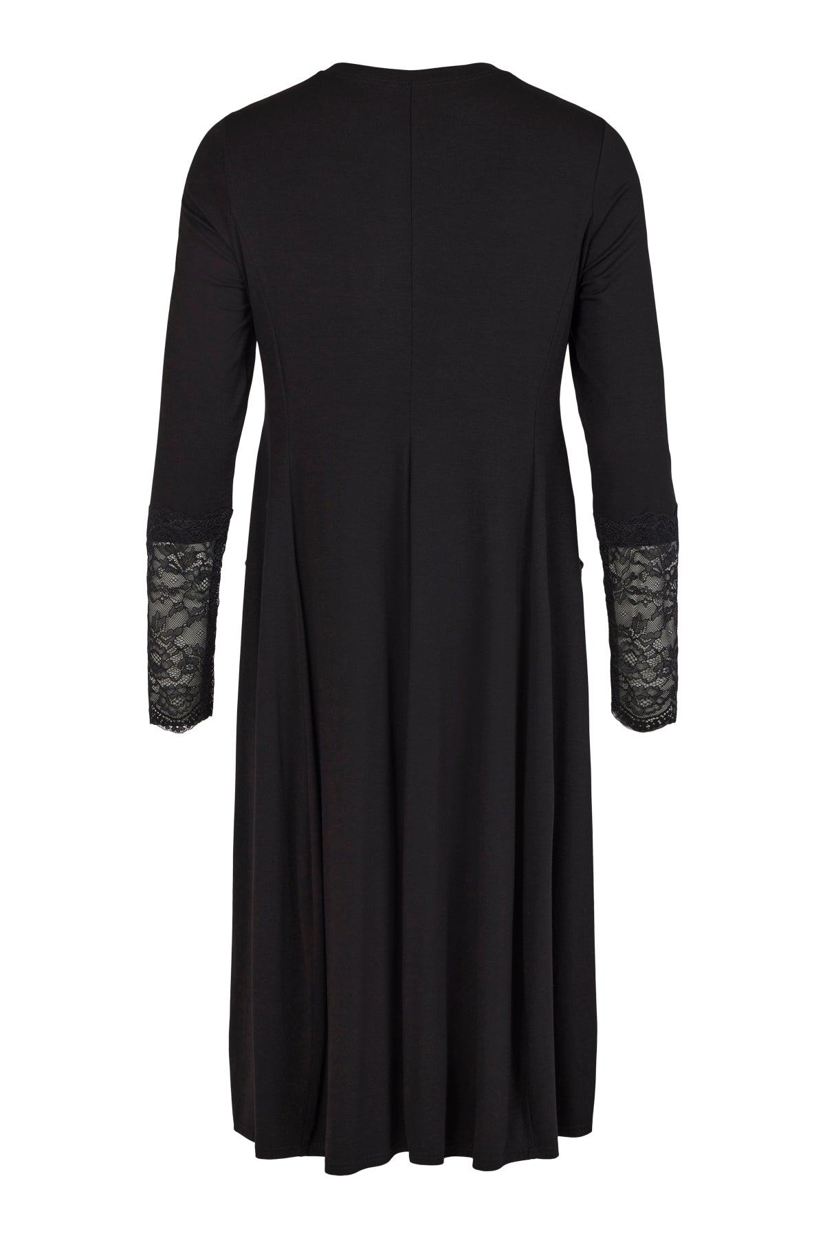 Látlaus hálfsíður langerma kjóll frá Q'neel/Noen, með rúnuðu hálsmáli, góðum vösum og blúndu á ermum.