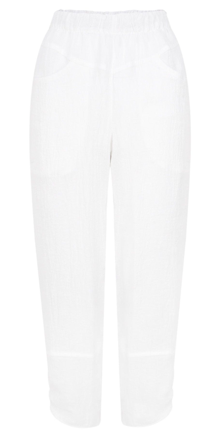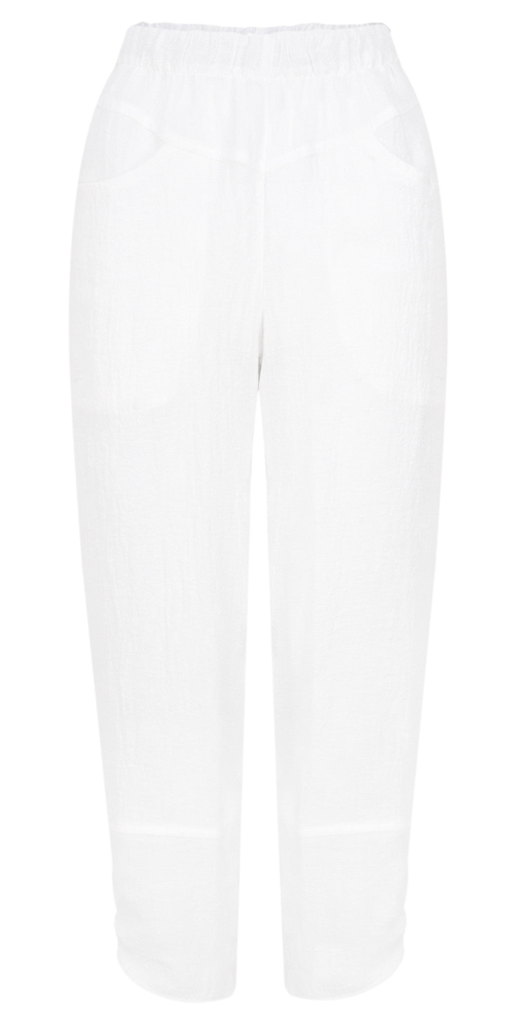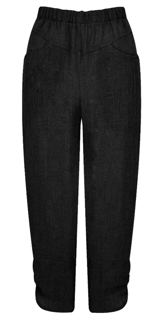 Q'neel - Bonnie, léttar og þægilegar hör ökklabuxur, teygja í mitti og vasar að framan. Saumur þvert yfir að framan þar sem opnast svo fyrir vösum. Einnig saumur yfir á skálm, 15 cm frá fald. Rennilás neðst á skálm.