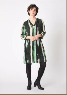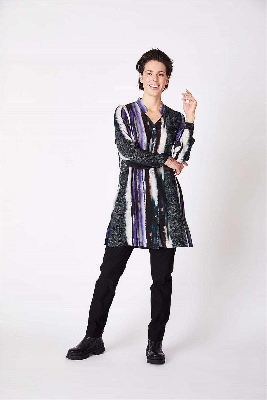 Léttur og þægilegur skyrtukjóll, frá Q'Neel, V- hálsmál, síðar ermar og klauf upp í hliðar, fallegar skeljatölur sem gefa skemmtilegt lúkk. Hentar bæði hversdags og spari Rúmar stærðir, sídd ca 94 cm.