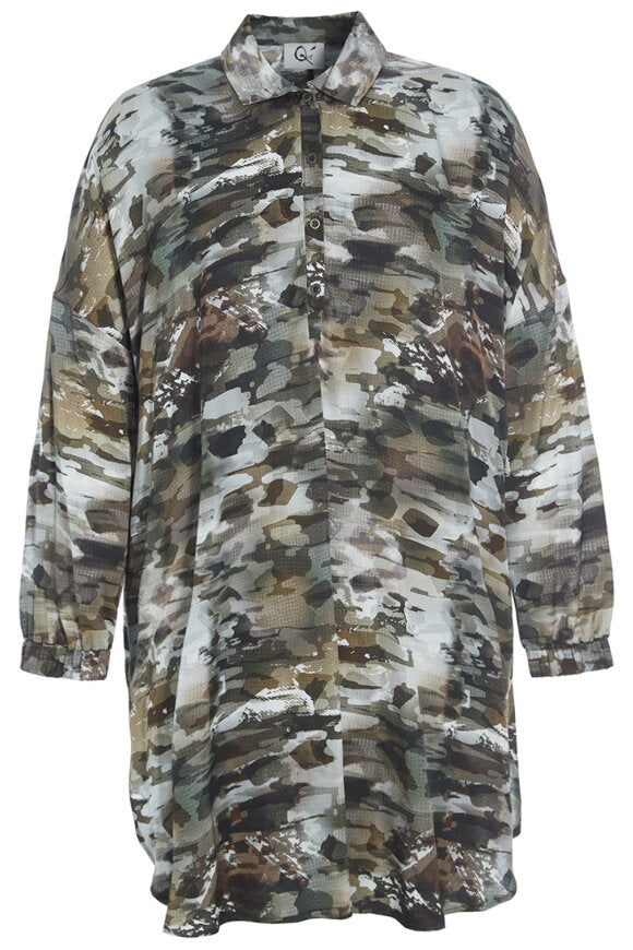 Que - Súpersætur skyrtukjóll, hnepptur hálfa leið niður, síðar ermar með smá teygju fremst Rúnaðar í hliðum með smá klauf uppí og aðeins meiri sídd að aftan.