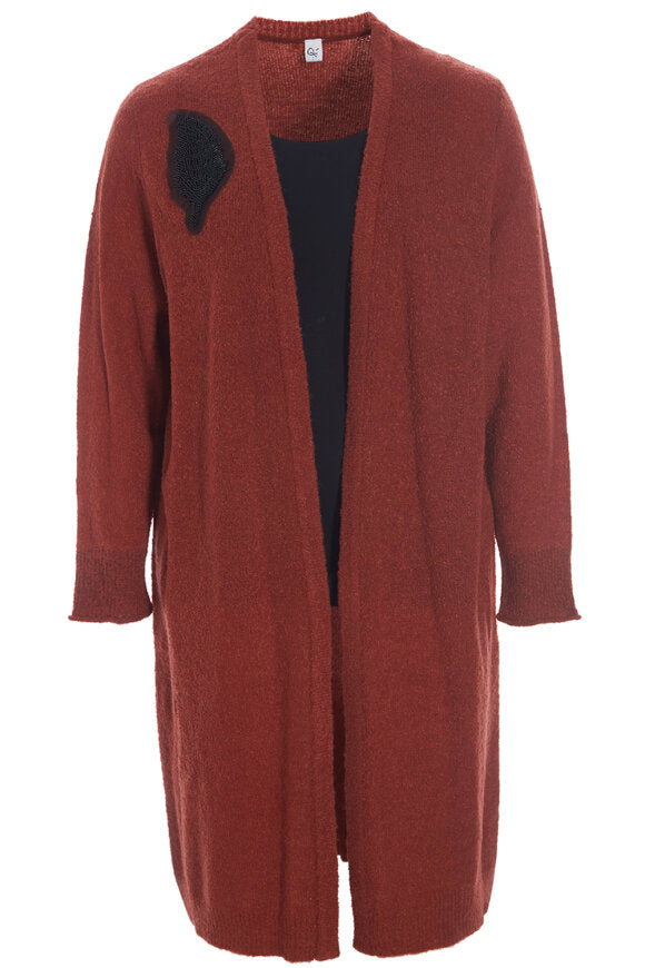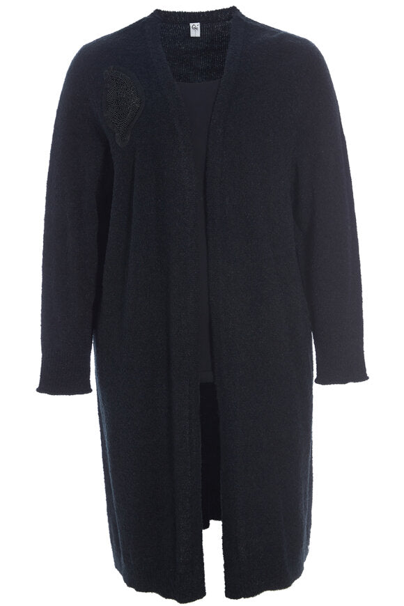 Que -Falleg opin prjónapeysa úr góðu ullarblönduðu efni,sætt perluskraut á hægri bringu.
