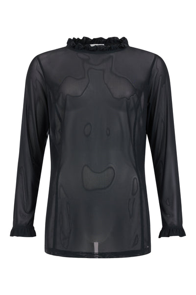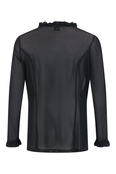 Que - Langermabolur úr fínlegu og áferðarfallegu mesh efni, pífa á hálsmáli og ermum, saumar að framan og að aftan. Flottur undir allskonar kjóla og túnikur ef þú vilt breyta aðeins til og poppa upp eitthvað einfalt.