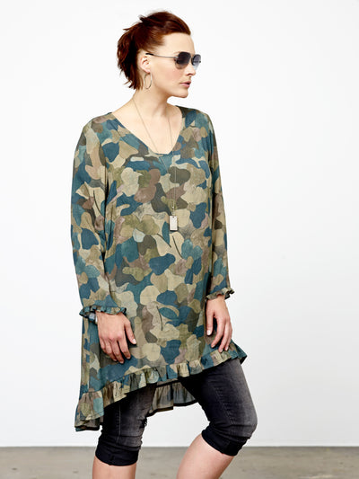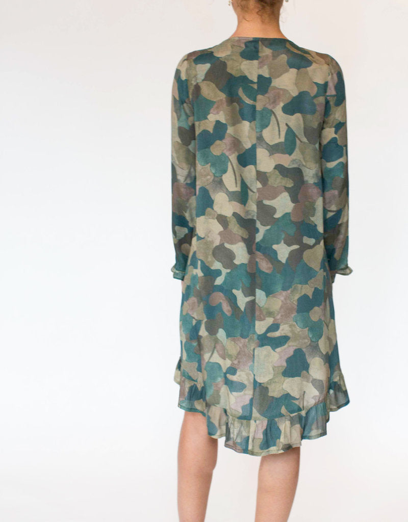 Que - Zariyah kjóll með V-hálsmáli, pífu neðst, langar ermar með smá pífu, aðeins síðari að aftan. Flottur og vandaður kjóll úr léttu viskose efni. Loose fit, passar vel hvar sem er, bæði hversdags og spari. Fullkominn í veislurnar framundan.
