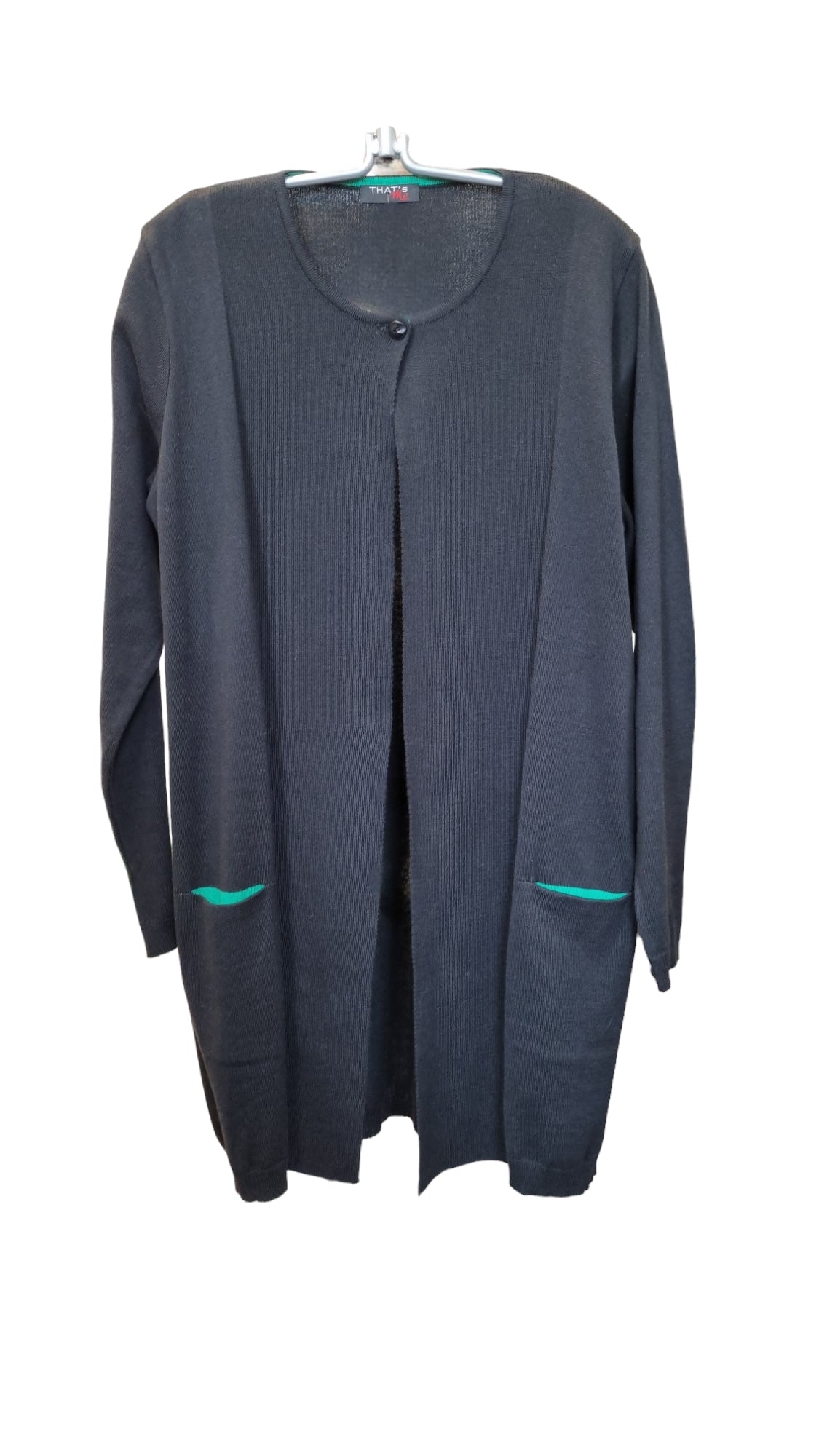 That's Me - Falleg og vönduð opin jakkapeysa með smá grænu til að poppa upp. Grænt inní vösum og inní hálsmáli Ámr hvítum saum á hliðum. Opin að framan með eina hneppu að ofan, er þokkalega síð og nær niður fyrir rass.