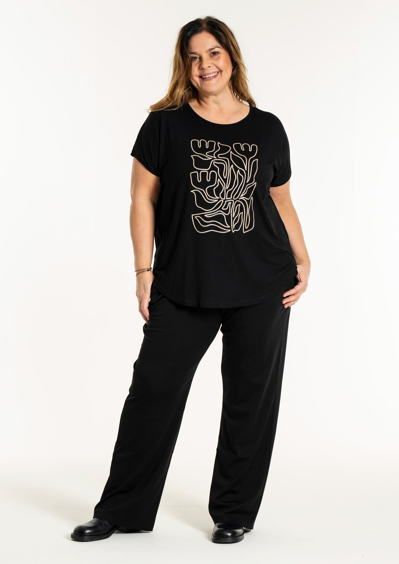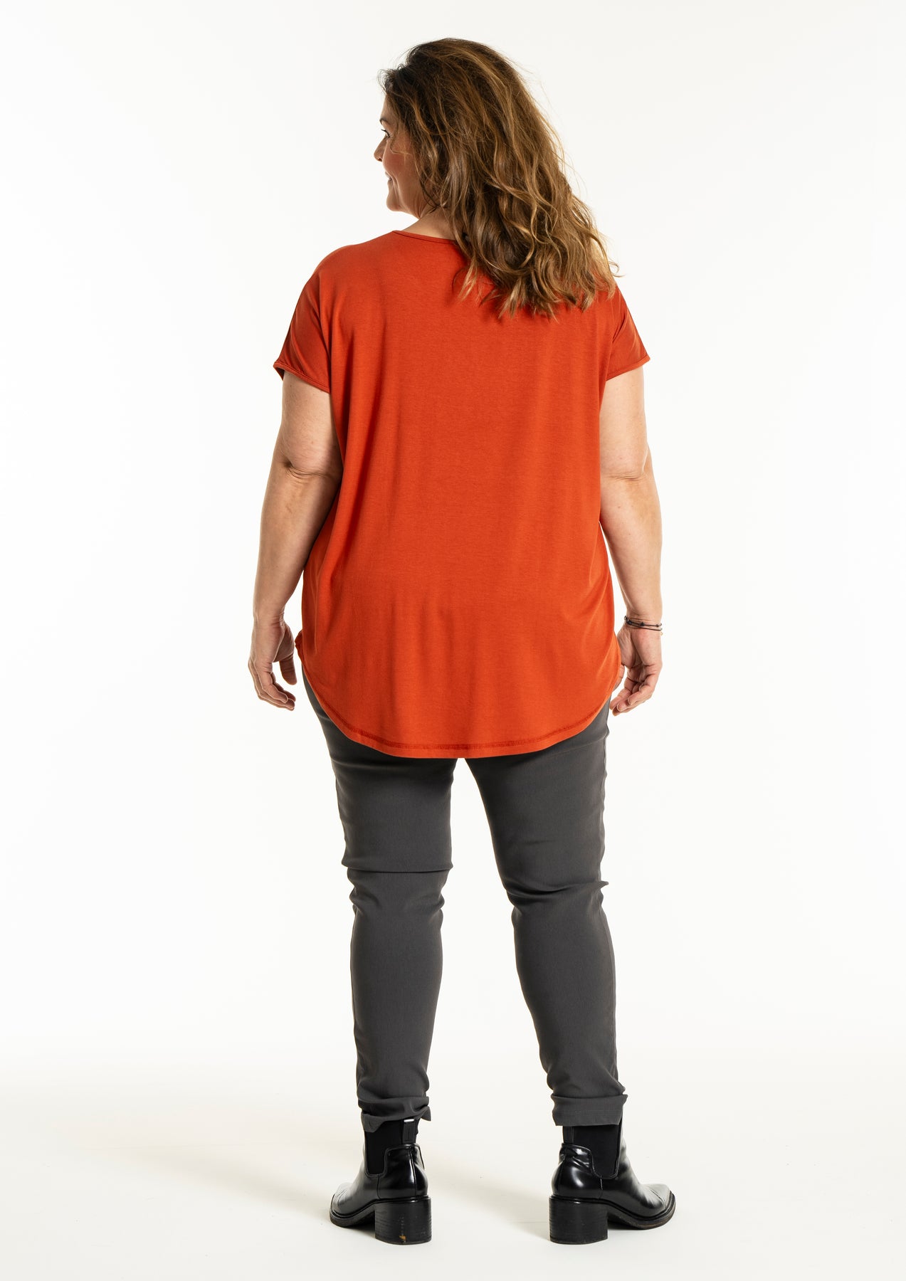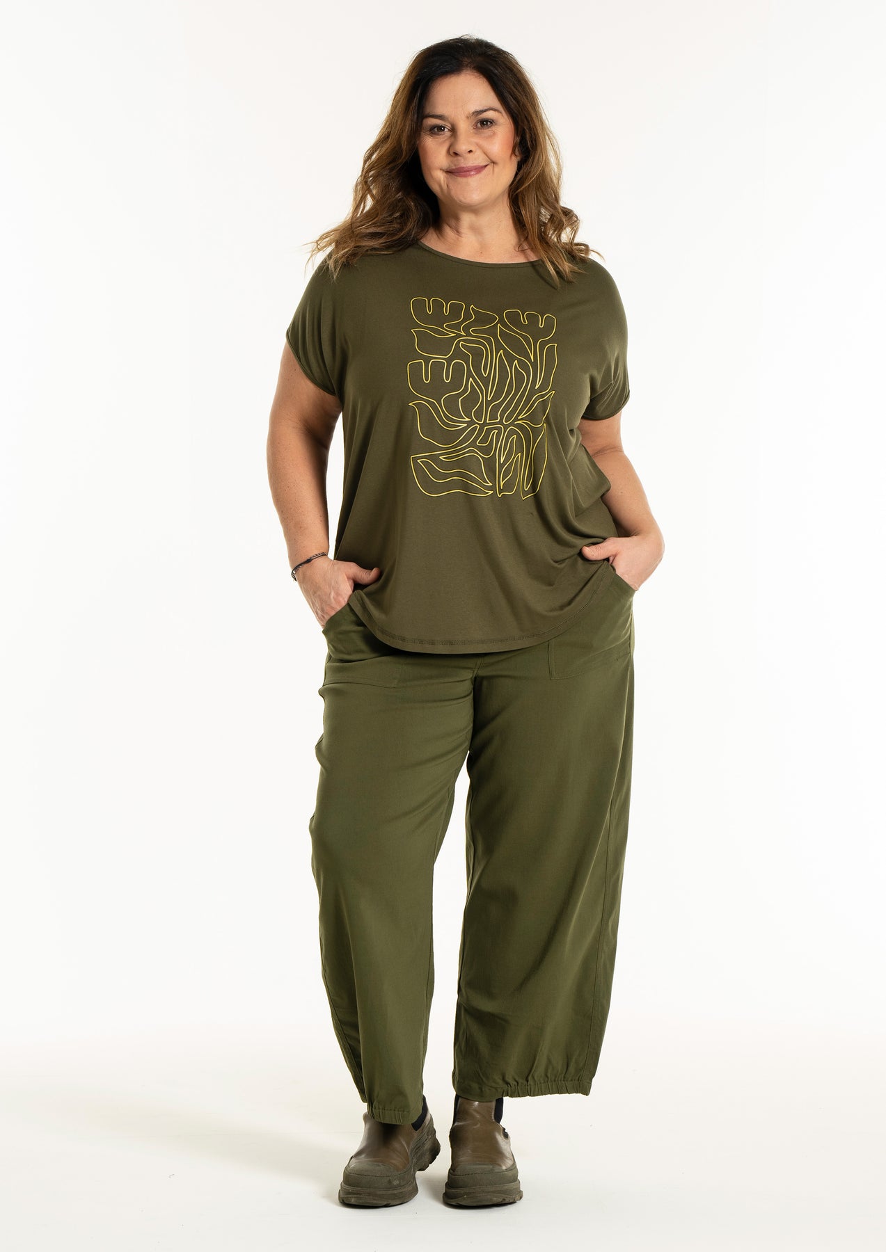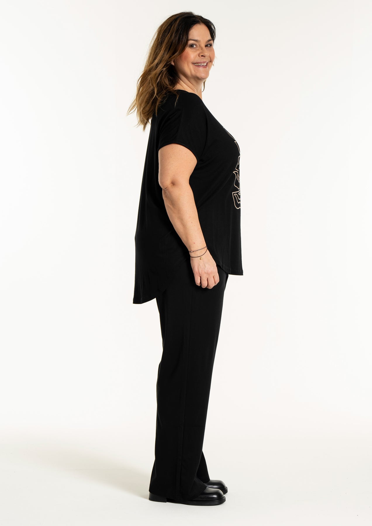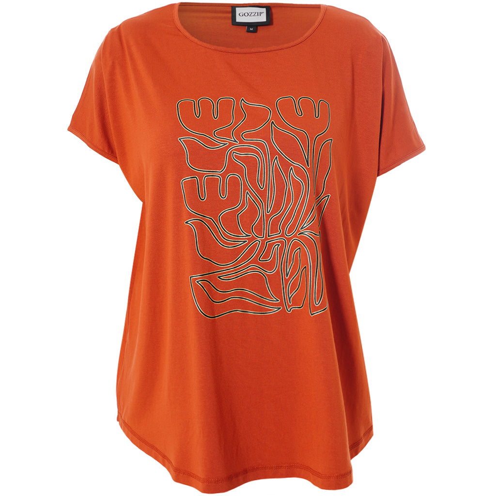 Gozzip - Gitte stuttermabolur með abstrakt blómamynstri. Bolurinn er úr góðu og þægilegu viskosefni, rúnað hálsmál, rúnaður að neðan og örlítið meiri sídd að aftan.