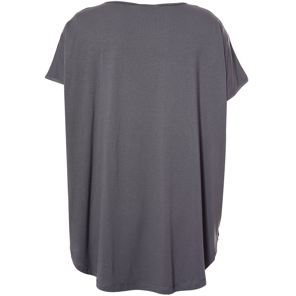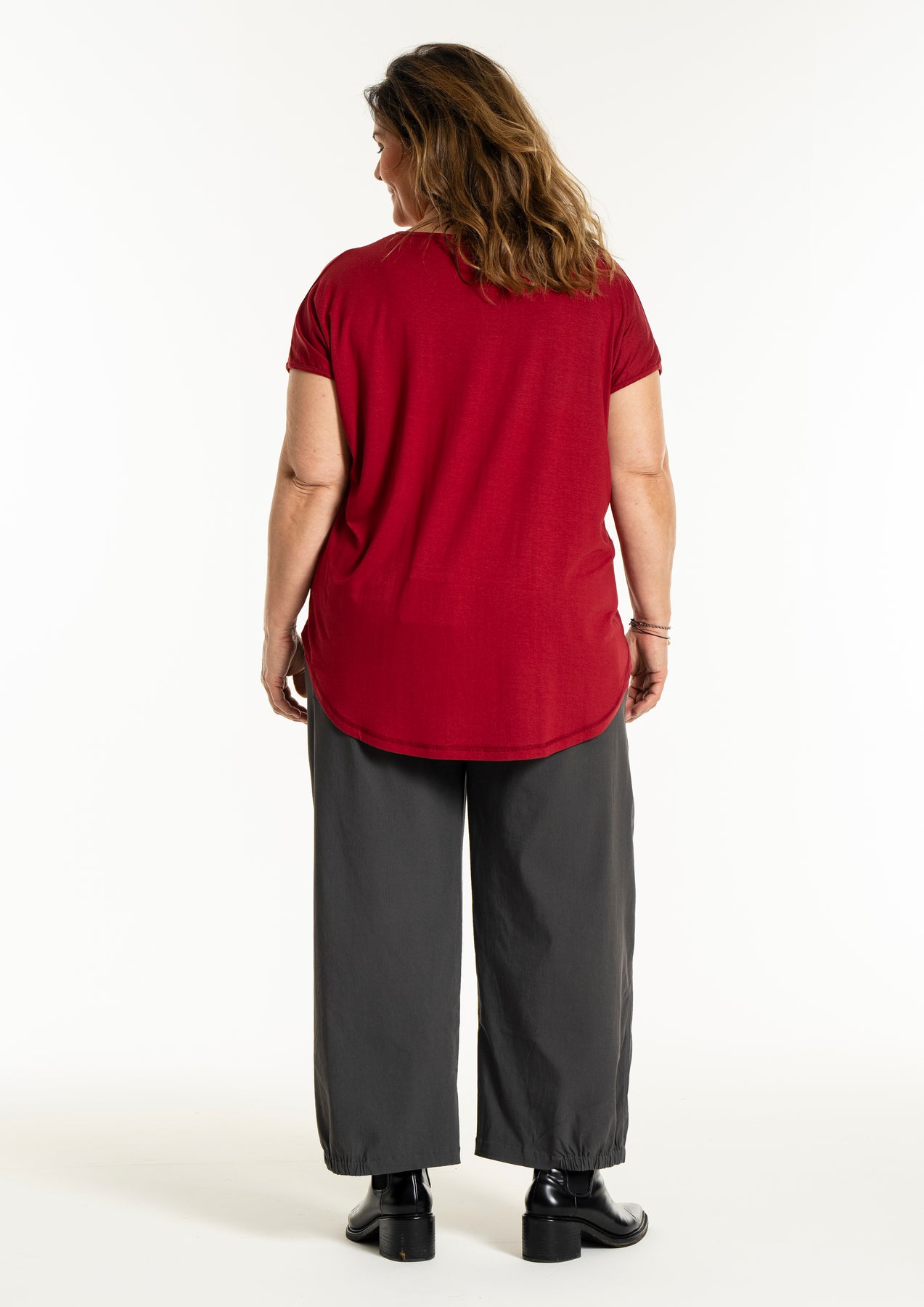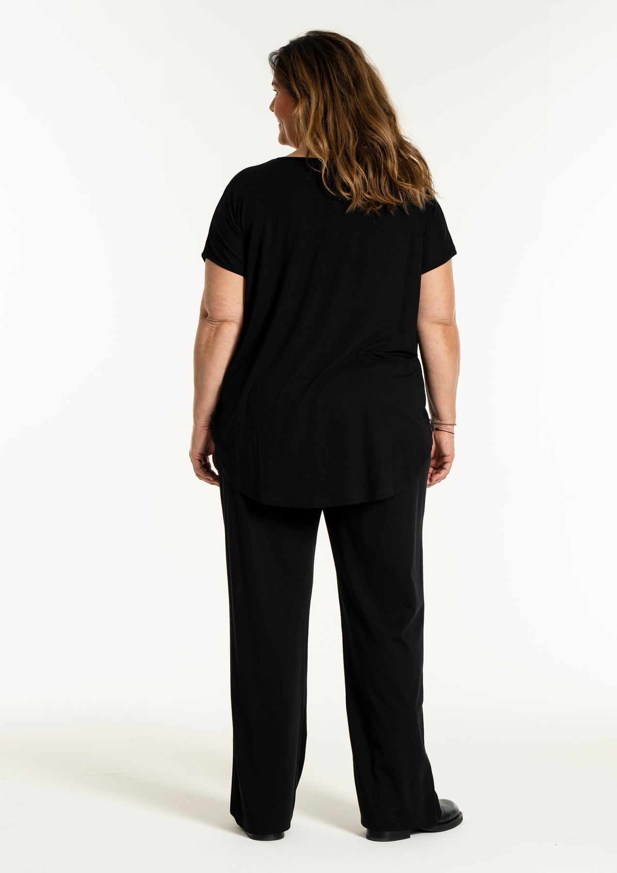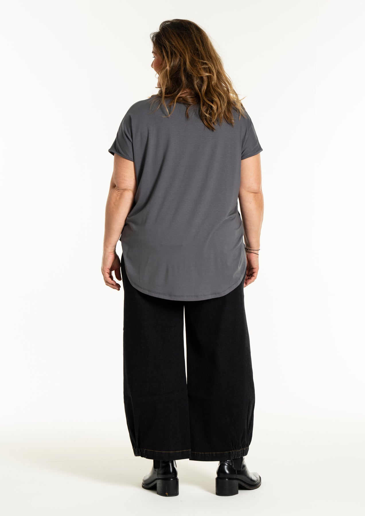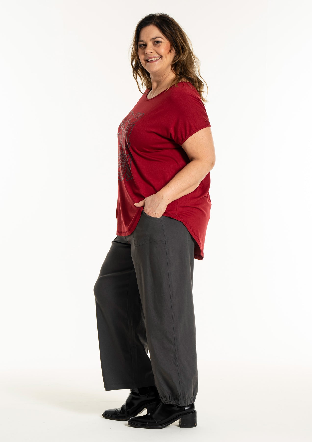 Gozzip - Gitte stuttermabolur með abstrakt blómamynstri. Bolurinn er úr góðu og þægilegu viskosefni, rúnað hálsmál, rúnaður að neðan og örlítið meiri sídd að aftan.