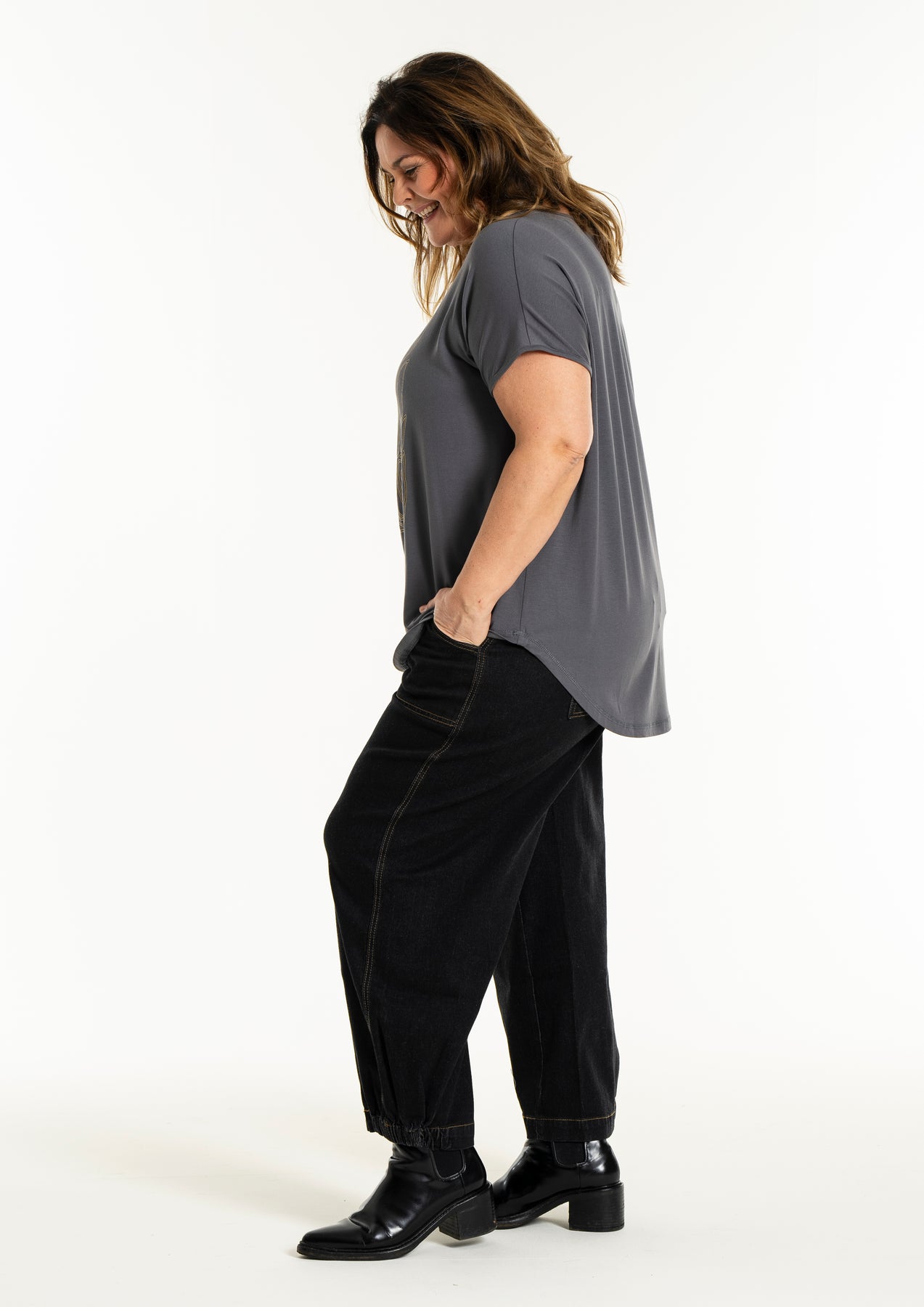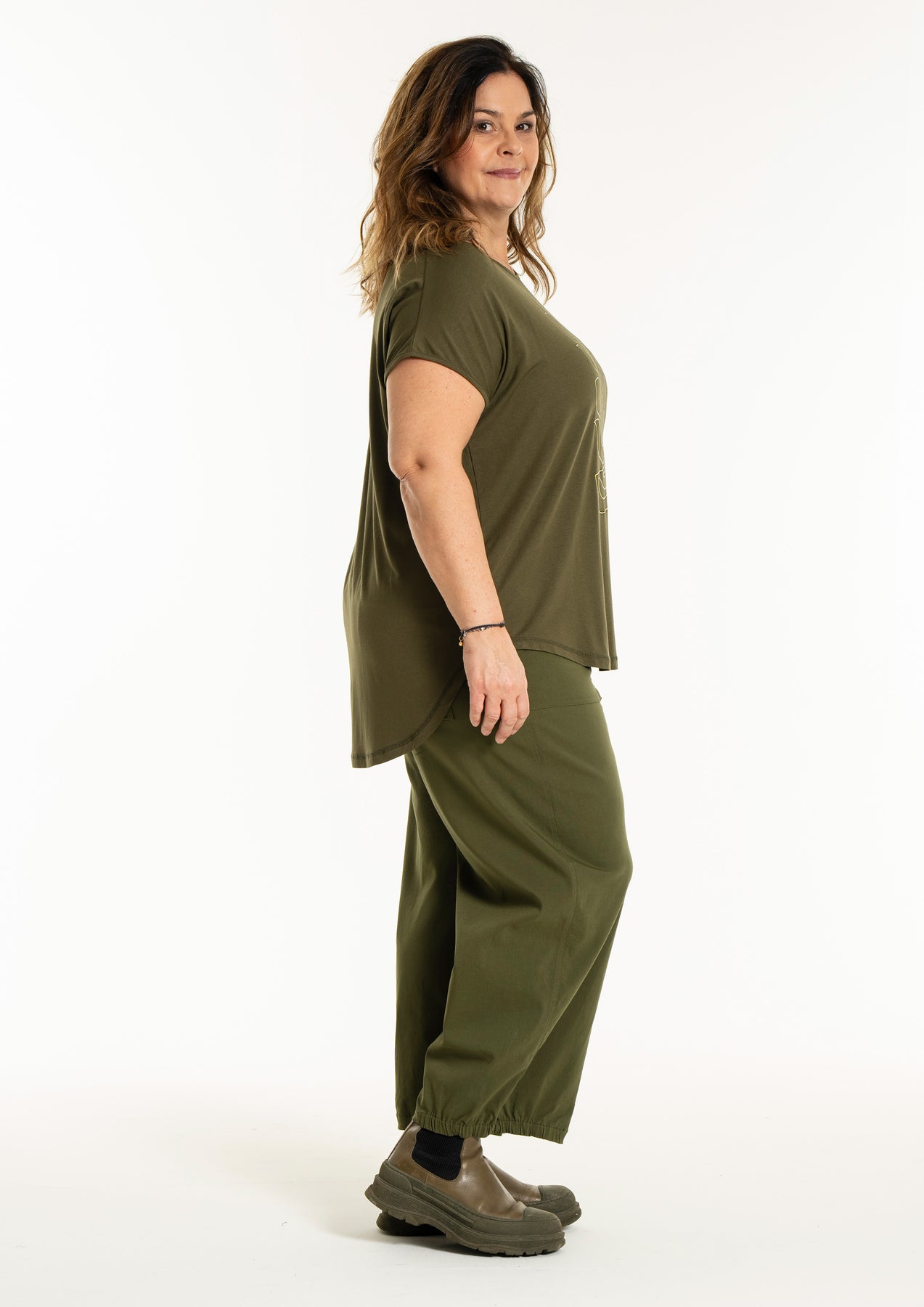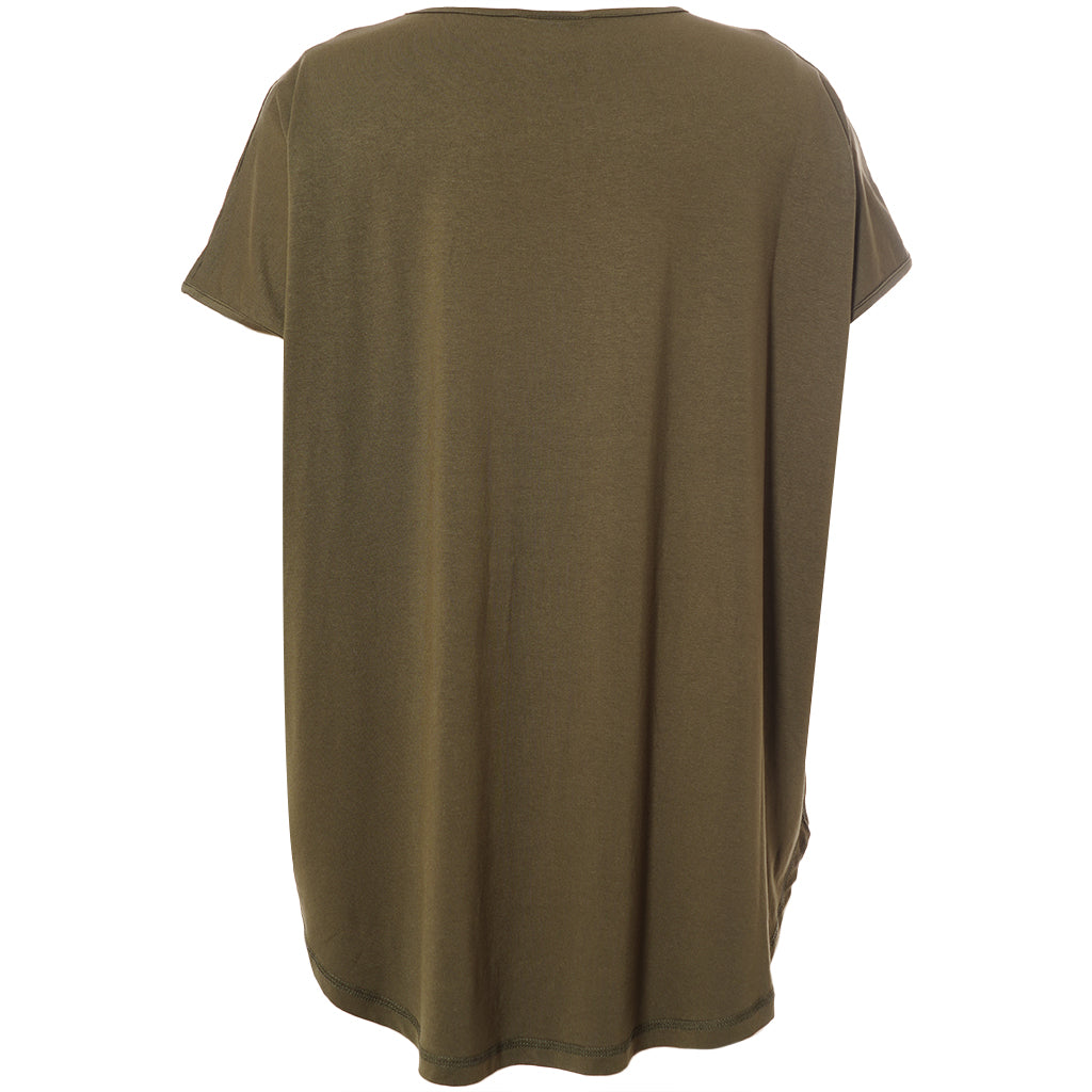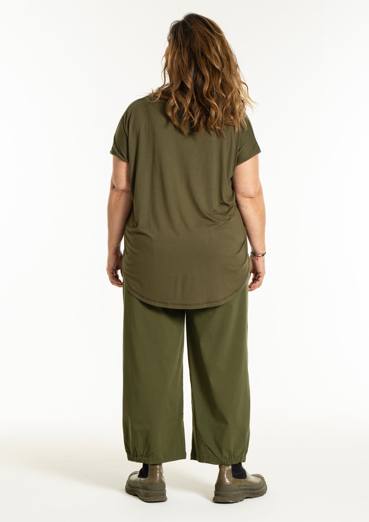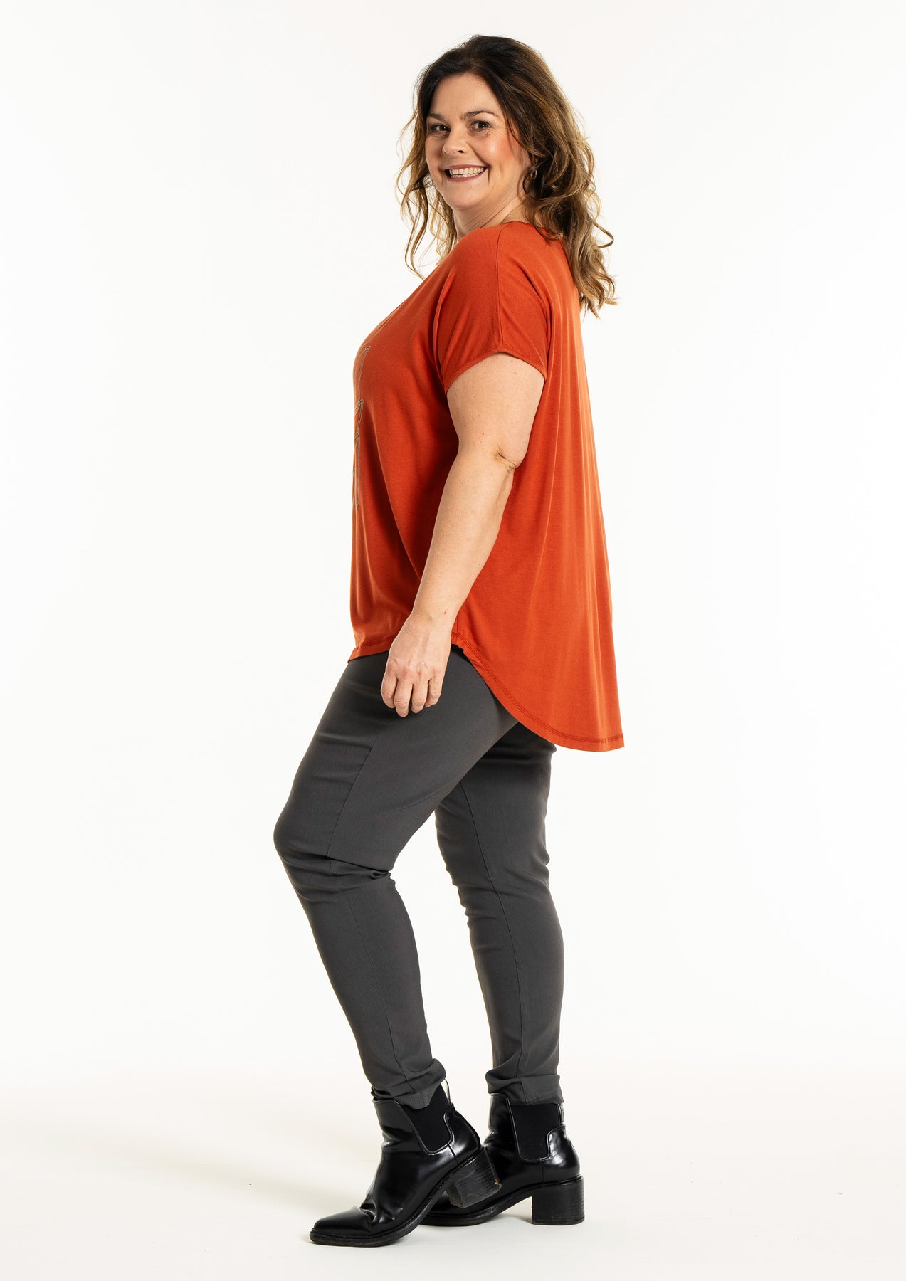 Gozzip - Gitte stuttermabolur með abstrakt blómamynstri. Bolurinn er úr góðu og þægilegu viskosefni, rúnað hálsmál, rúnaður að neðan og örlítið meiri sídd að aftan.