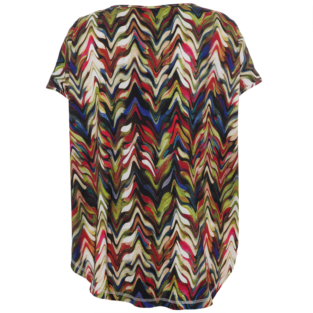Gozzip - Gitte stuttermabolur með litríku bylgjumynstri. Bolurinn er úr góðu og þægilegu viskosefni, rúnað hálsmál, rúnaður að neðan og örlítið meiri sídd að aftan.