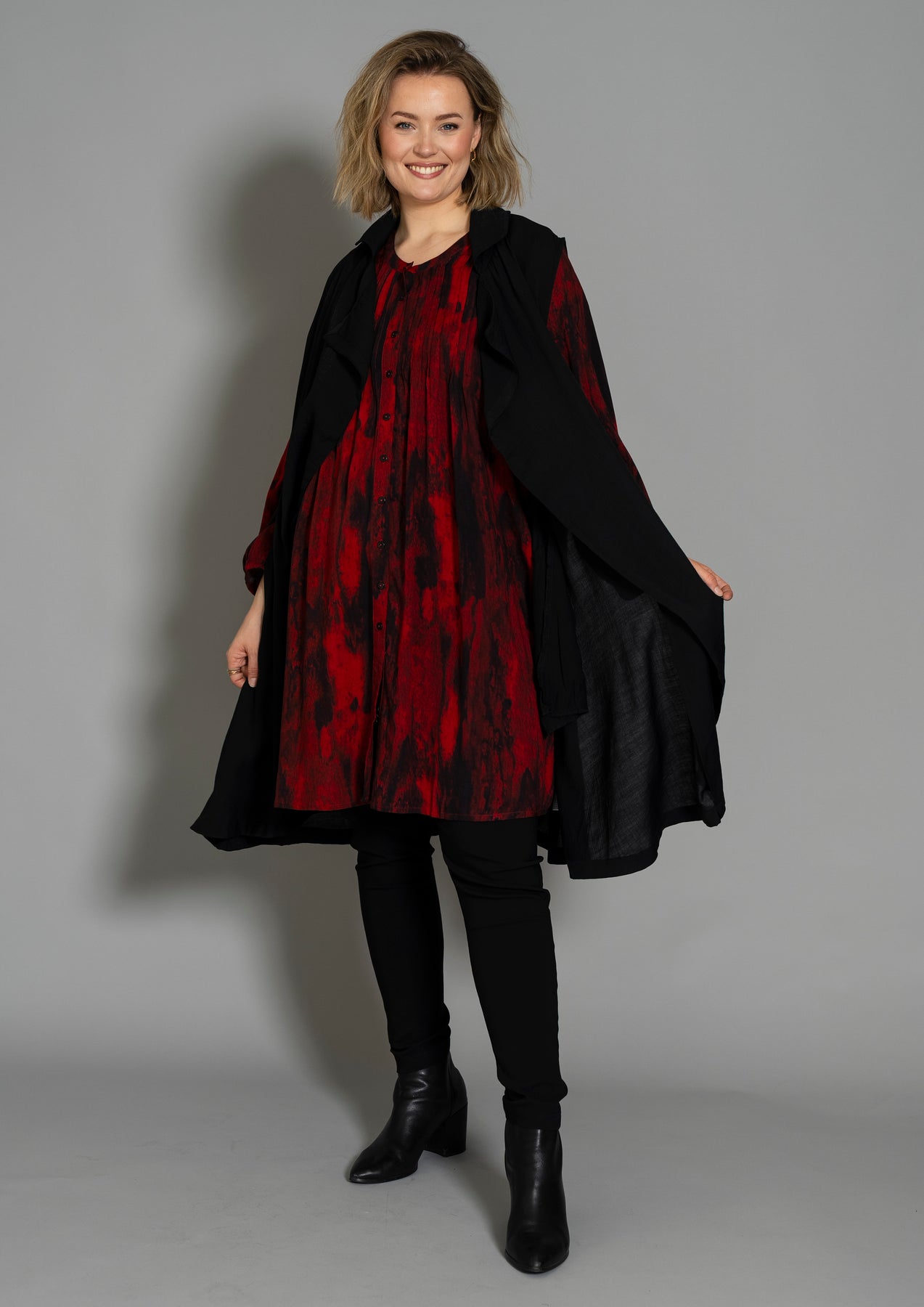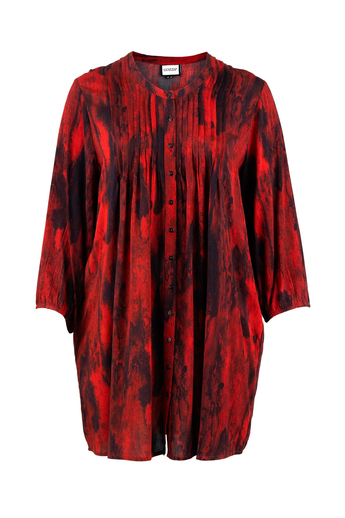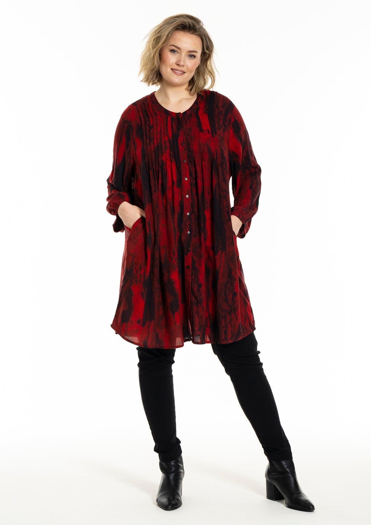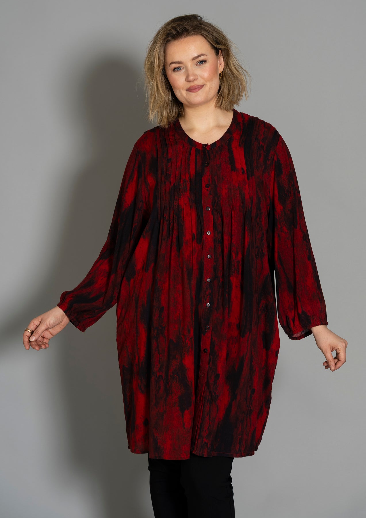 Gozzip - Johanne skyrtukjóll með svörtu og rauðu mynstri. Látlaus með plíseringu að framan, tölur alla leið, langar ermar með teygju og góðum vösum, hægt að nota opinn yfir buxur og topp eða lokaðan eins og kjól eða tuniku.