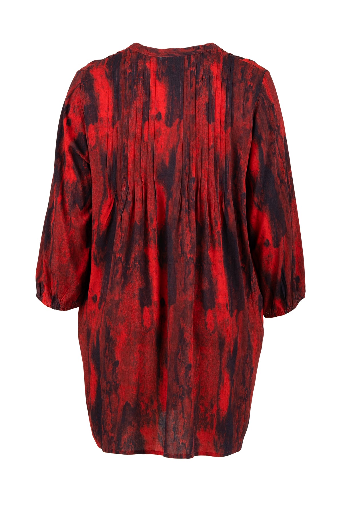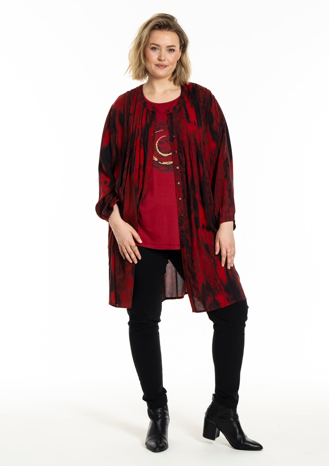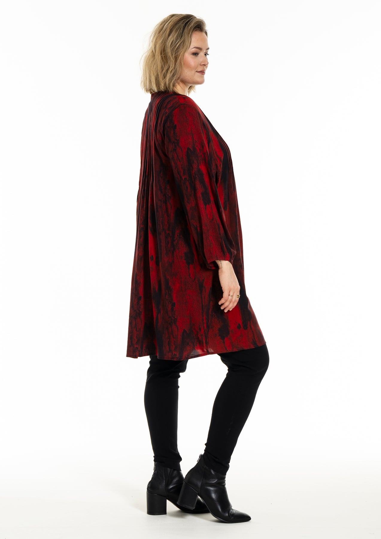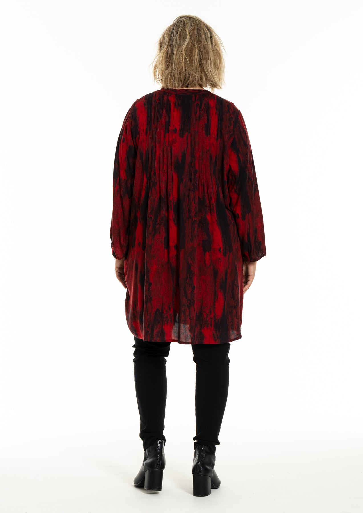 Gozzip - Johanne skyrtukjóll með svörtu og rauðu mynstri. Látlaus með plíseringu að framan, tölur alla leið, langar ermar með teygju og góðum vösum, hægt að nota opinn yfir buxur og topp eða lokaðan eins og kjól eða tuniku.